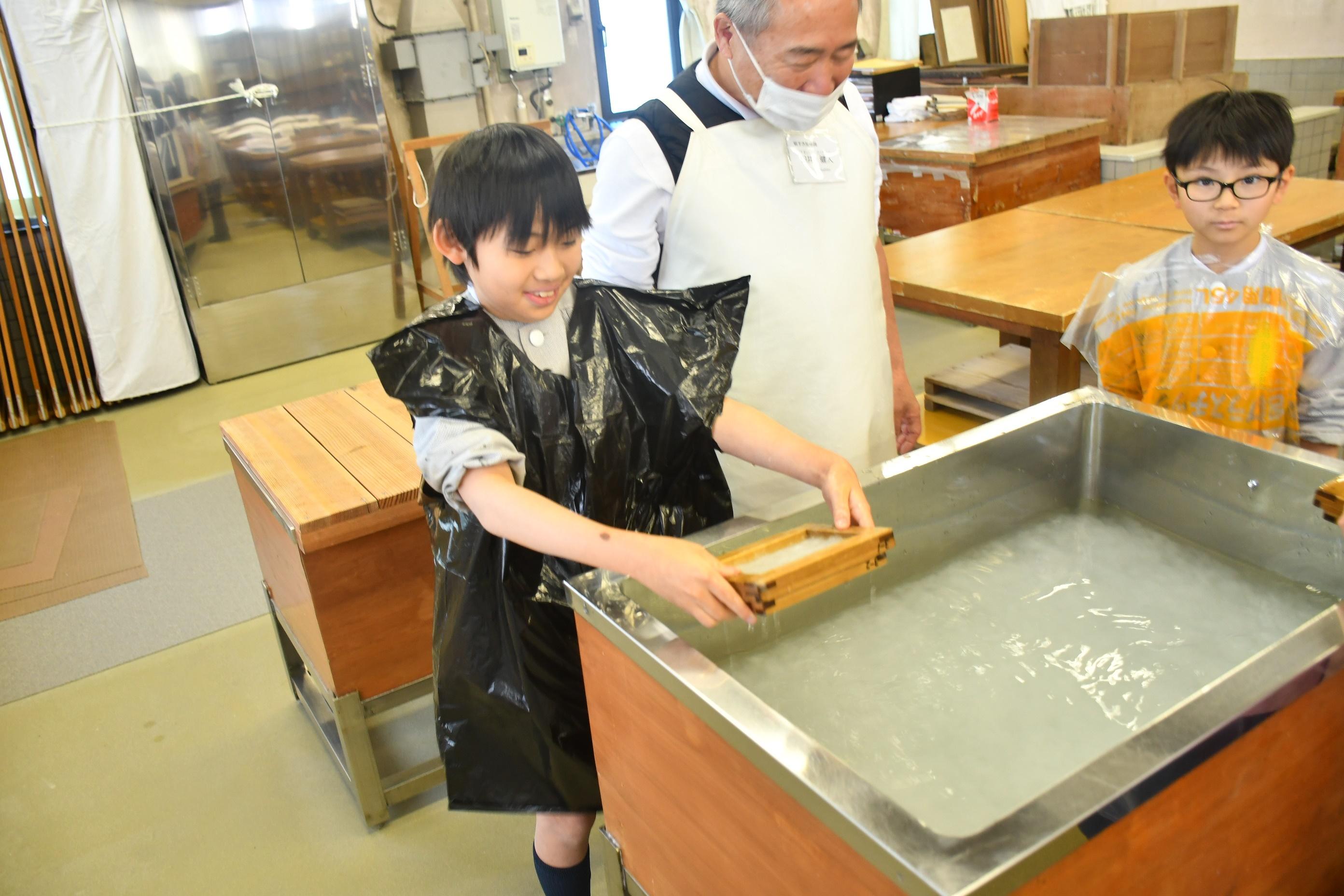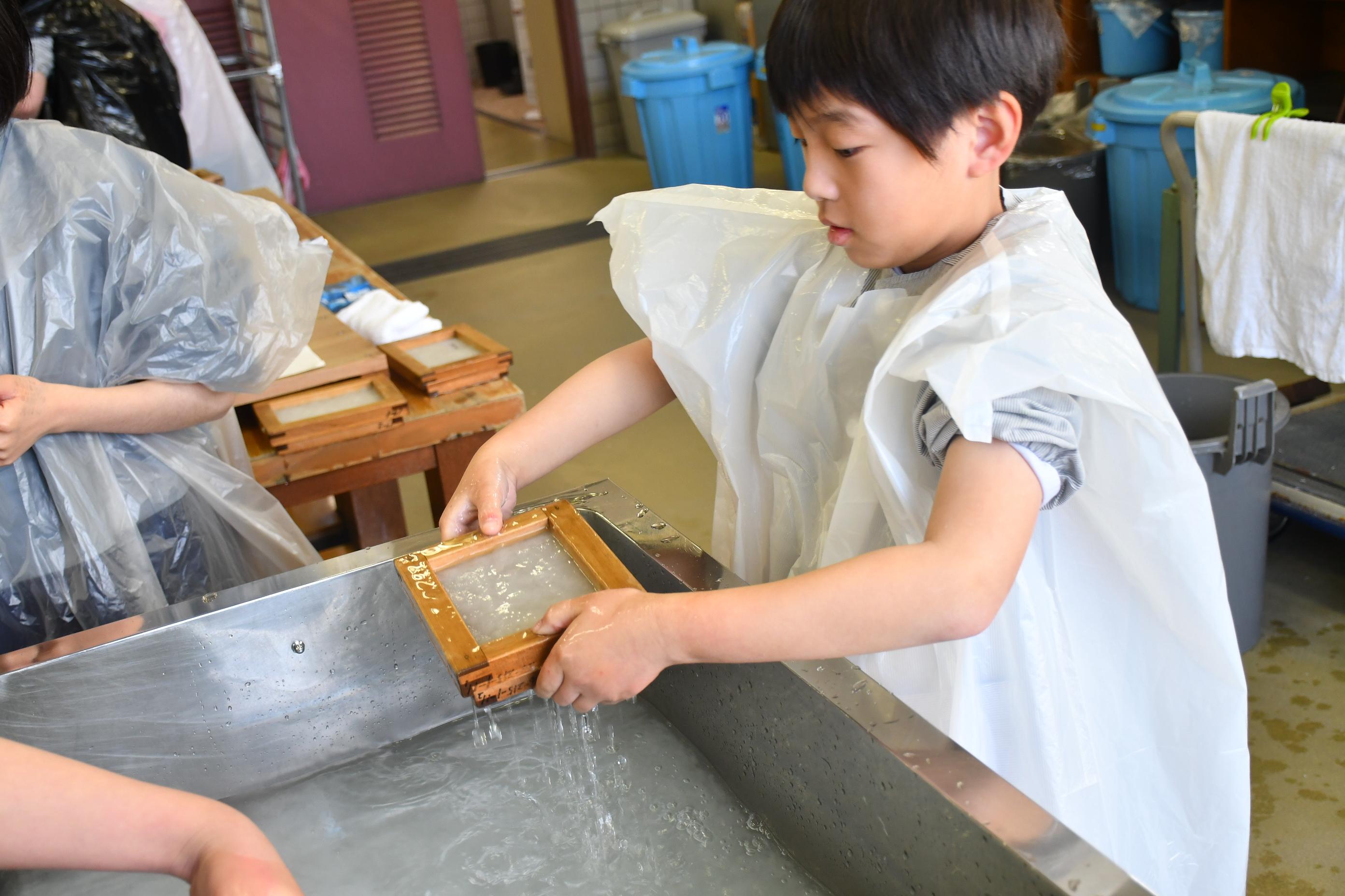 西宮市にある「名塩和紙学習館」へ校外学習に出かけました。到着後、紙すきの実習を体験。すげたという特別な用具を使って、悪戦苦闘しながらも和紙を作りました。はじめは緊張していた子どもたちも、紙すきを終えると達成感からか笑顔がこぼれました。また、ビデオや展示物を閲覧し知識を深めました。実際に体験して本物に触れることで、学びの多い貴重な校外学習となりました。