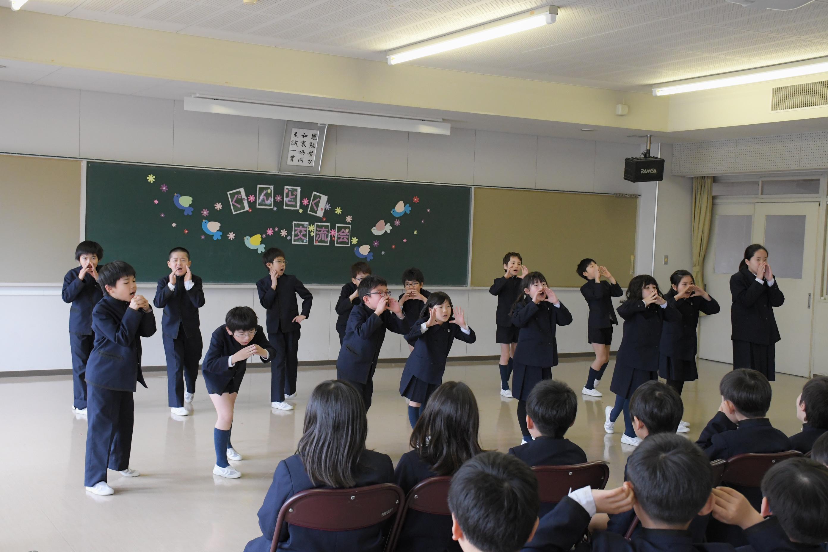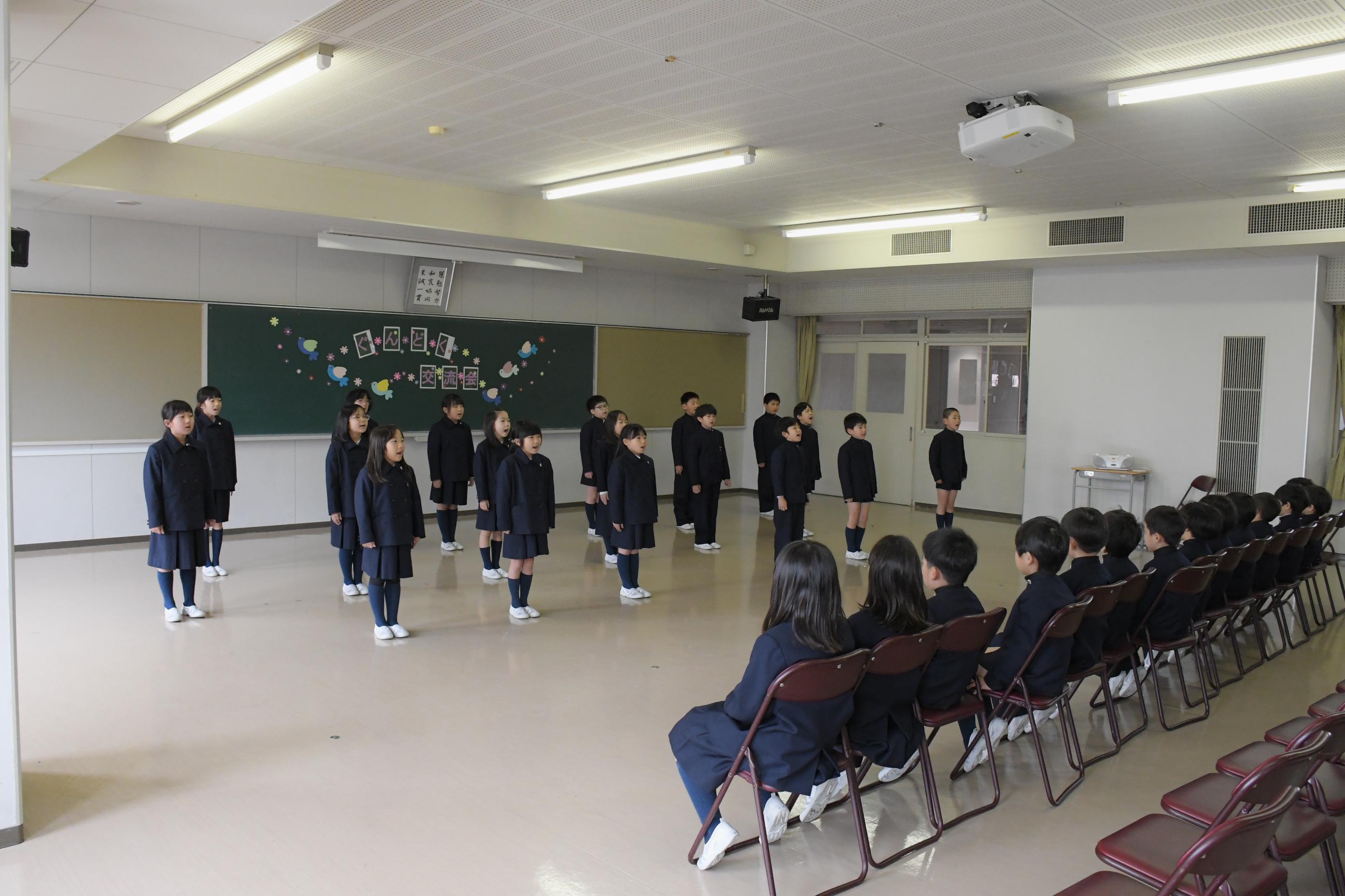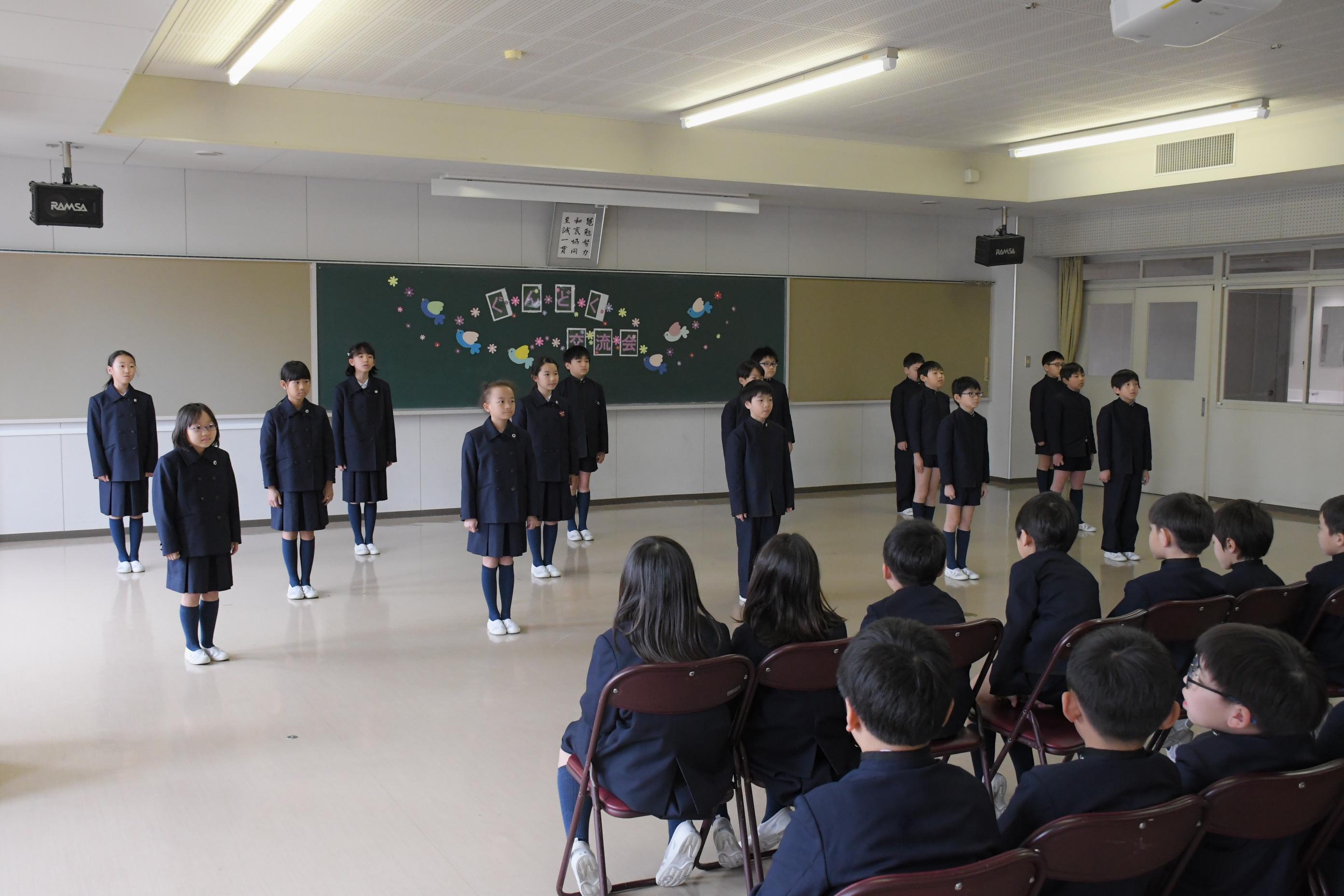1・2・3・4年生で群読交流会を行いました。各学年のカラーが存分に出た発表で、他学年だけでなく、たくさんの先生や卒業生の拍手を受けました。頑張って練習した成果を見せることができ、子どもたちは、満足げな表情を浮かべていました。