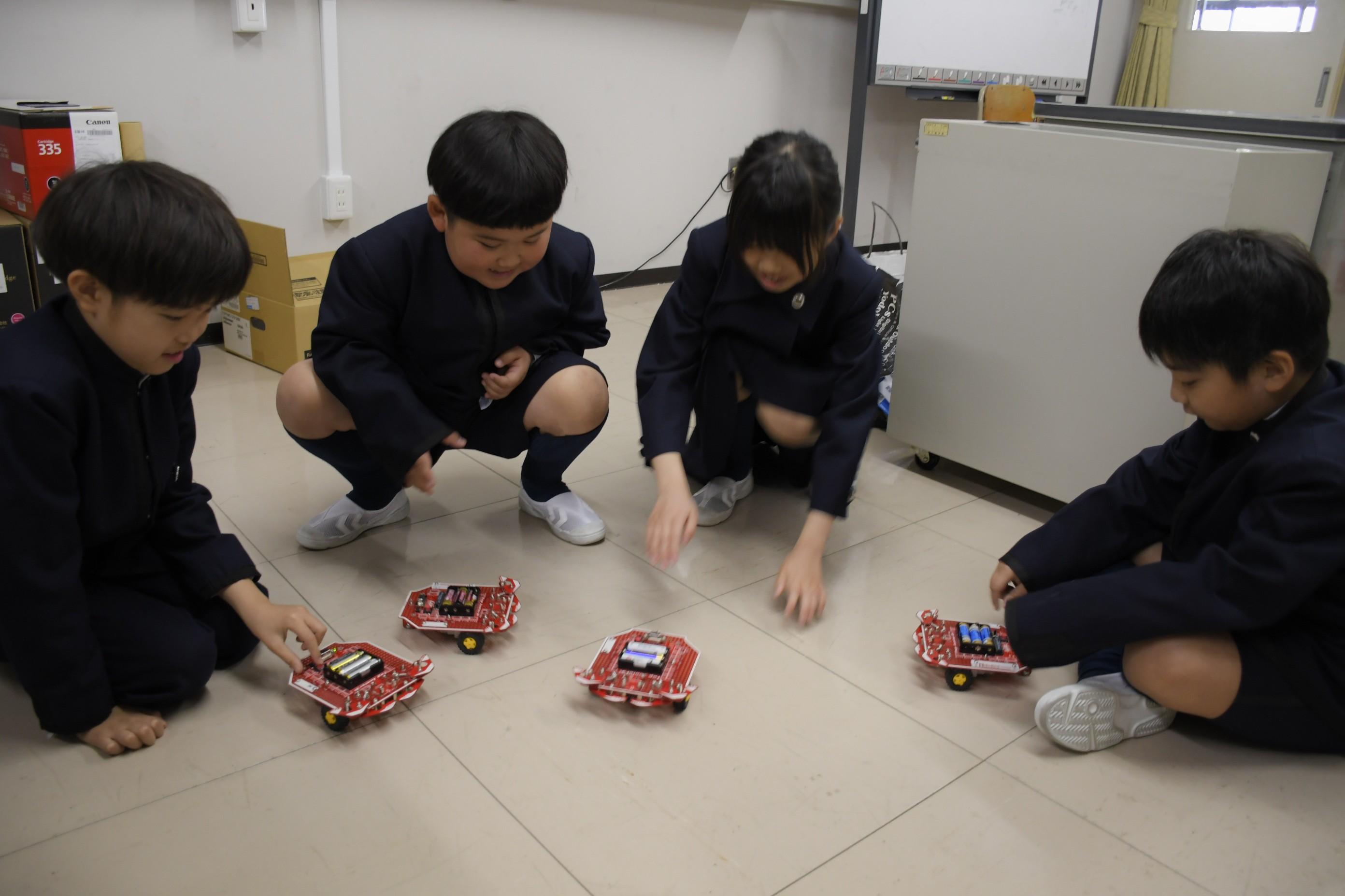 火曜日のアフタースクールは、ロボットプログラミング。自分で考えて作ったプログラミングでロボットを動かします。思い通りにいかなくても何度も挑戦する気持ちや知的好奇心を育みます。