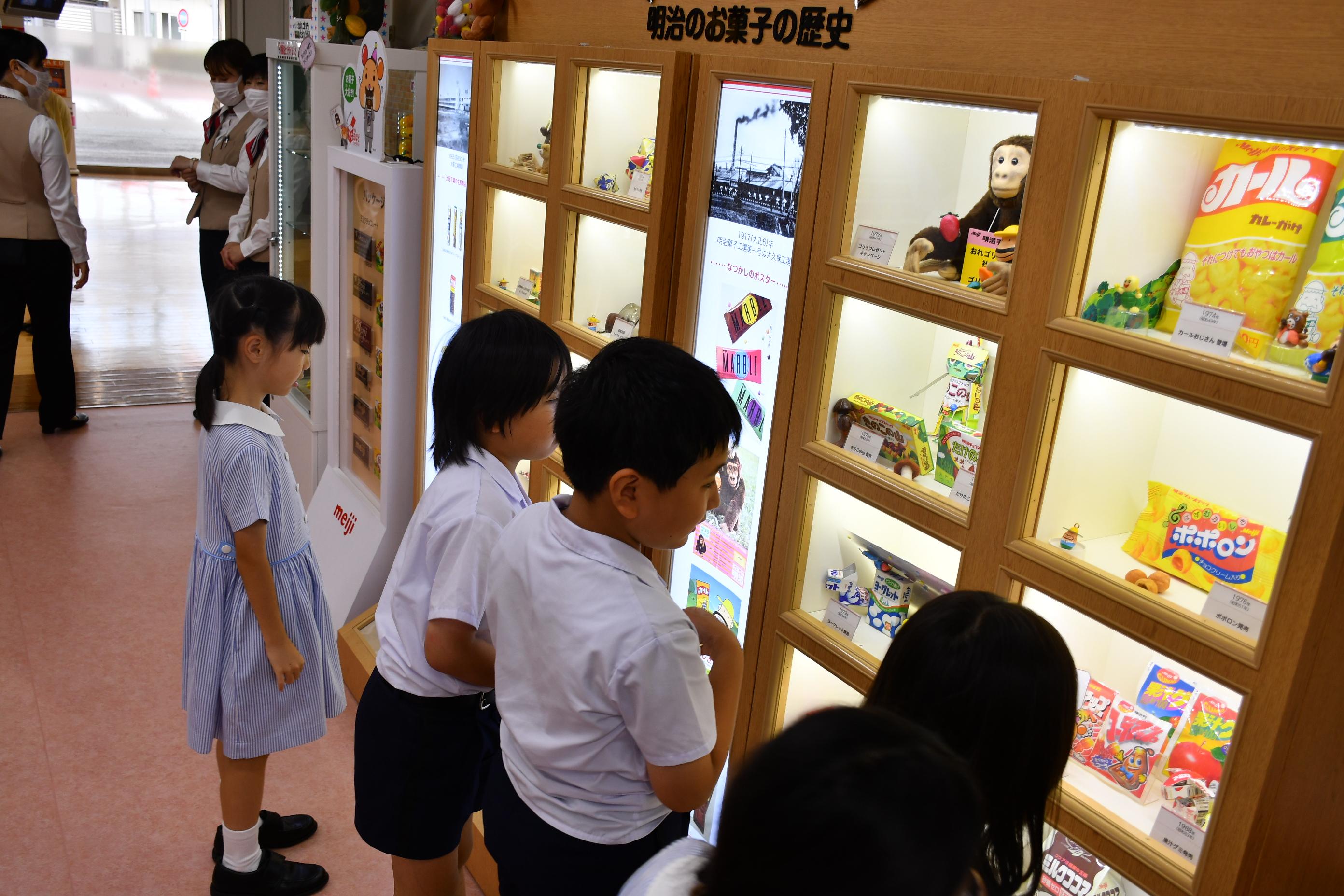「きのこの山」「たけのこの里」の製造工程を見学し、明治の「おいしさ・楽しさ・健康・安心」を大切にした取り組みについて話を聞きました。授業で、他の食品工場のバーチャル見学をしましたが、実際に機械が動いている様子やその音に子どもたちはとても興奮していました。