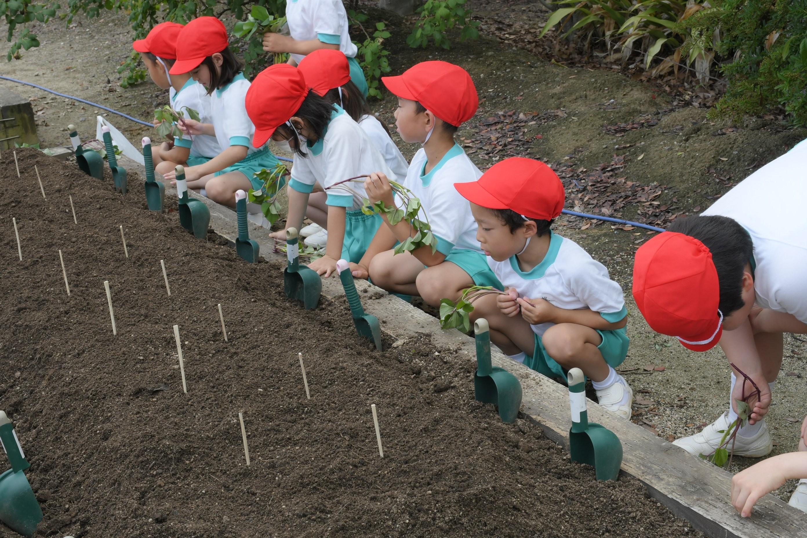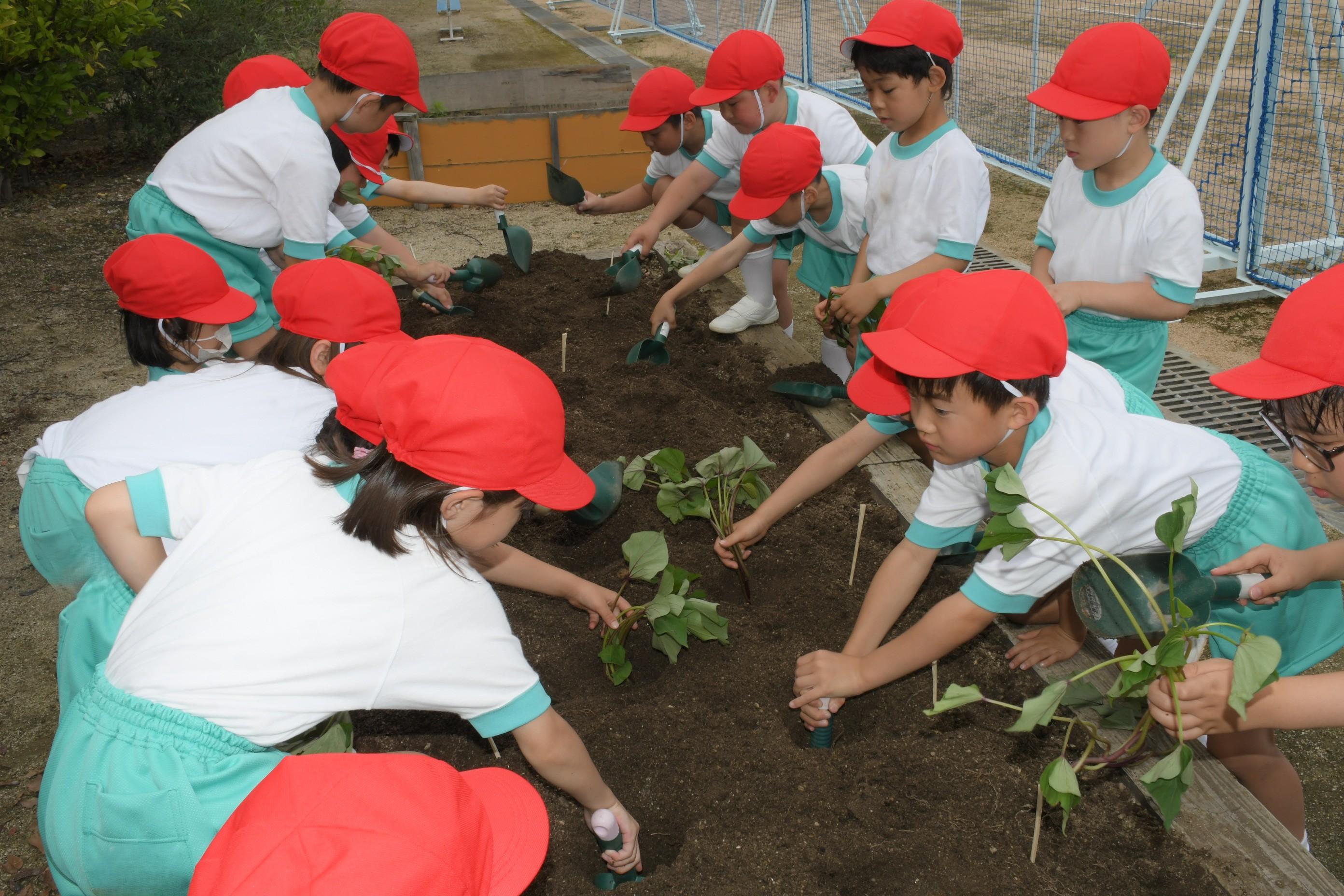 1年生は、さつまいもの苗を植えました。においを嗅いだり、触ったり、じっくり見たり、しっかり観察をしてから植えました。
