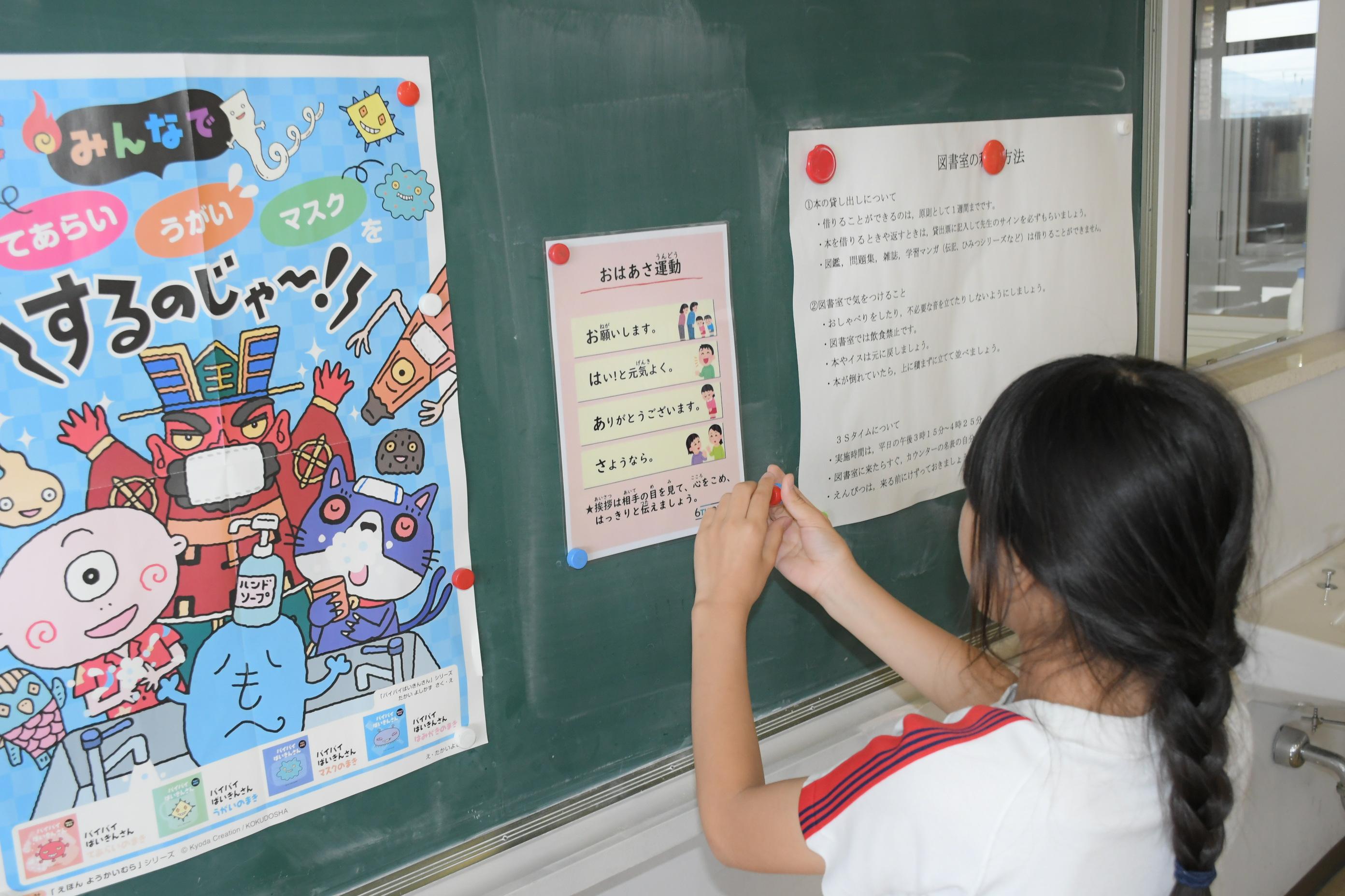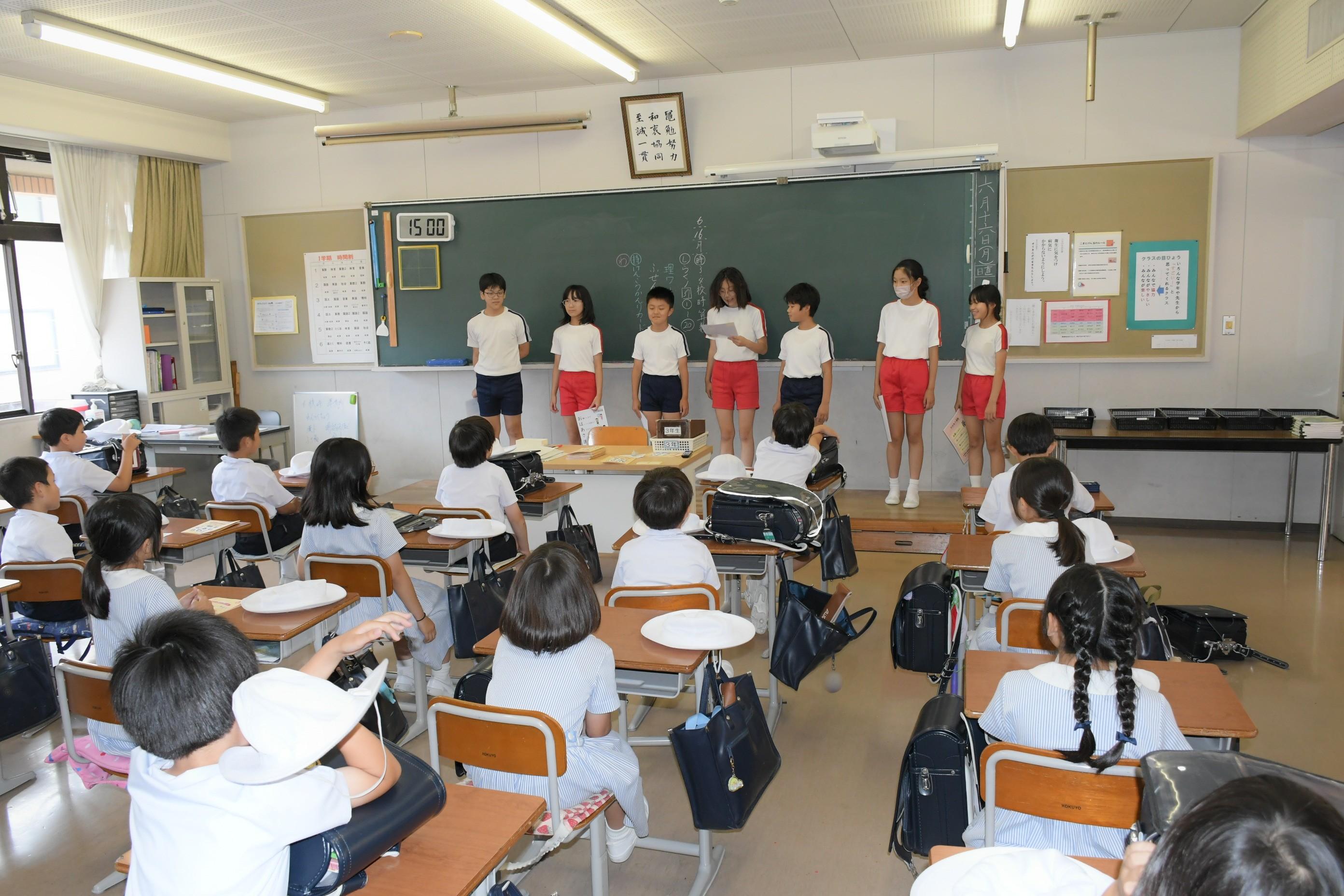 本校のコミュニケーションの標語である「おはあさ」。6年生はこの「おはあさ」運動を進めていくためのポスターを制作しました。ポスターの内容や構図に加えて、貼る場所も考えました。また、他学年に向けて体育館や教室であいさつ指導を行いました。6年生がお手本を示していけるよう期待しています。