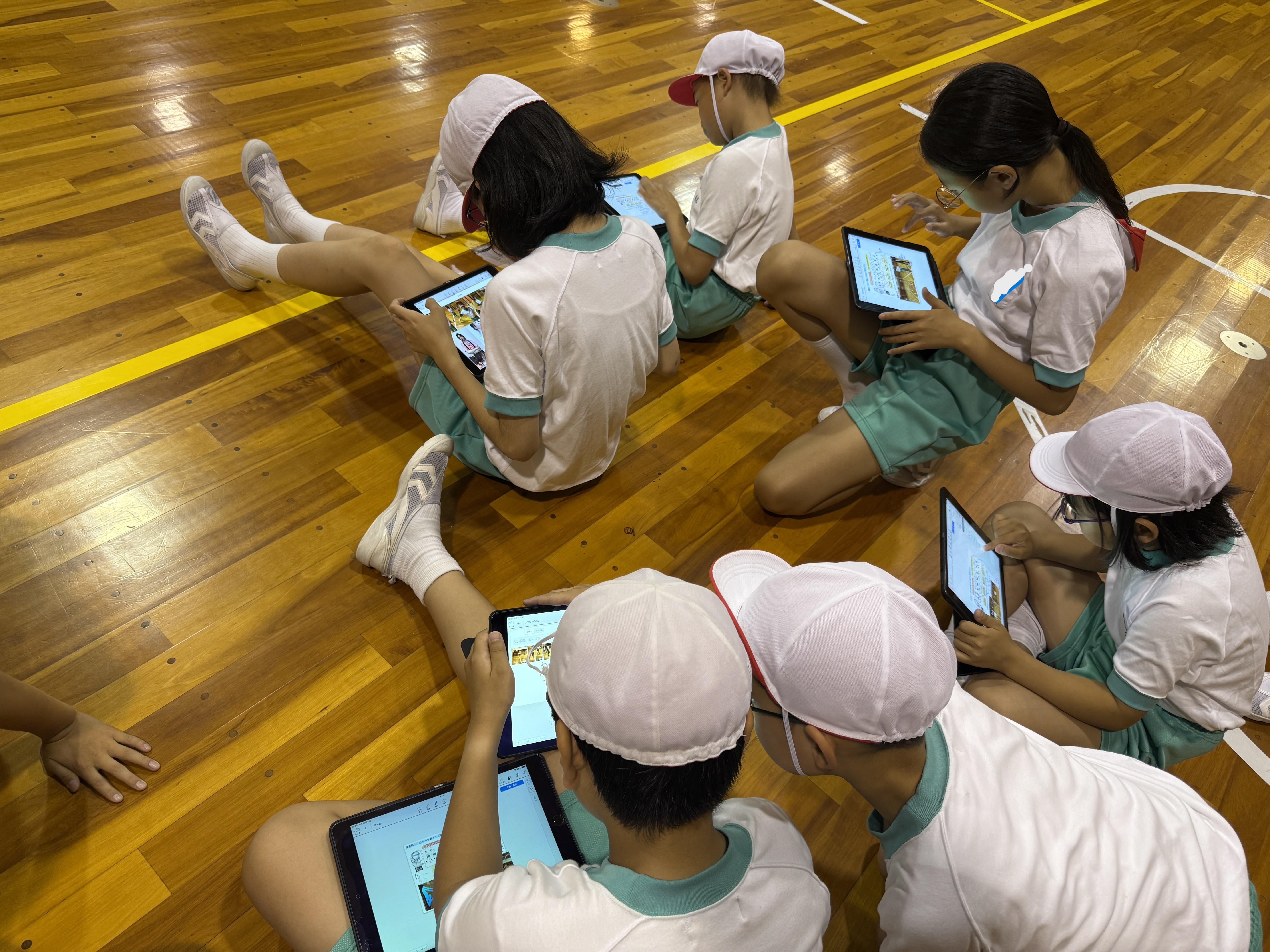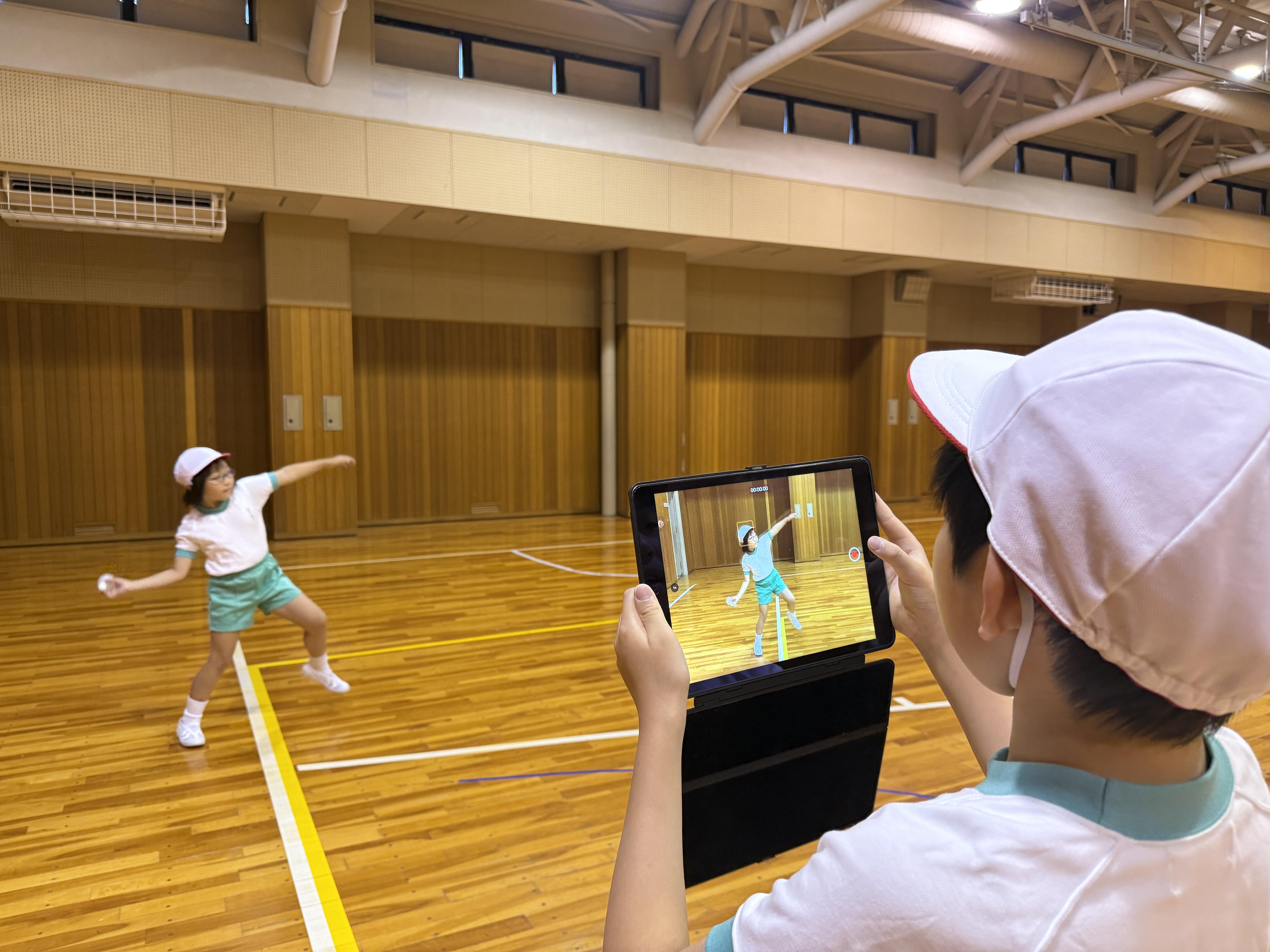 5年生の体育では、小さなボールの投げ方を学びました。2人1組でタブレット撮影し、自分の投げ方を研究。先生のアドバイスやシャトル練習を経て、投げ方を改善しました。