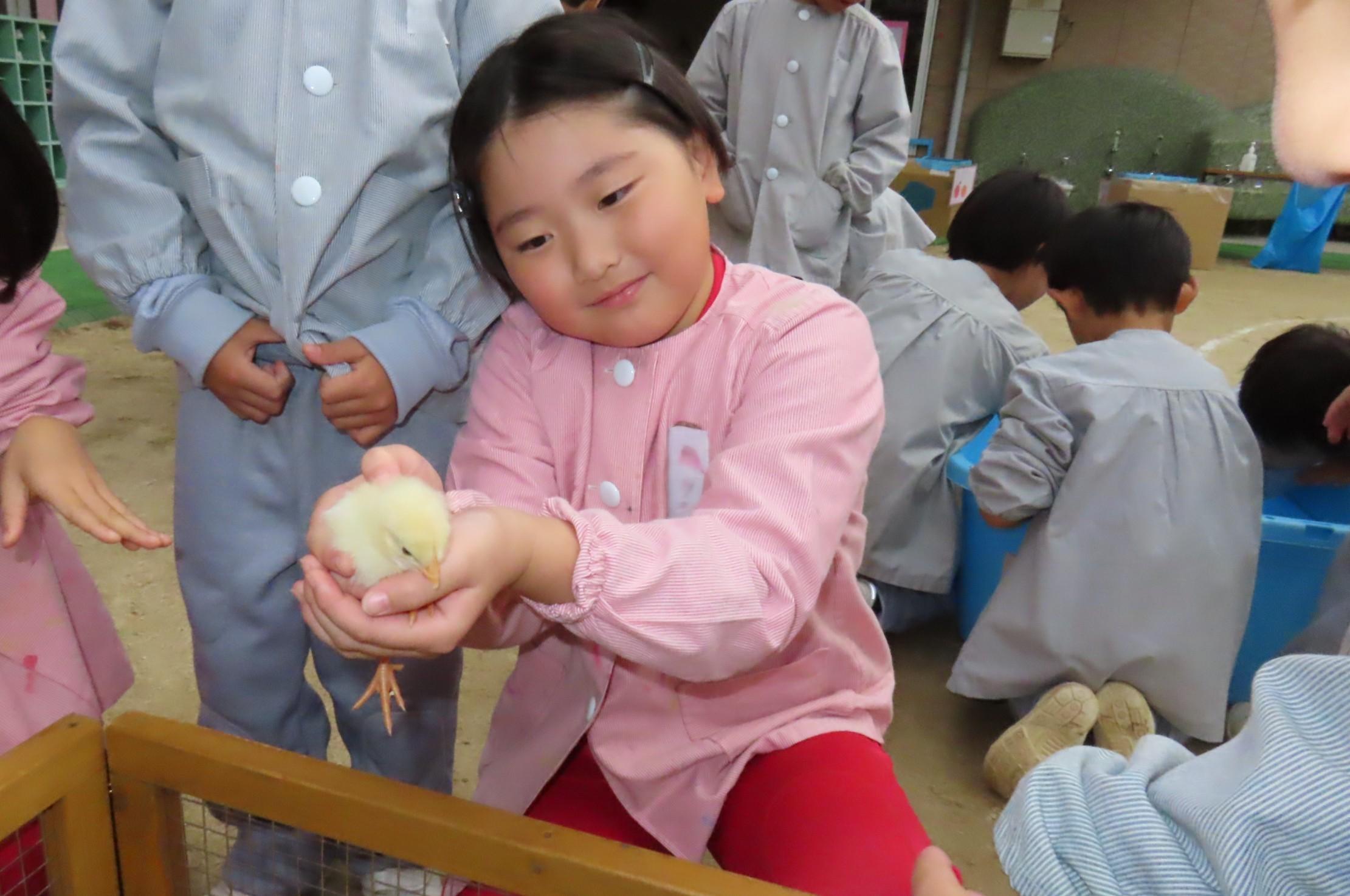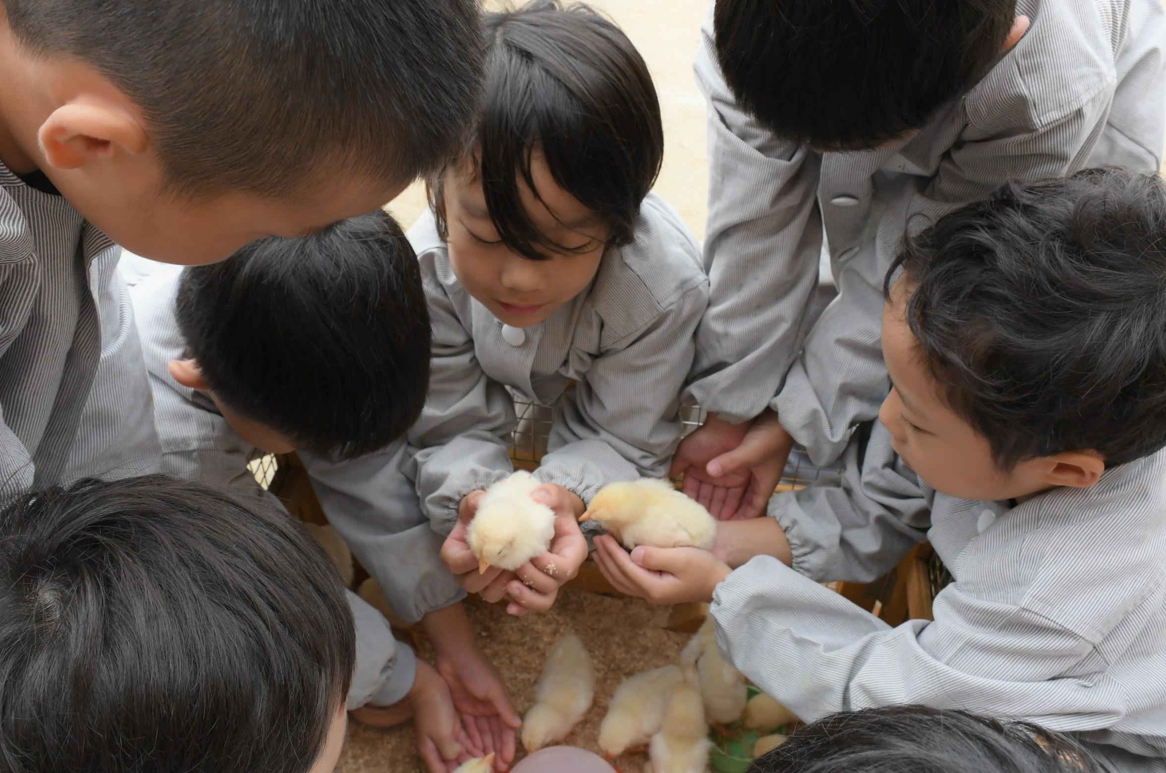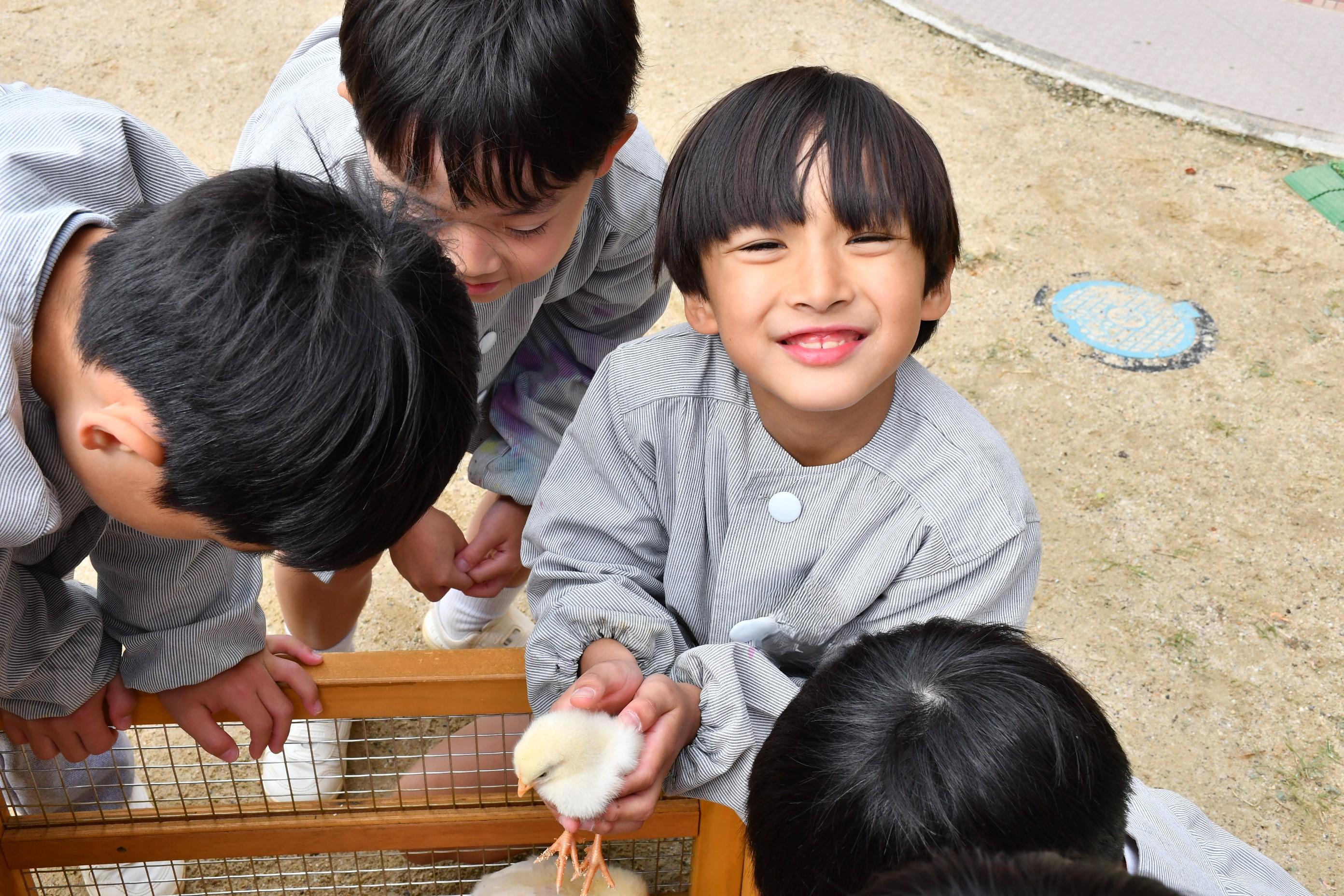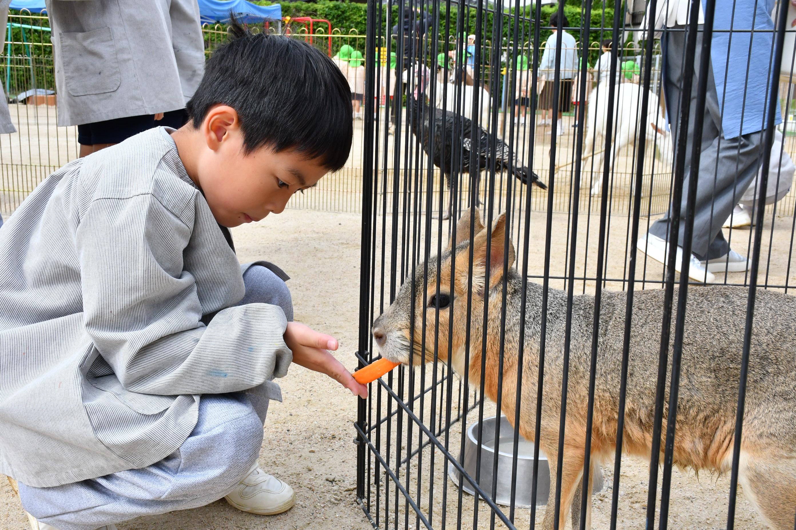 甲子園学院幼稚園の園庭にふれあい動物村がやってきました。ウサギやヒツジ、ヤギなど、たくさんの動物が来てくれました。