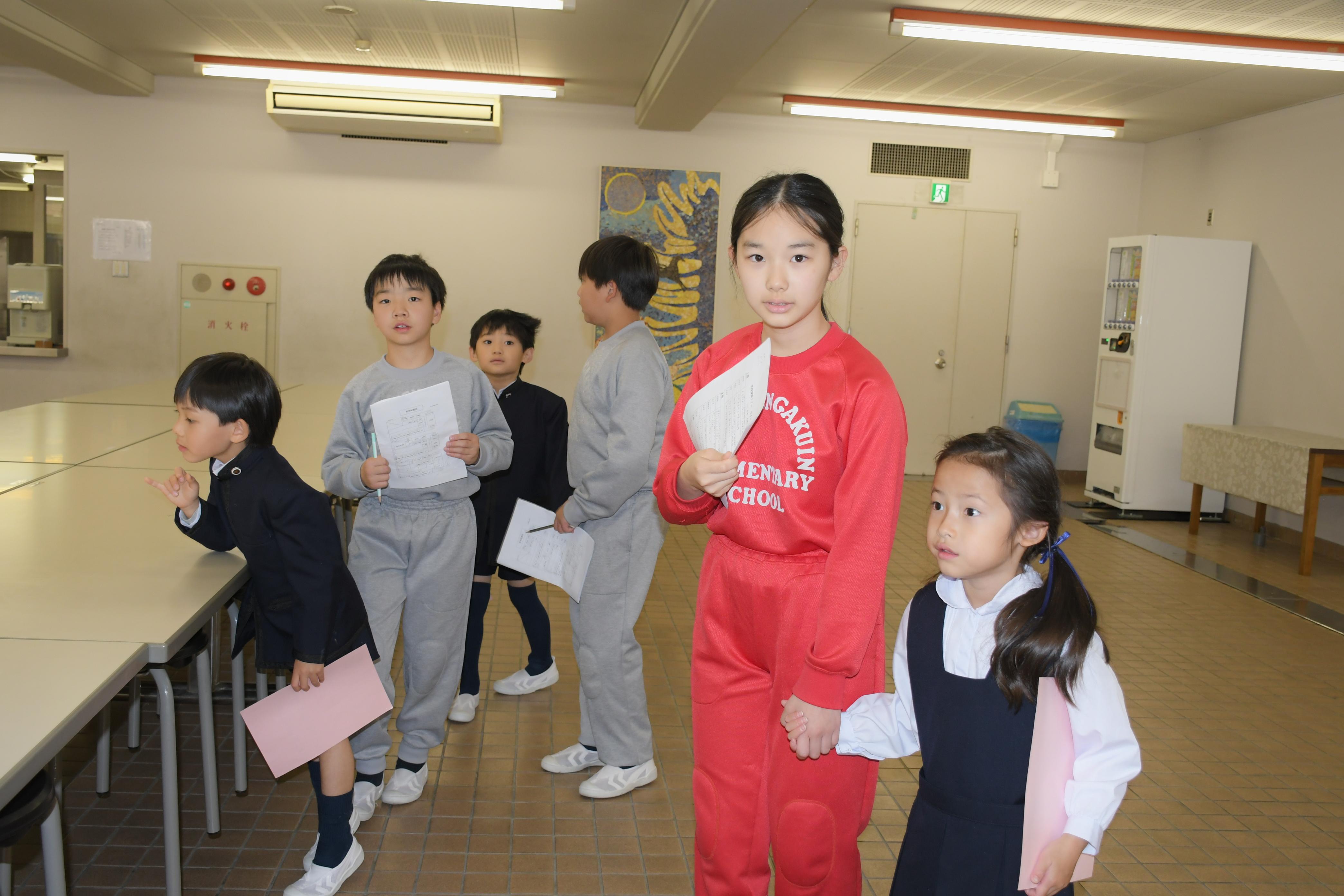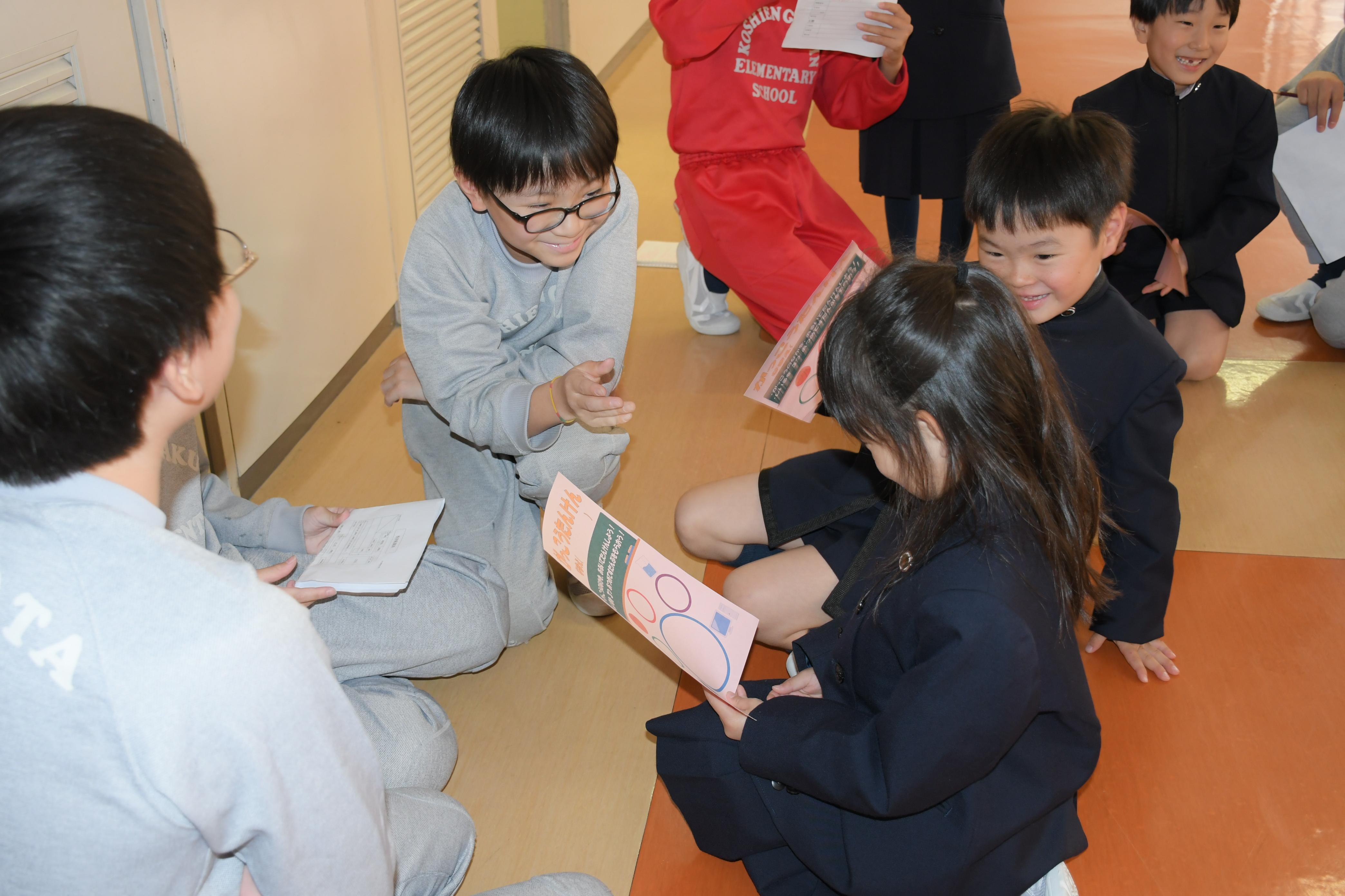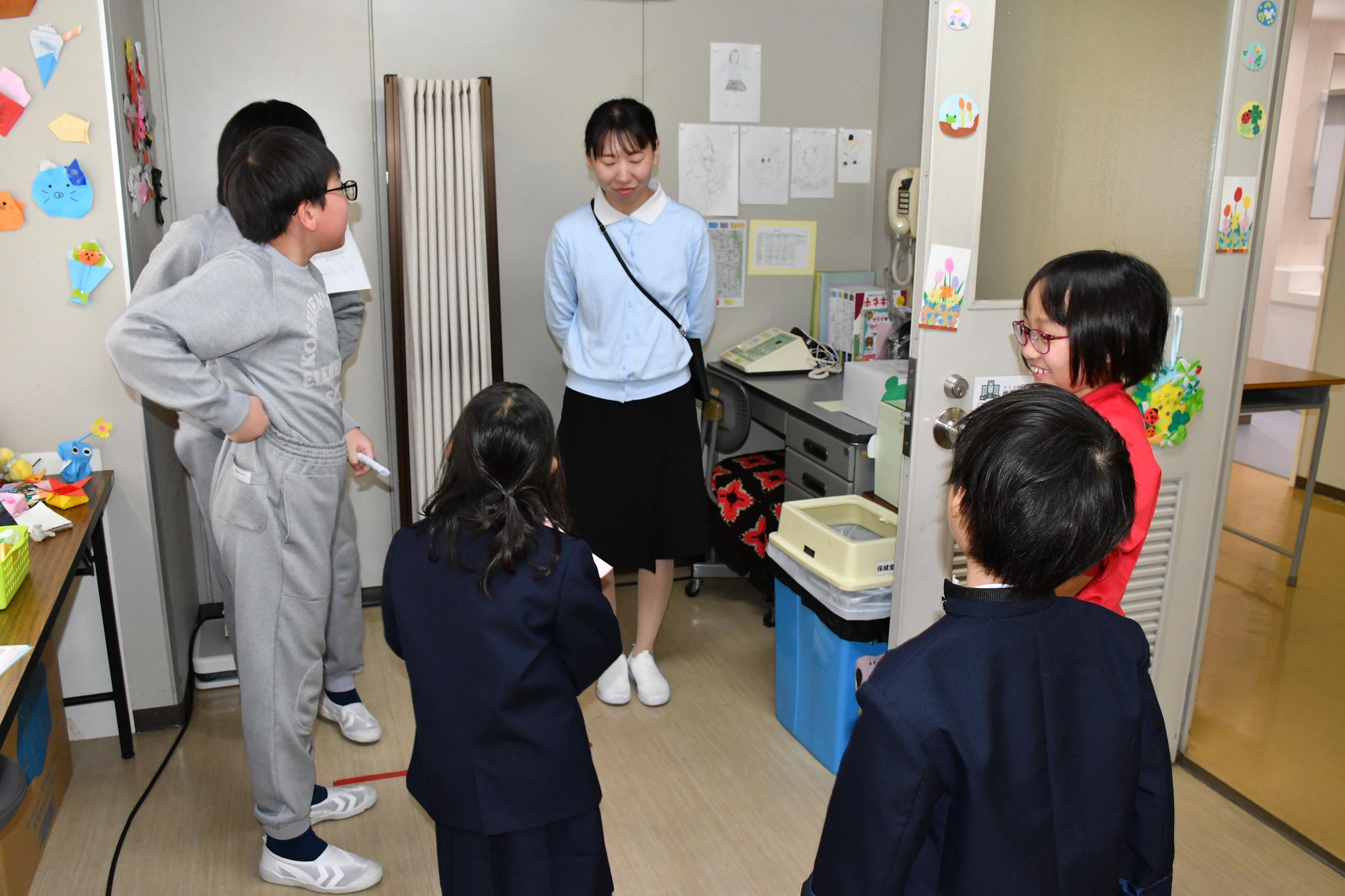 6年生から1年生へ学校探検の説明