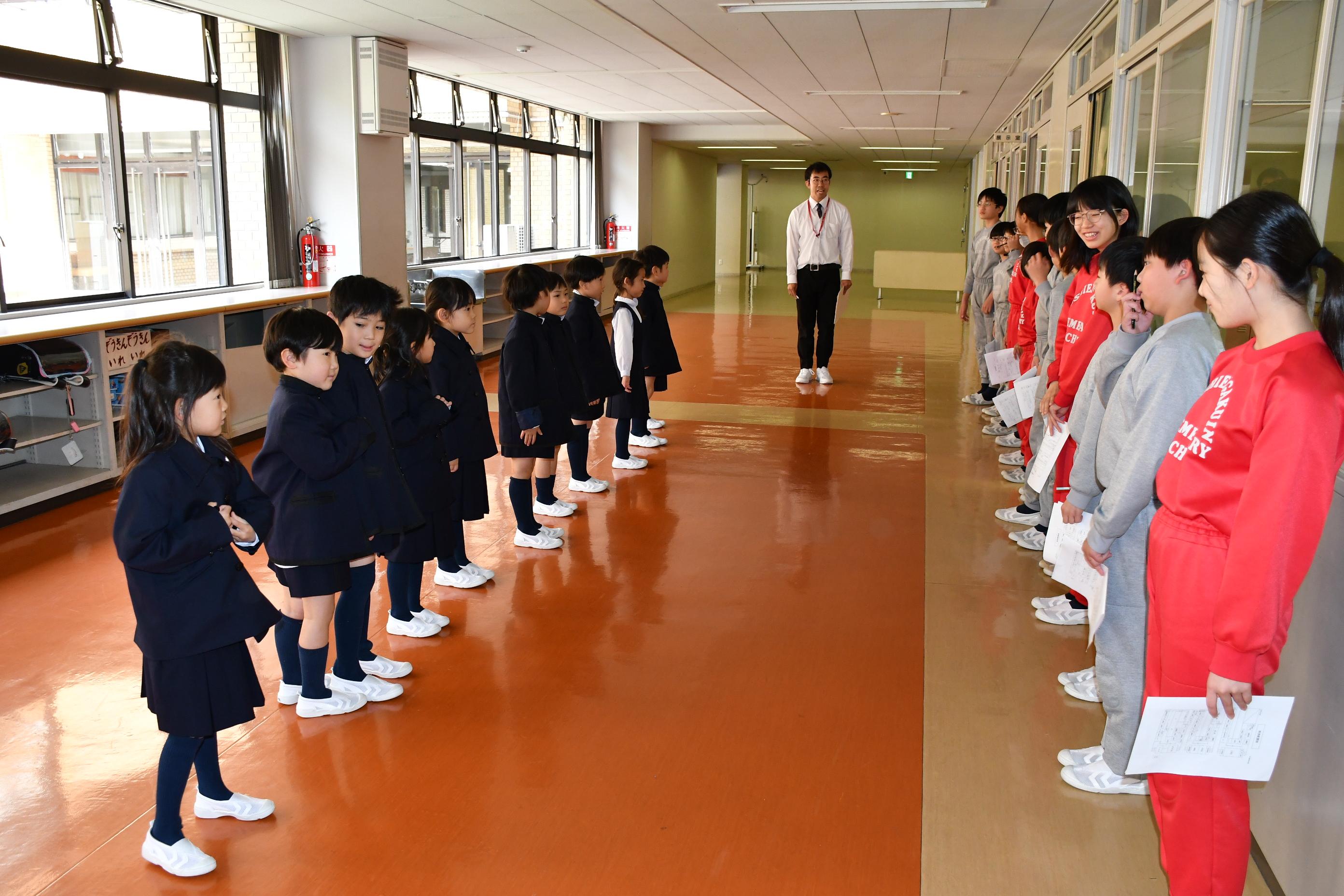 1年生・6年生で班を組み、学校探検を行いました。子どもたちは少し緊張した様子でスタート。活動中、優しく手を引き最高学年として頼れる姿を見せた6年生。初めて入る教室に興味津々の1年生。楽しく学校探検をする中で、親睦を深める良い機会となりました。