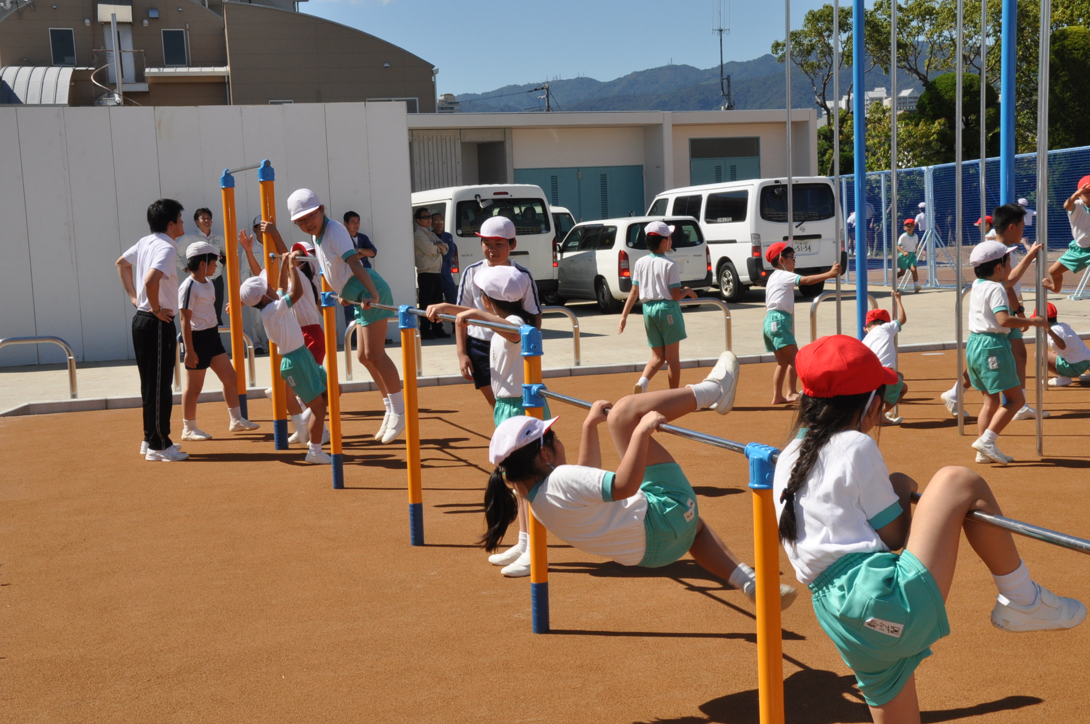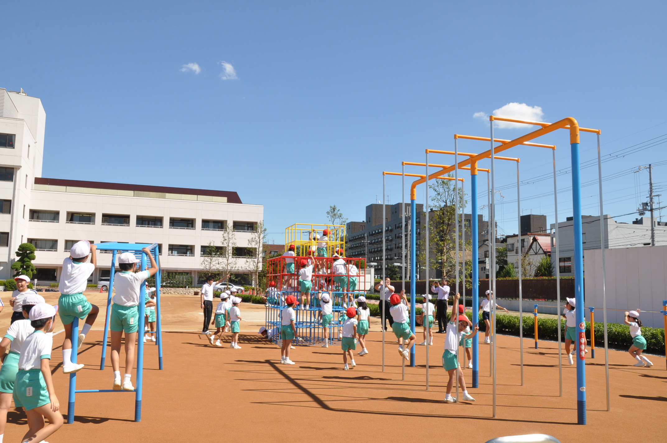 グラウンドが新しくなりました! [投稿日:2018年09月28日] 昨年から行われていましたグラウンドの工事が本日ほぼ完了しました。遊具や倉庫、学級園、トイレなどが新設され子どもたちは大喜びでした。校長先生から、遊具やトイレなどの使い方や安全面の話を聞いたあと、早速遊具を使って遊びました。遊具の下には、弾力性のあるゴムチップが全面に敷かれ、安心して活動できます。 一覧へ戻る