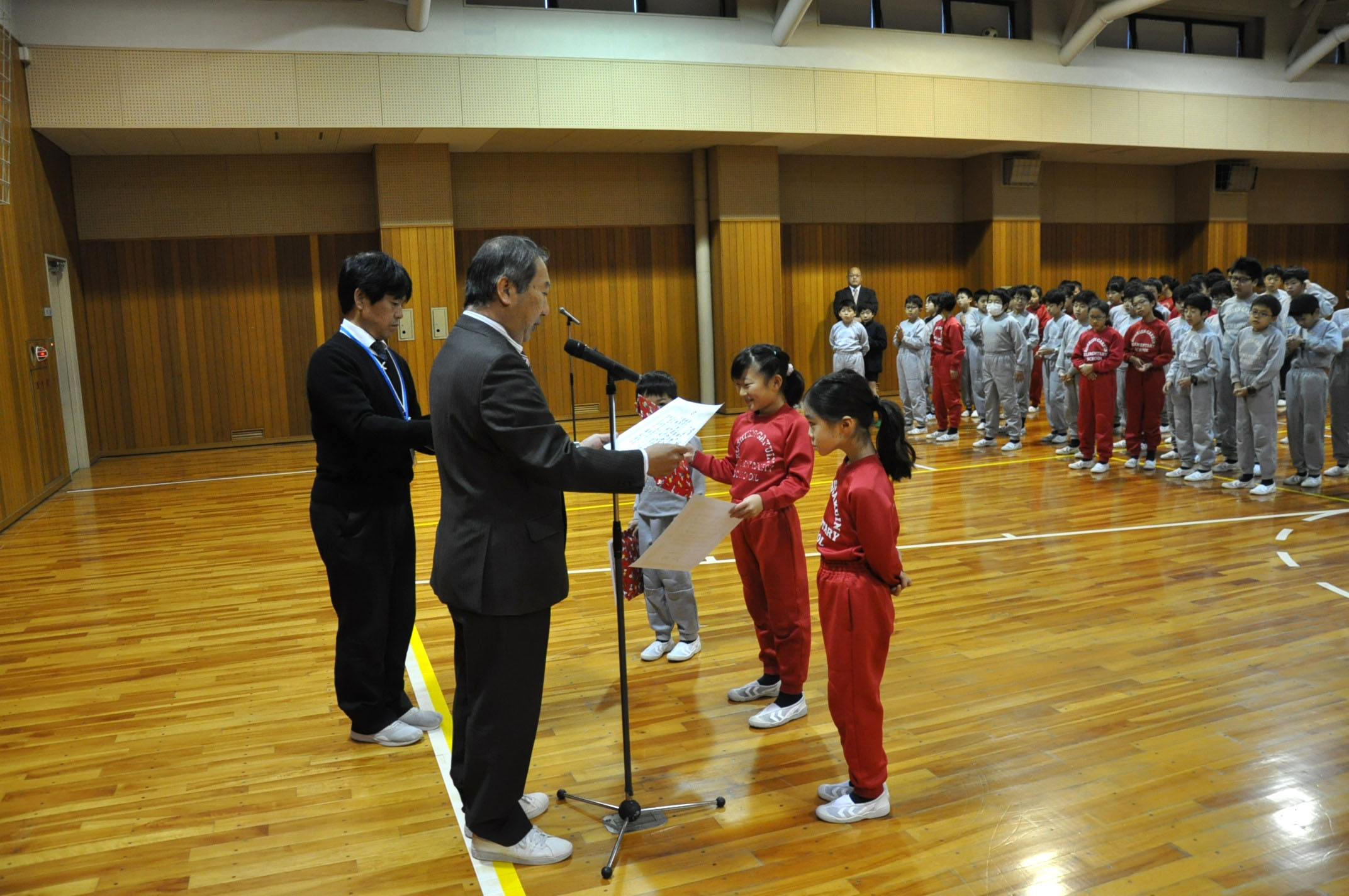 平成30年11月26日(月),朝の児童朝礼で,私学の書展に出展された3名の表彰を行いました。
