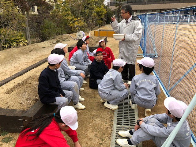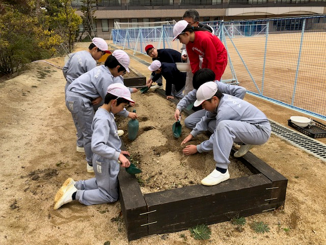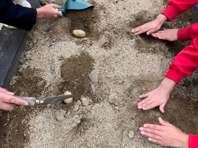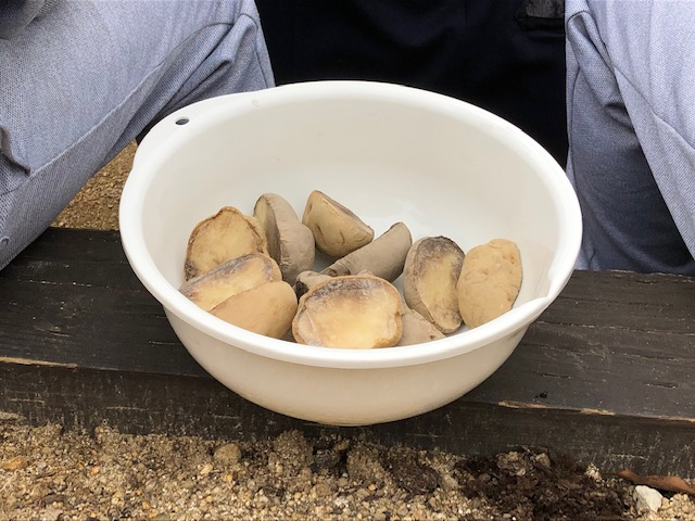 学級園にジャガイモの種芋を植え付けました。収穫が楽しみです。
