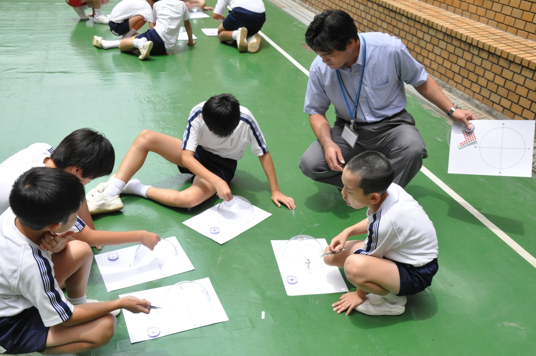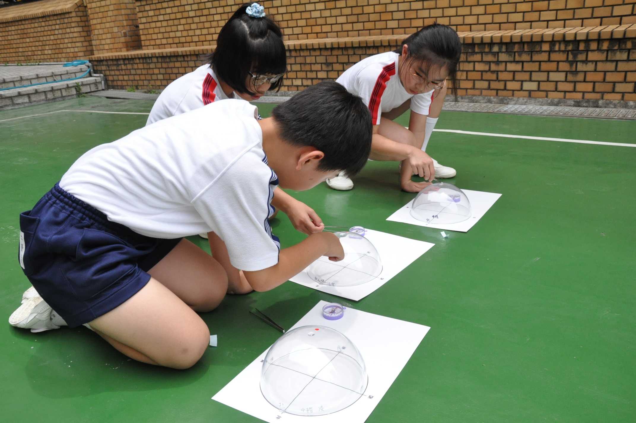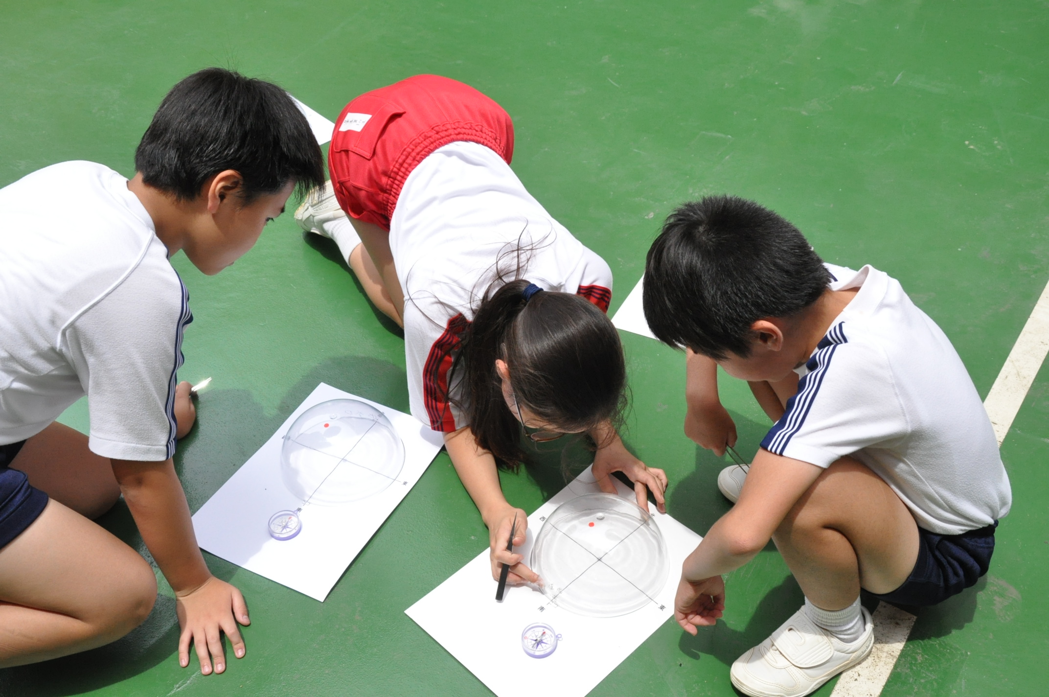 中庭で透明半球を使って太陽の動きを記録しました。
