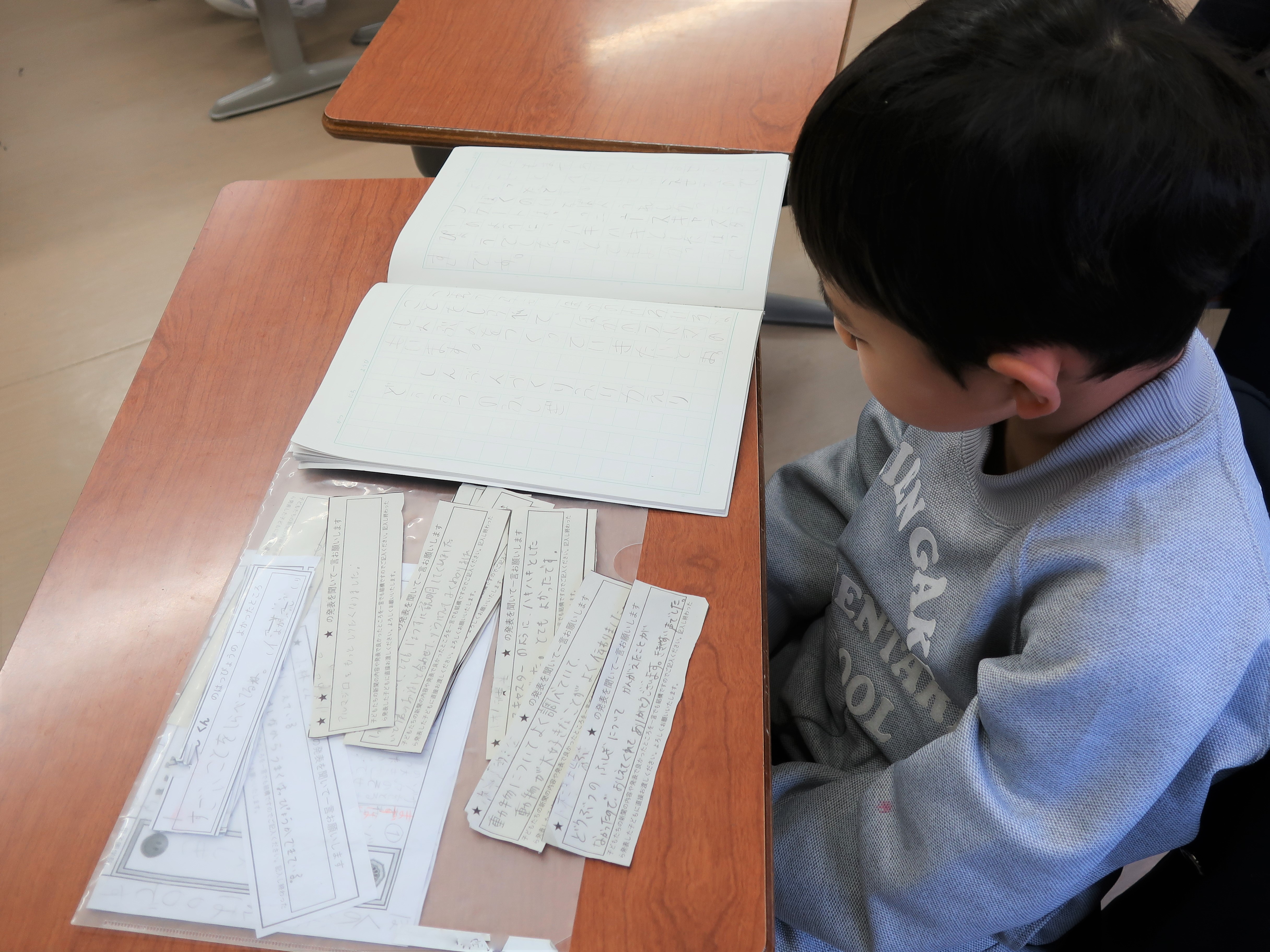 参観後の振り返りの授業では、保護者の方に記入していただいたアンケートを読み、これまでの活動を振り返りました。