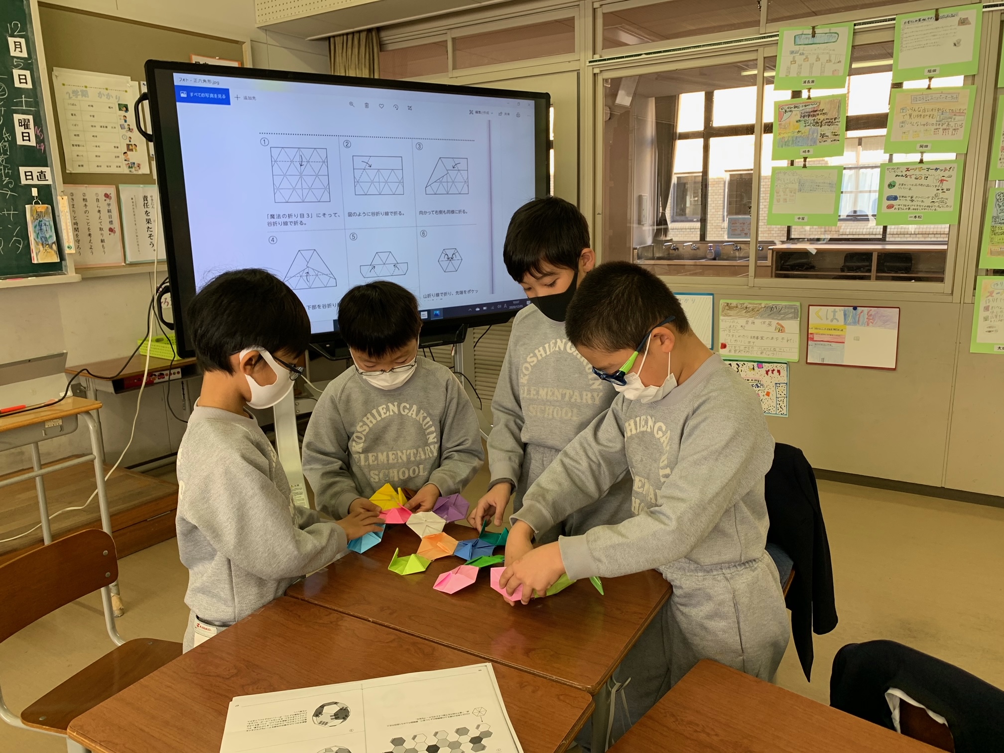 また、正六角形だけではなく、すき間に正五角形が隠れていることも自分たちで見つけ、「先生、正五角形を12個作りたいので折り方を教えてください。」と意欲的に発言する声もあがりました。