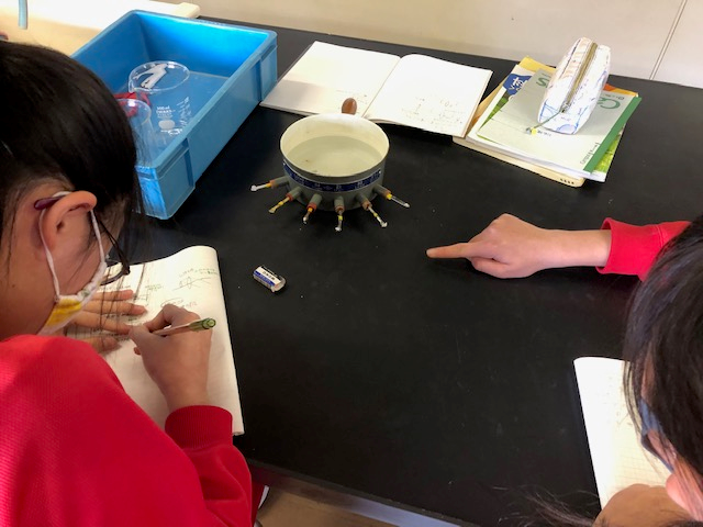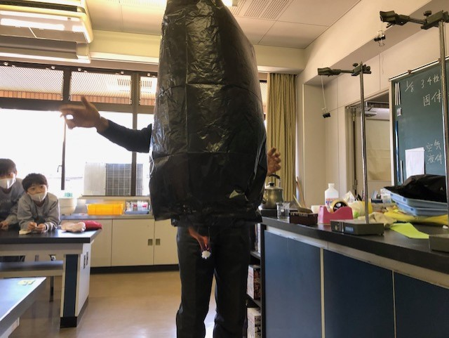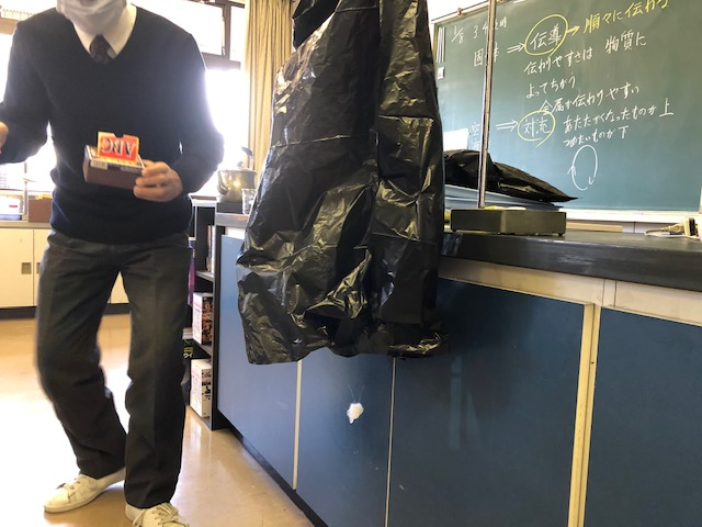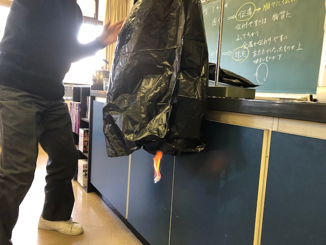 熱伝導の実験。金属など固体での伝導率を調べたあと、熱気球の仕組みを利用して、理科室でポリ袋を飛ばしました。