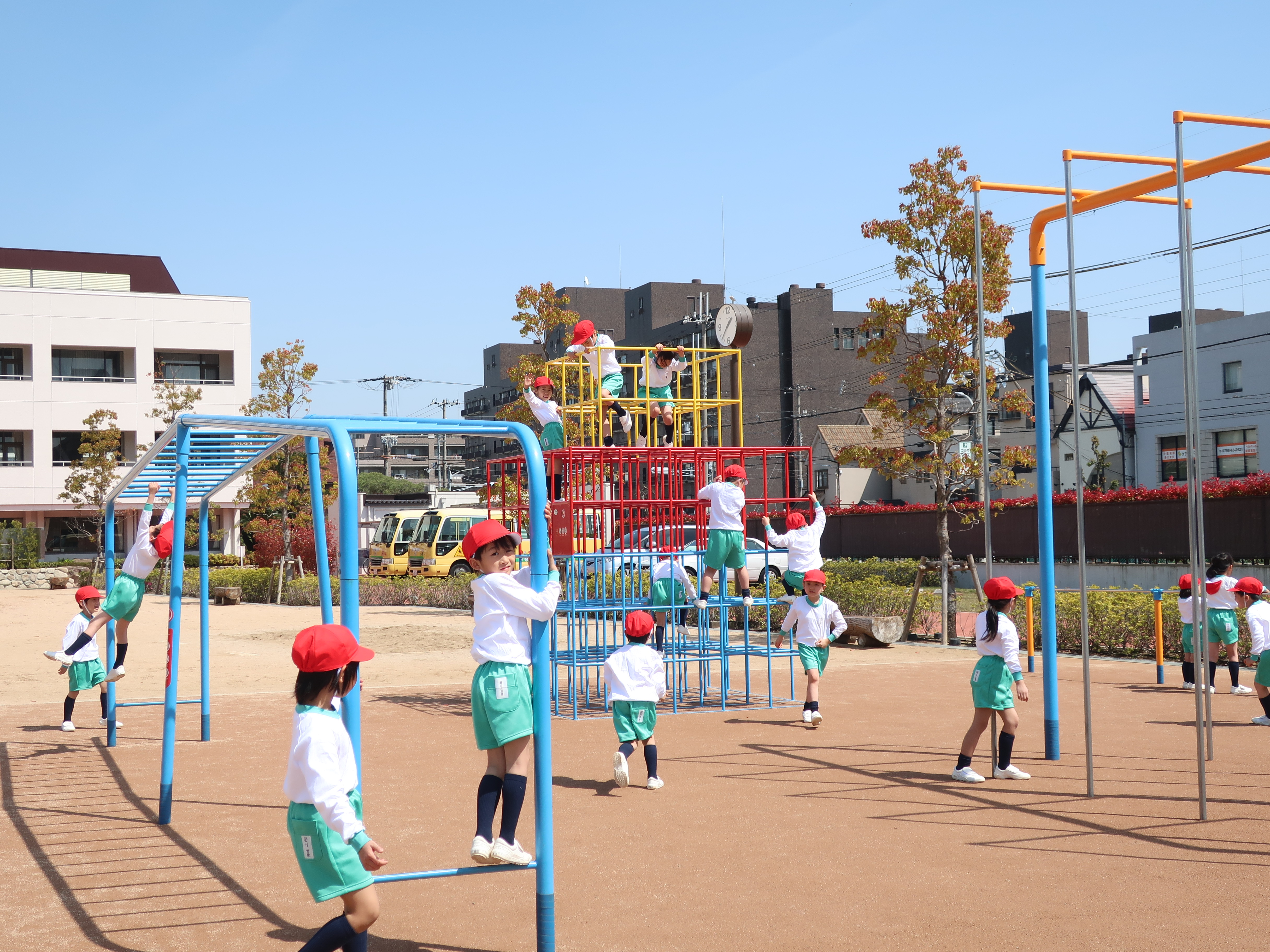 お昼休みには上級生と一緒に運動場へ行き、遊具やグラウンドで思いっきり体を動かしました。