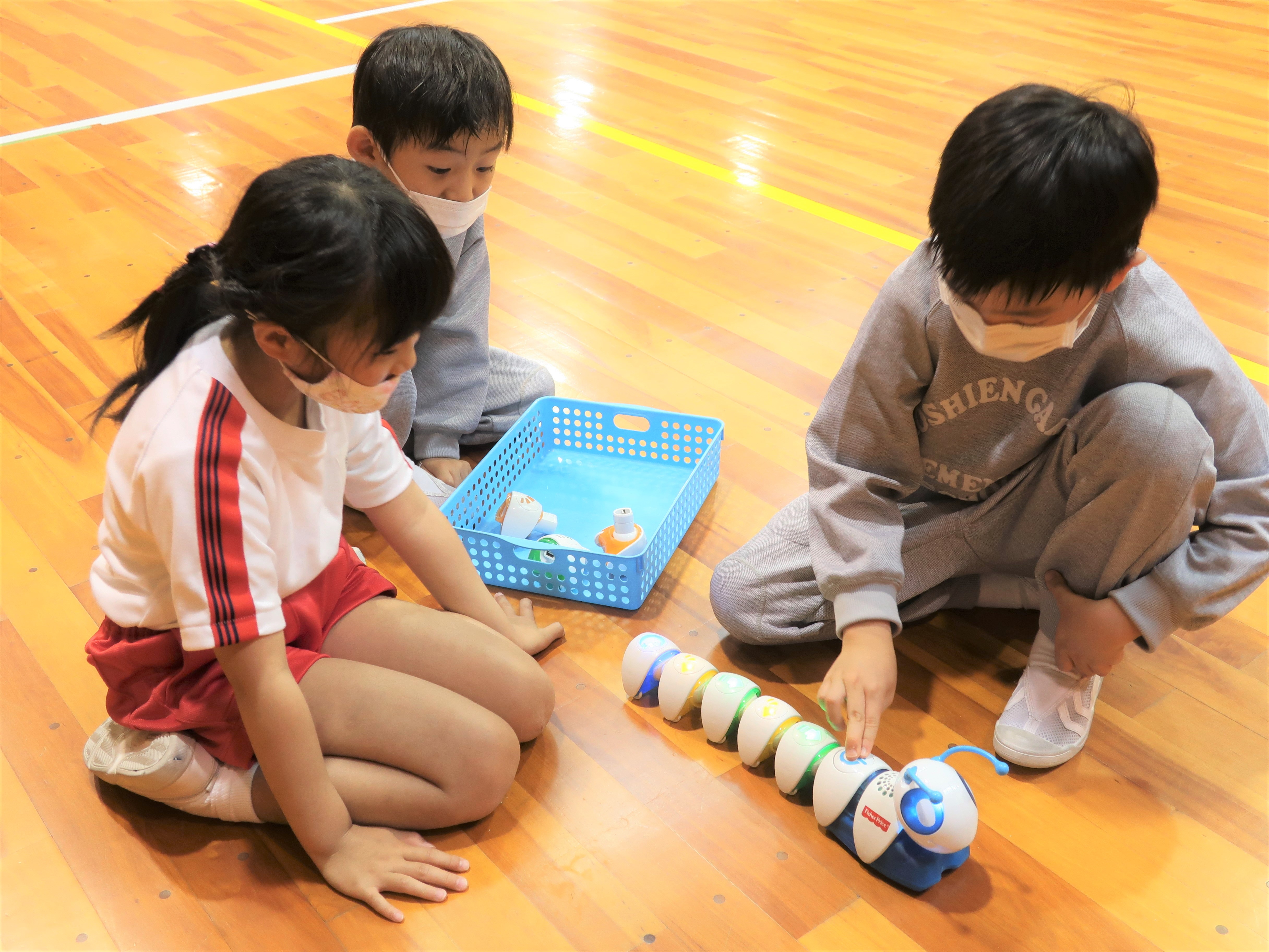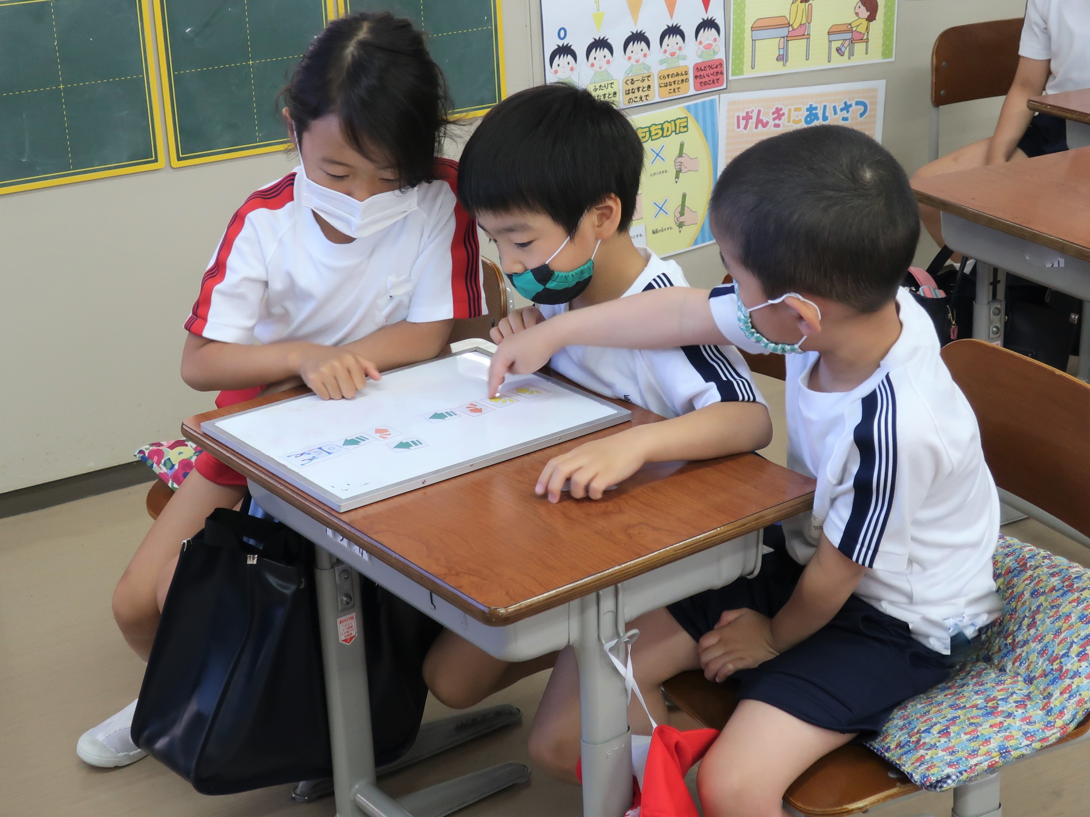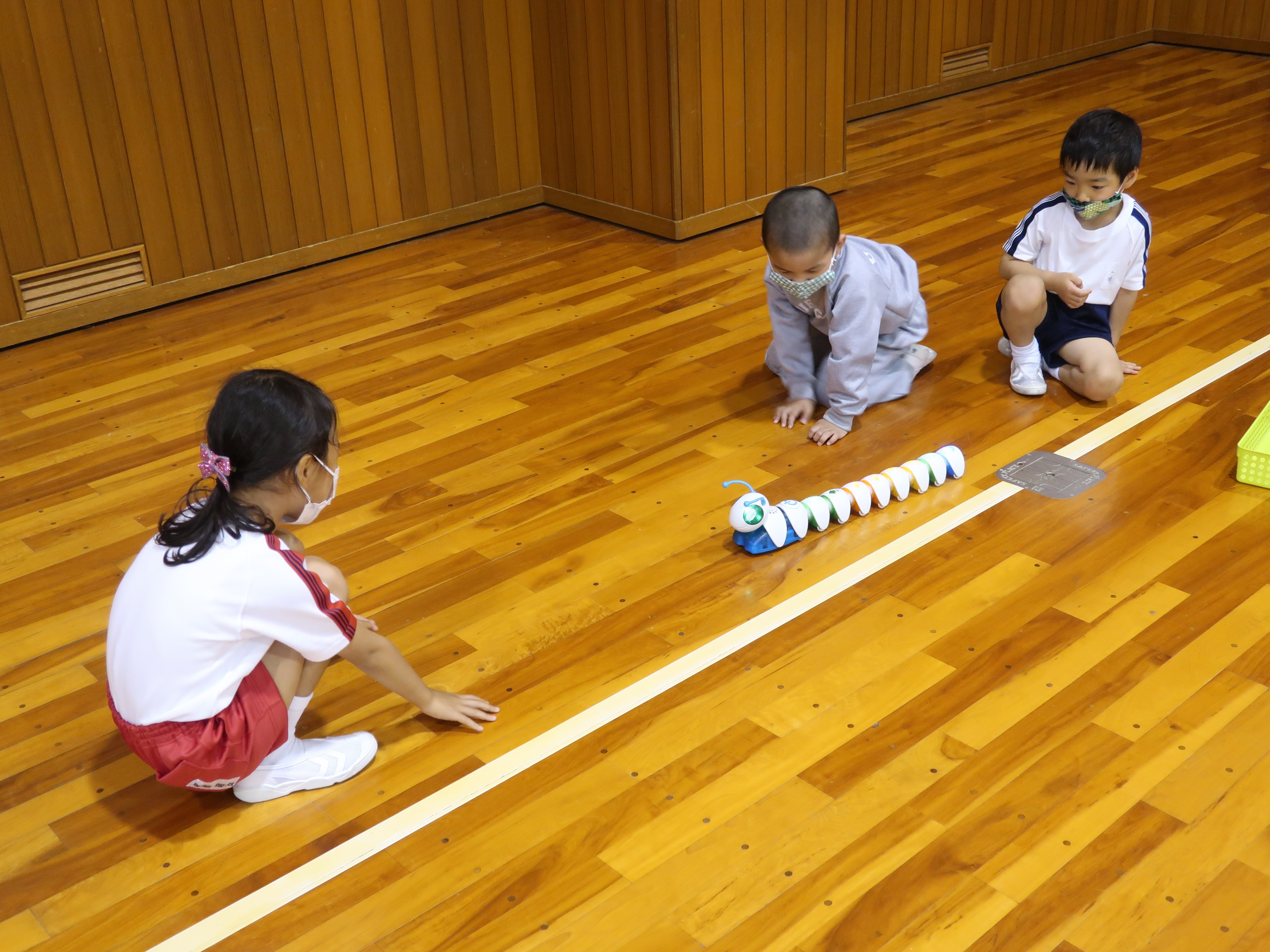 イモムシくんを家に帰すための道順をグループで考えました。上手くゴールまで行けなかったグループは、どうしたらゴールにたどりつけたかグループで考えなおしました。