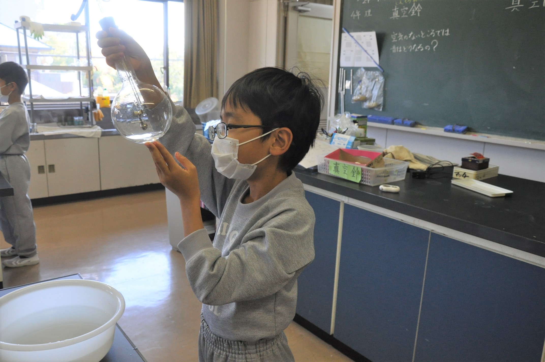 フラスコの中に鈴を入れ、真空状態にすると音は聞こえるのかどうか?実験で調べました。