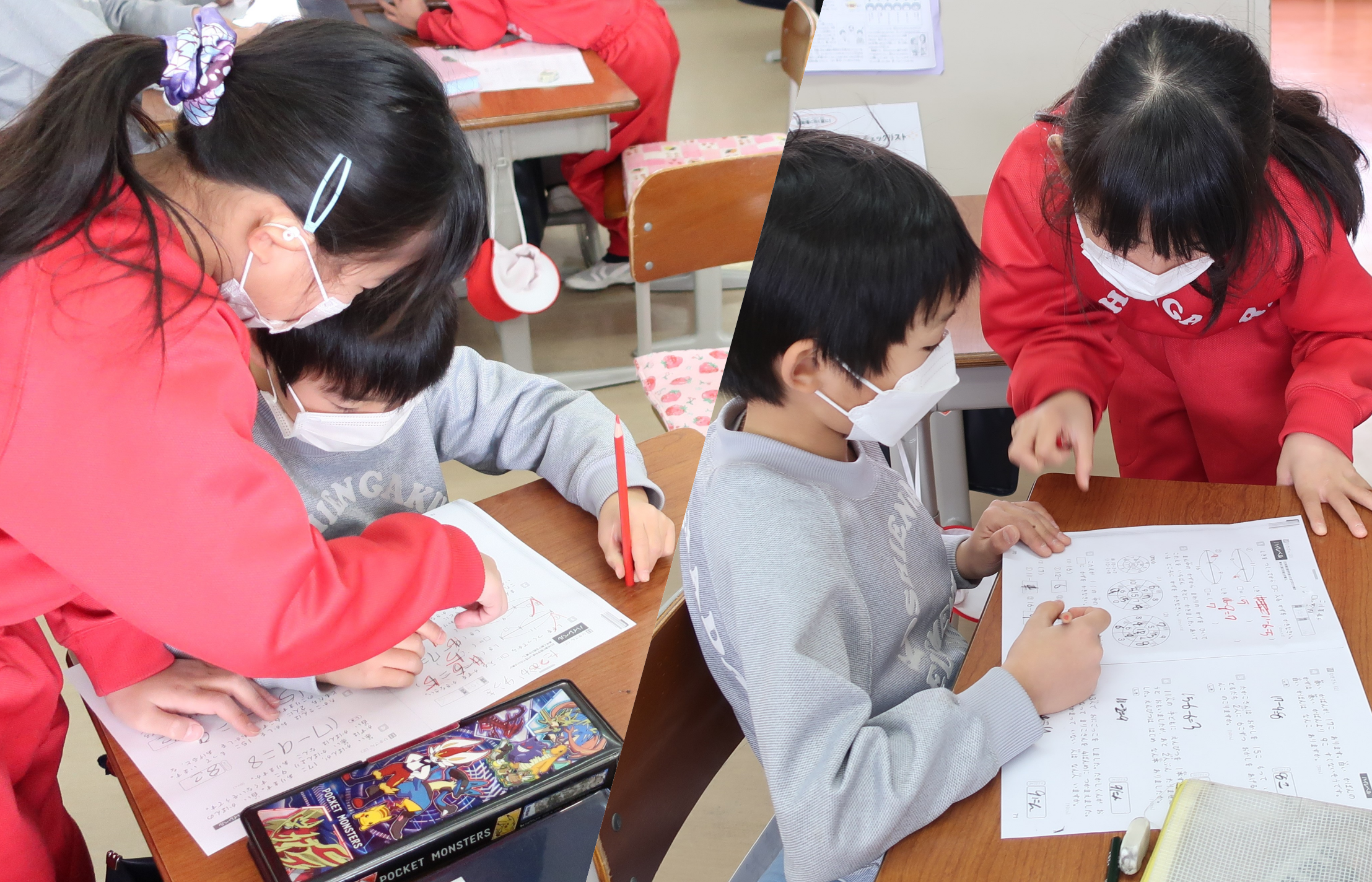 算数では個々に合った発展問題に挑戦しました。班で答え合わせをし、分からないところがあれば教え合うことをしています。