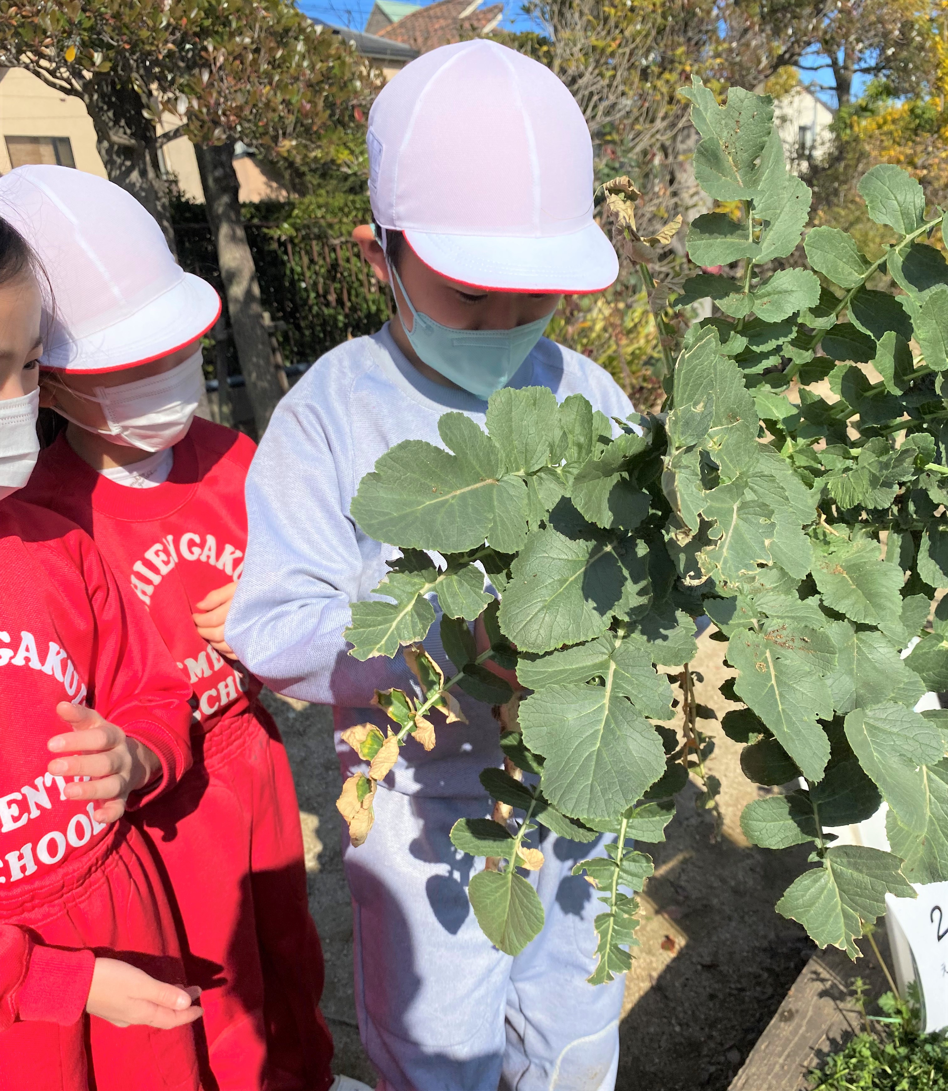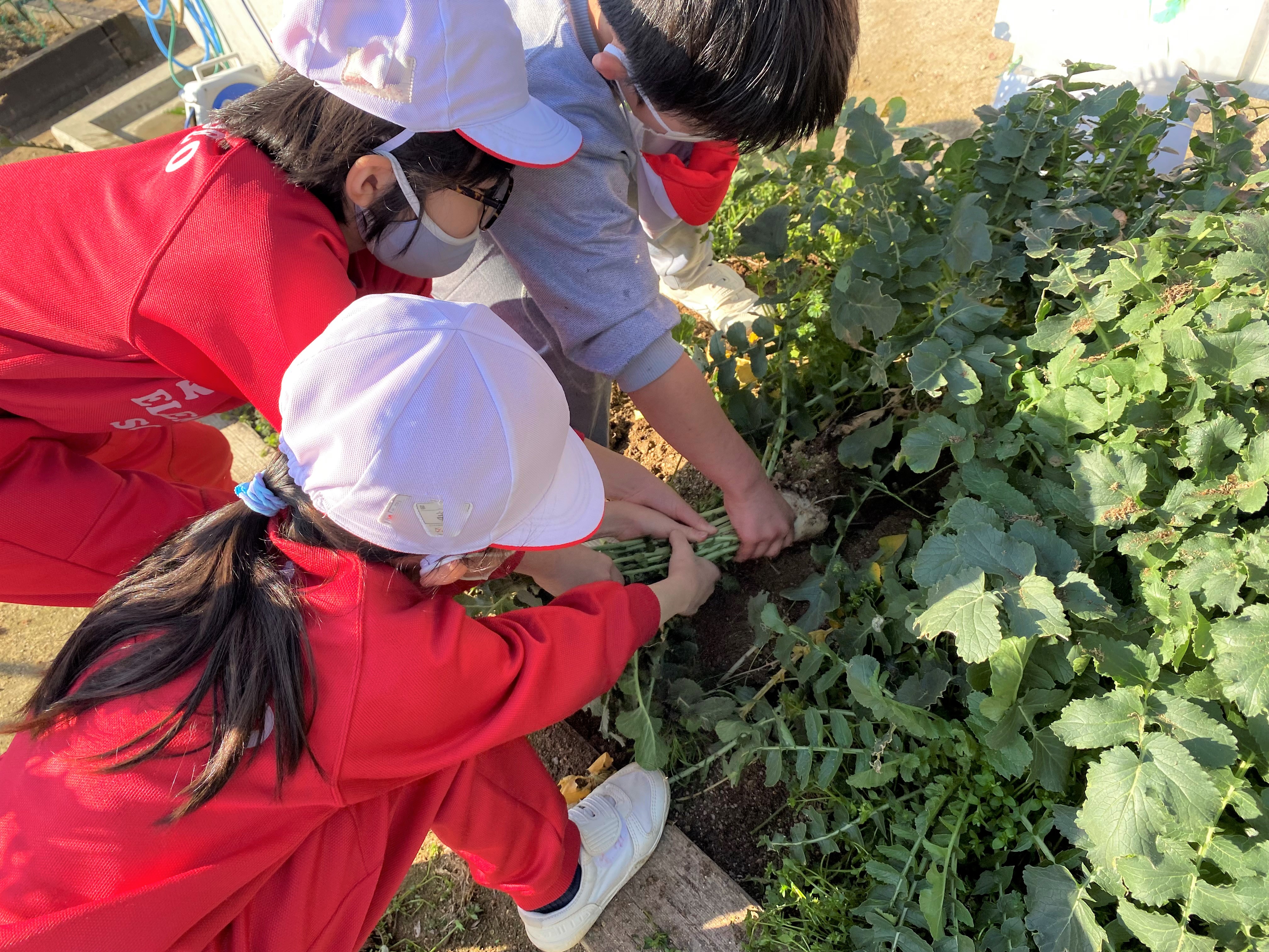 2年生 生活科「大根の収穫」 [投稿日:2022年03月13日] 秋から育てていた大根を収穫しました。予想以上に成長した大根を見て子ども達も嬉しそうでした。「なかなかぬけなーい!」と力を合わせて引き抜く姿がかわいらしかったです。 一覧へ戻る