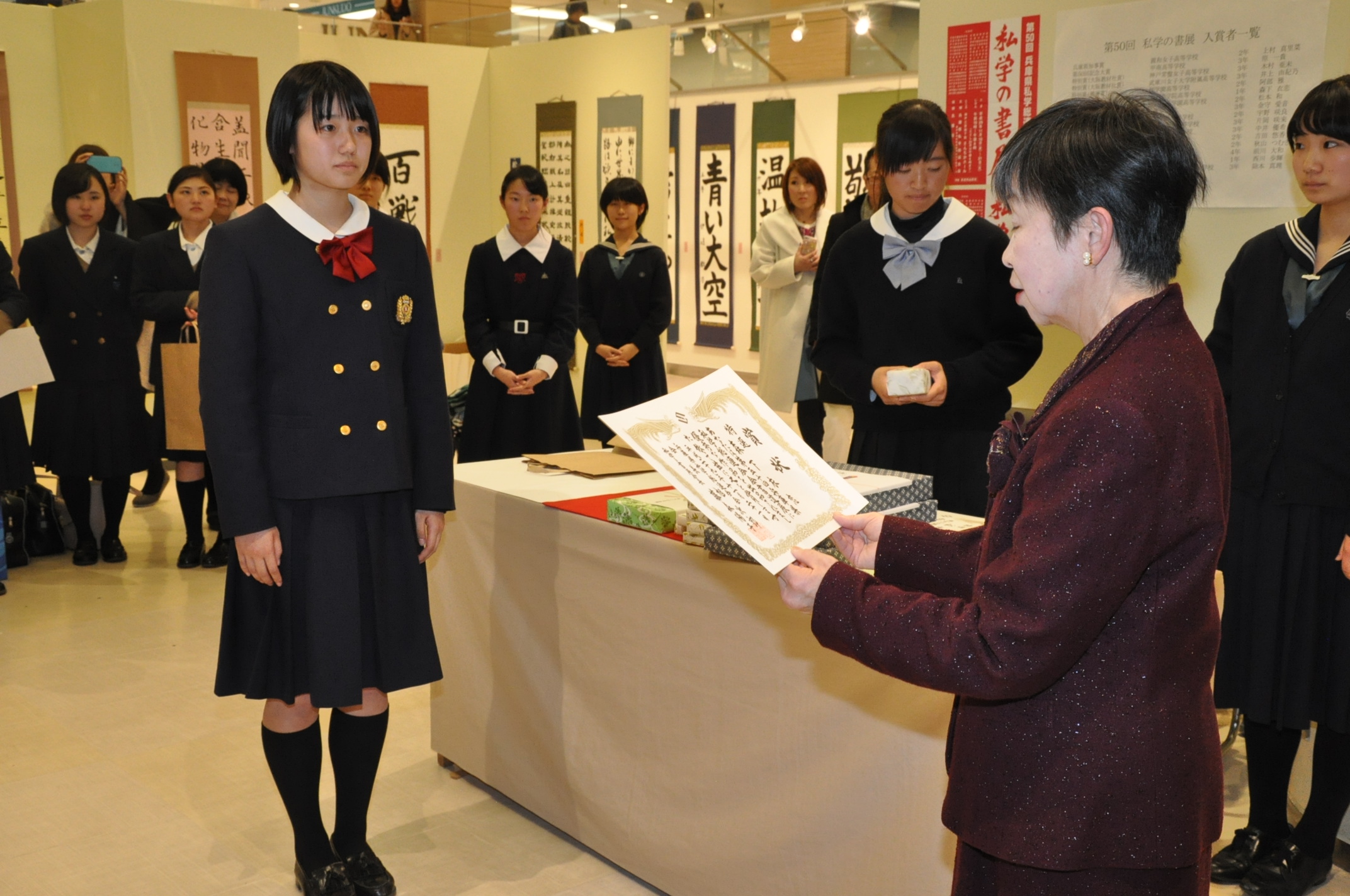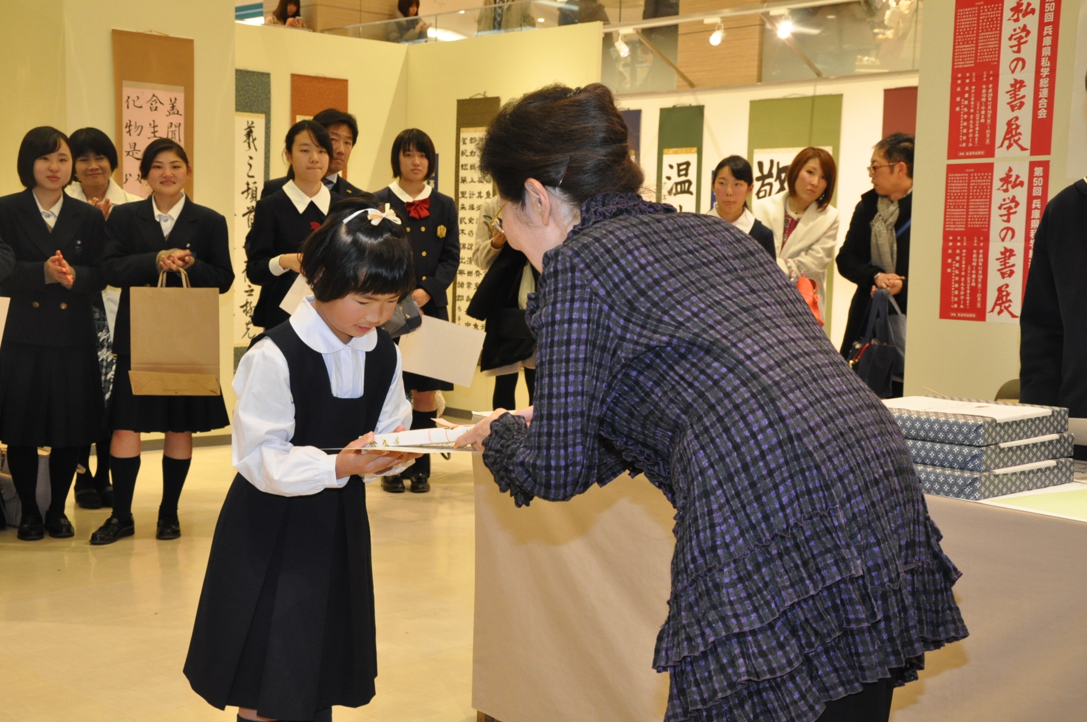 第50回兵庫県私学総連合会「私学の書展」表彰式 [投稿日:2017年11月21日] 兵庫県私学総連合会主催の「第50回私学の書展」の表彰式が行われました。本学院から、小学校2年生児童が特別賞(一休園賞)、高等学校1年生生徒が特別賞(墨運賞)を受賞しました。 一覧へ戻る