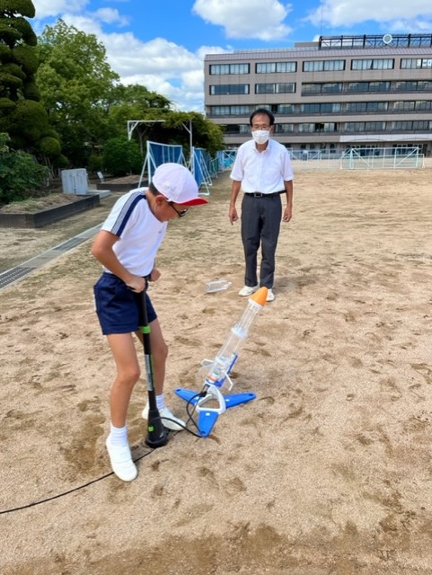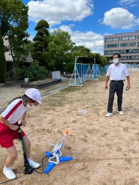 ペットボトルに空気と水を閉じ込めて、ペットボトルロケットを飛ばしました。力いっぱいロケットの中に空気を入れました。
