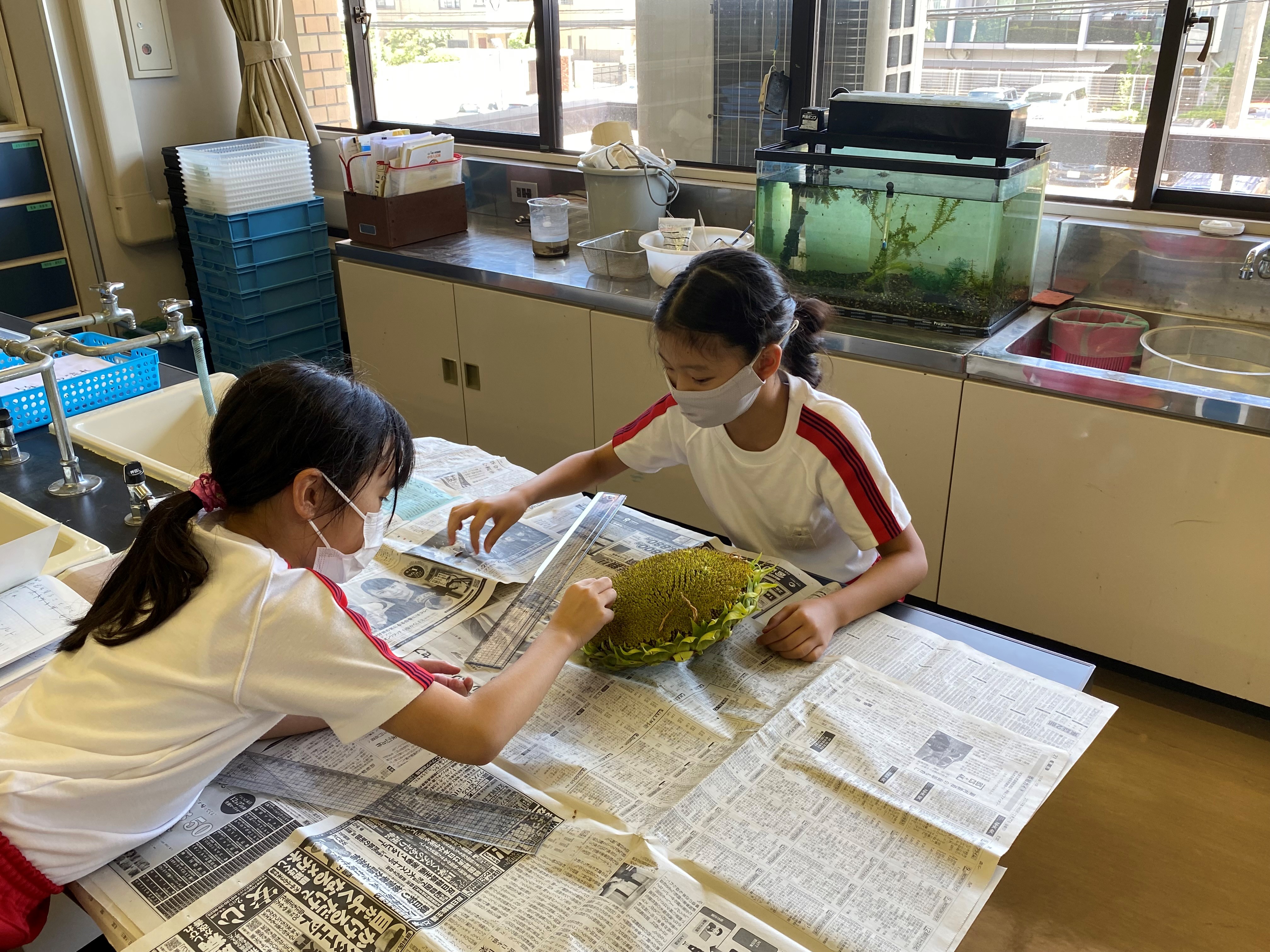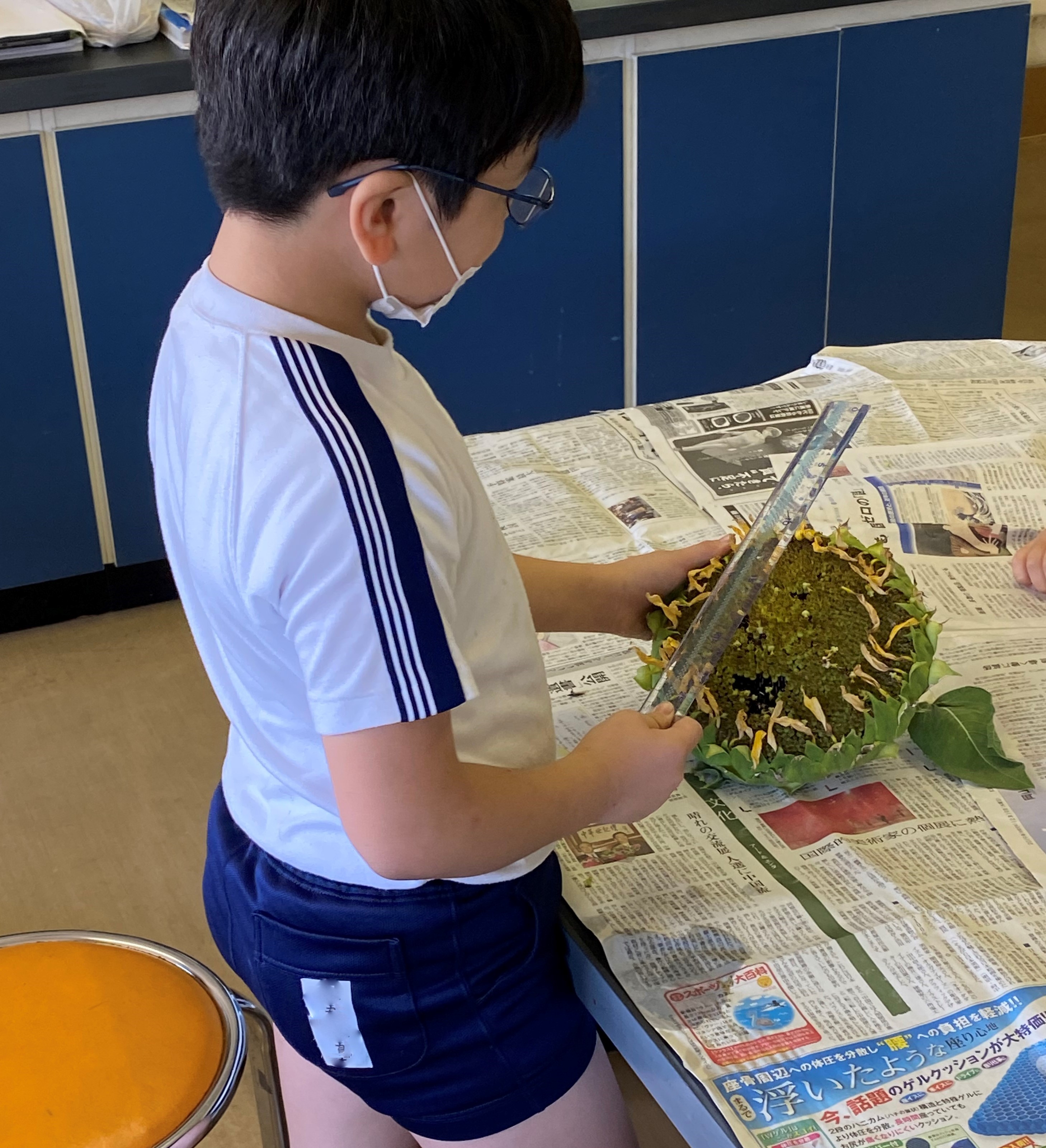 5月に植えたひまわりを収穫し、花の直径を定規で測ったり、たねの個数を数えたりしました。地道に一粒ずつ数え、ある班では、およそ2000個あるという結果を導き出しました。