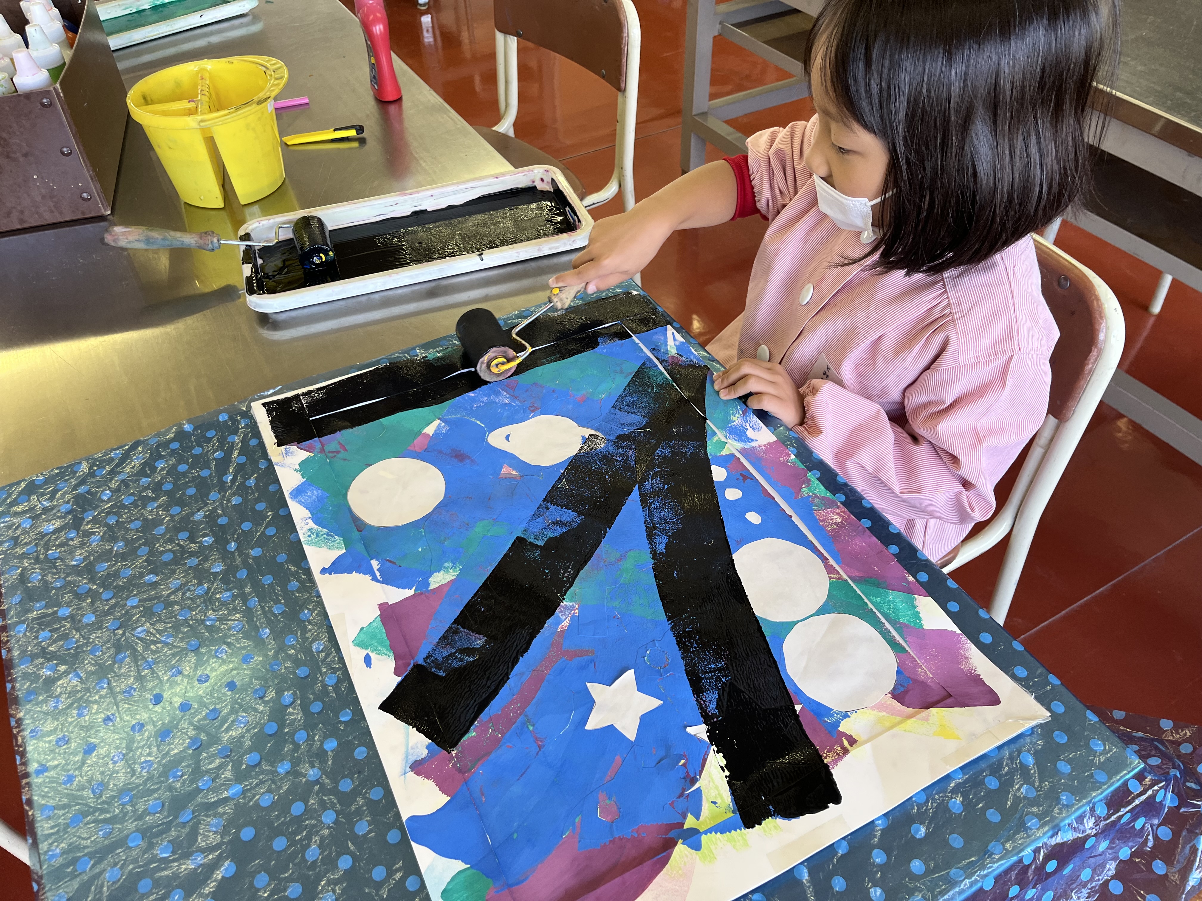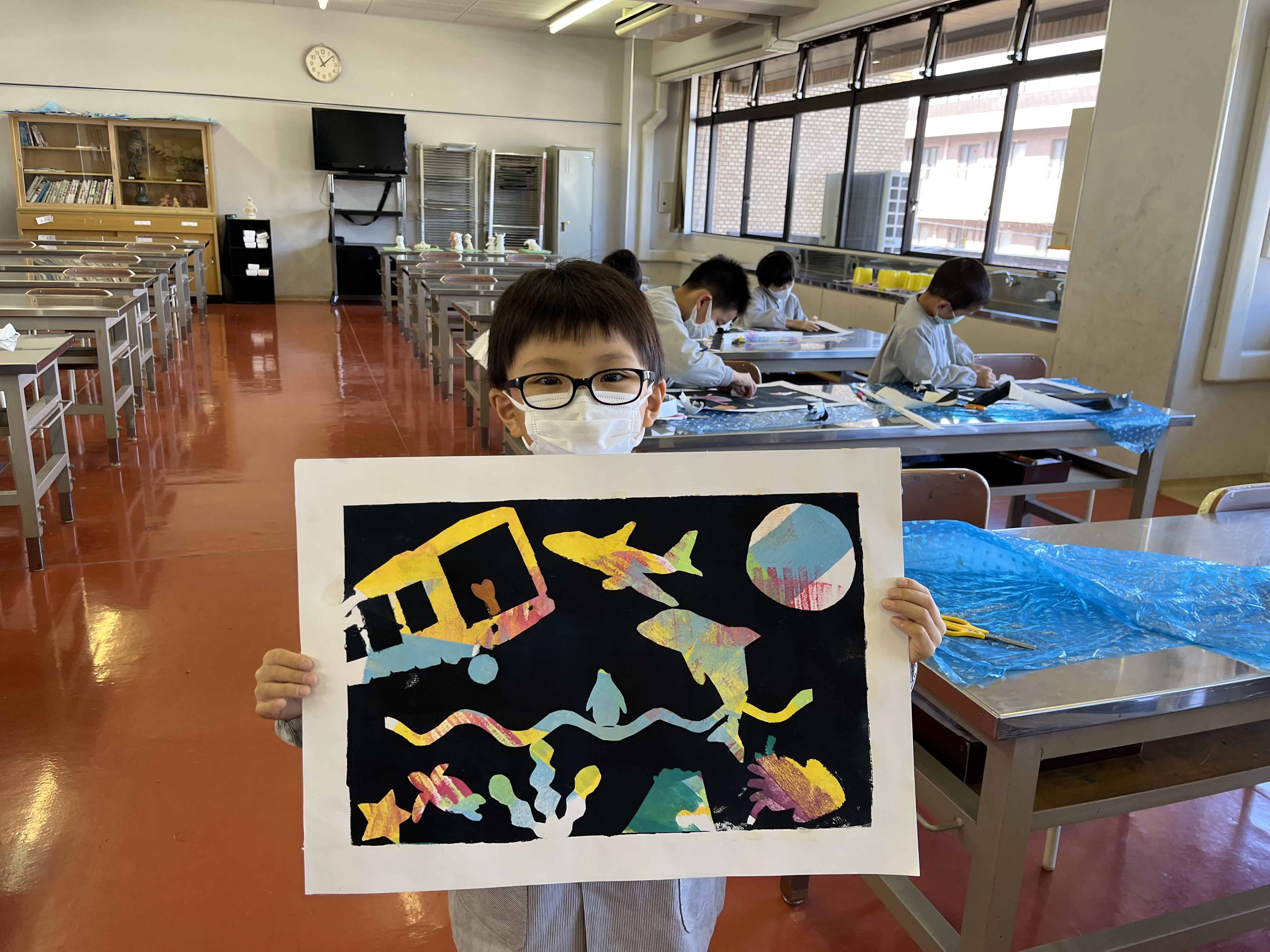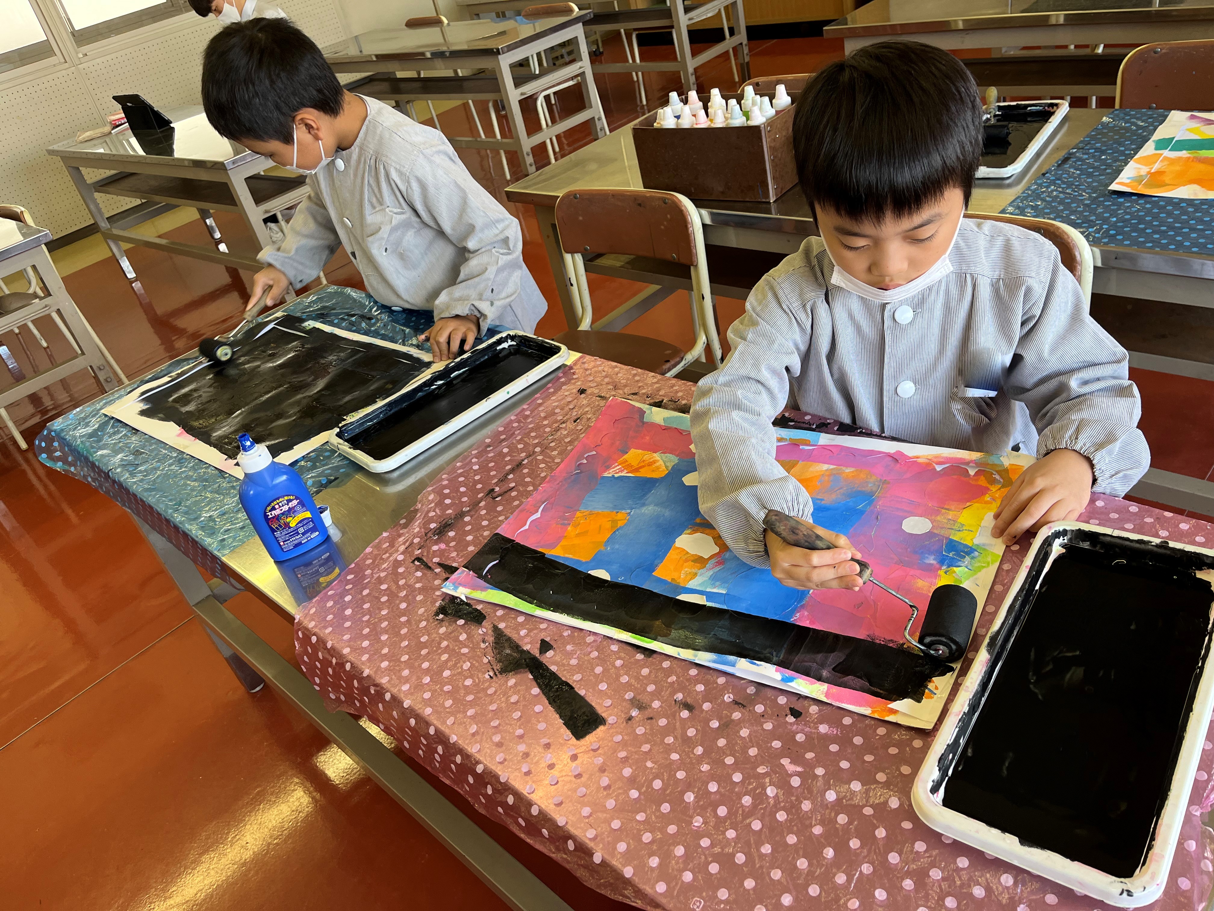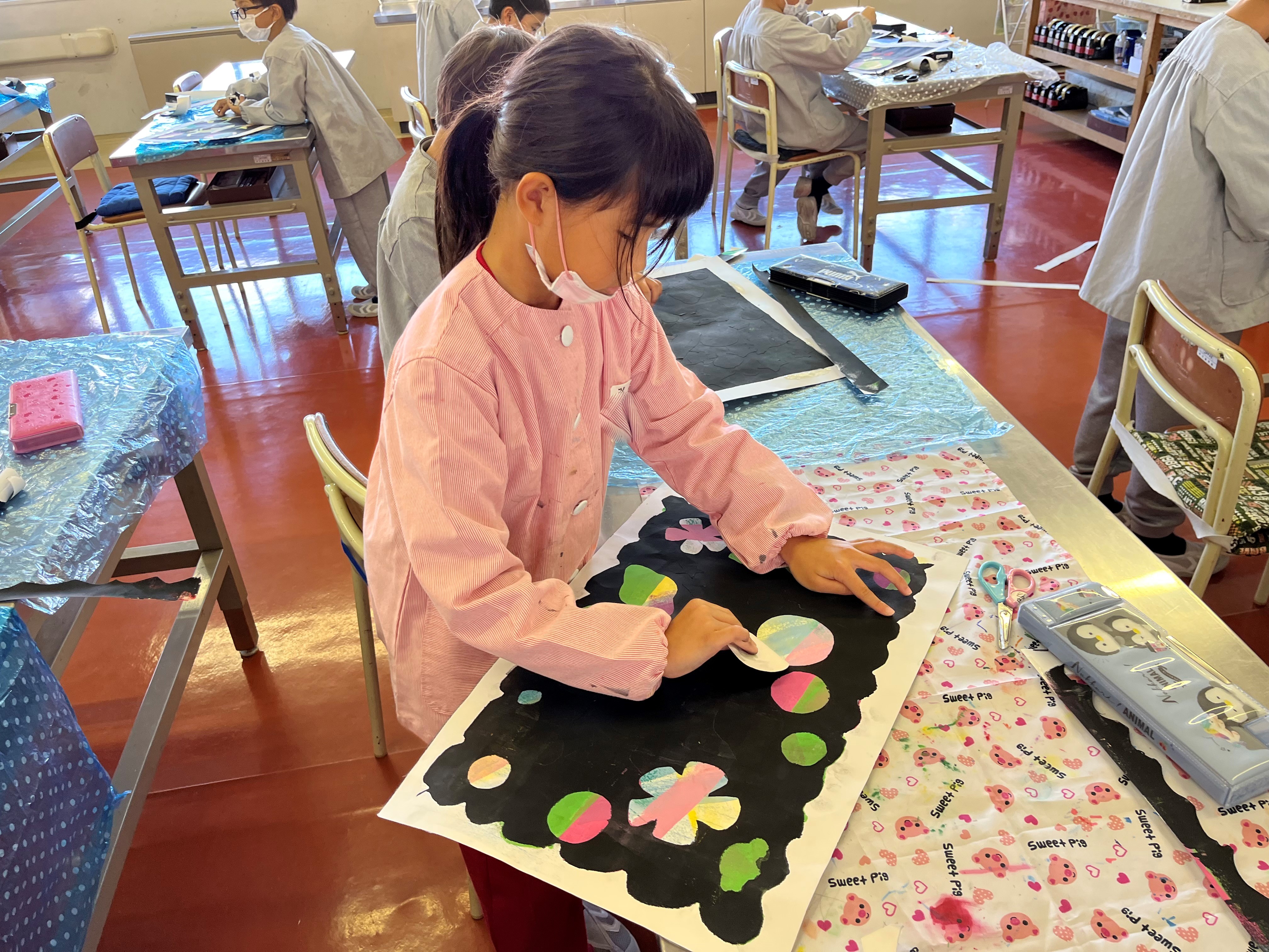 図工では、ステンシル版画をしました。カラフルな色を塗った画用紙に自分の好きなシールを貼っていきます。