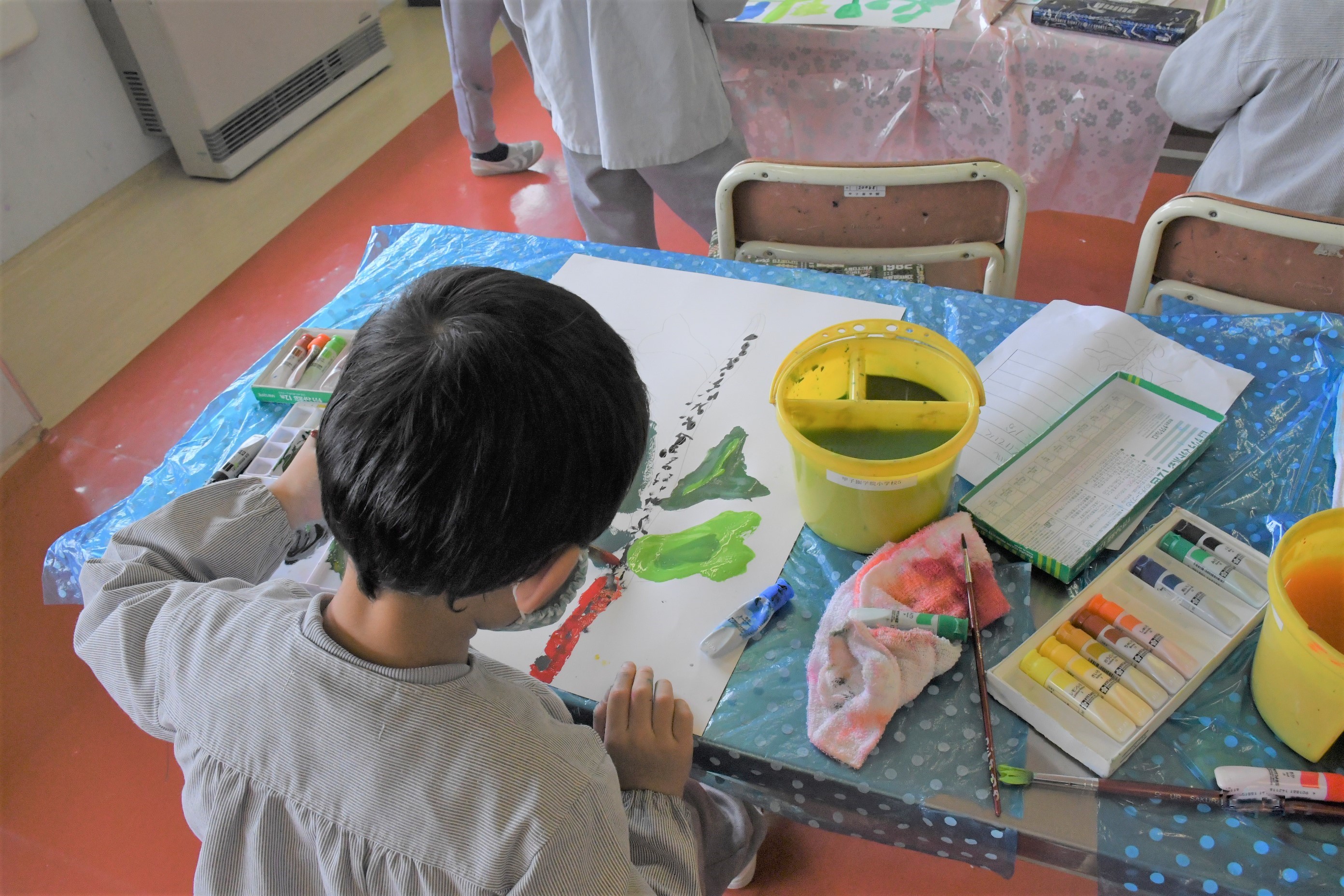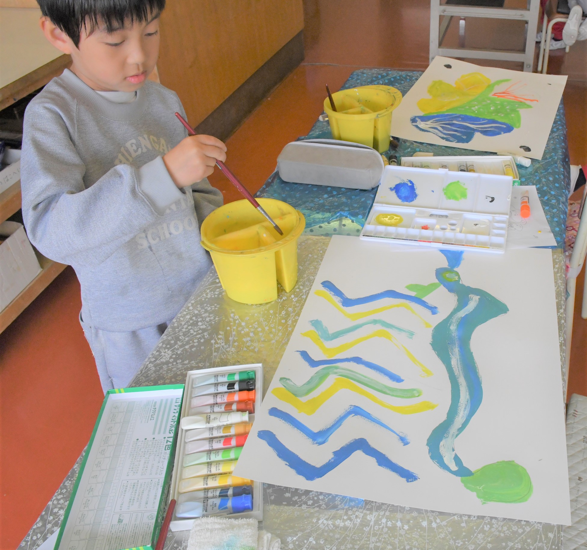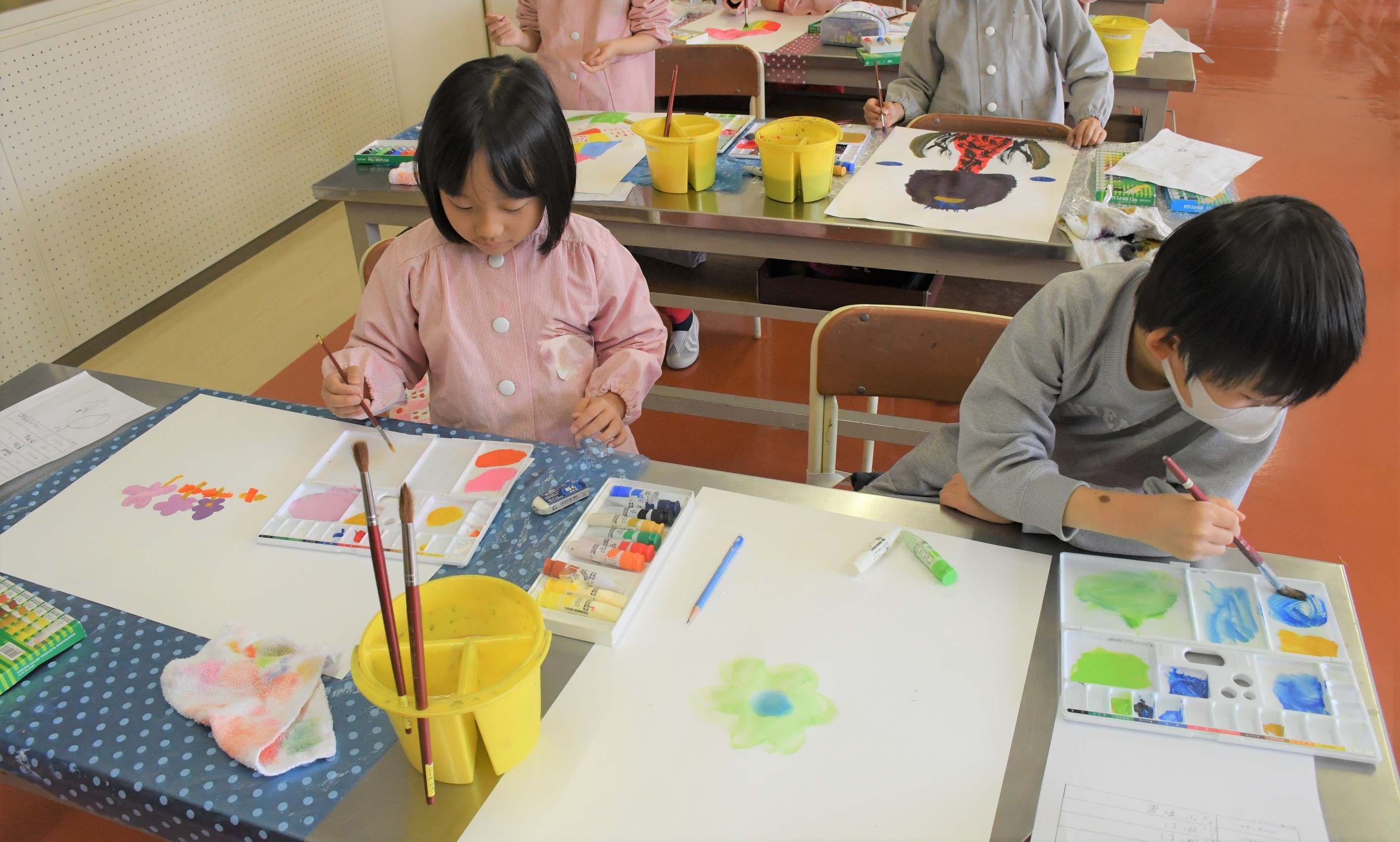 子どもたちは、「まぼろしの花」とその世界について想像を広げ、花が咲いているイメージを持ちながら、色や形を工夫して制作に取り組んでいます。