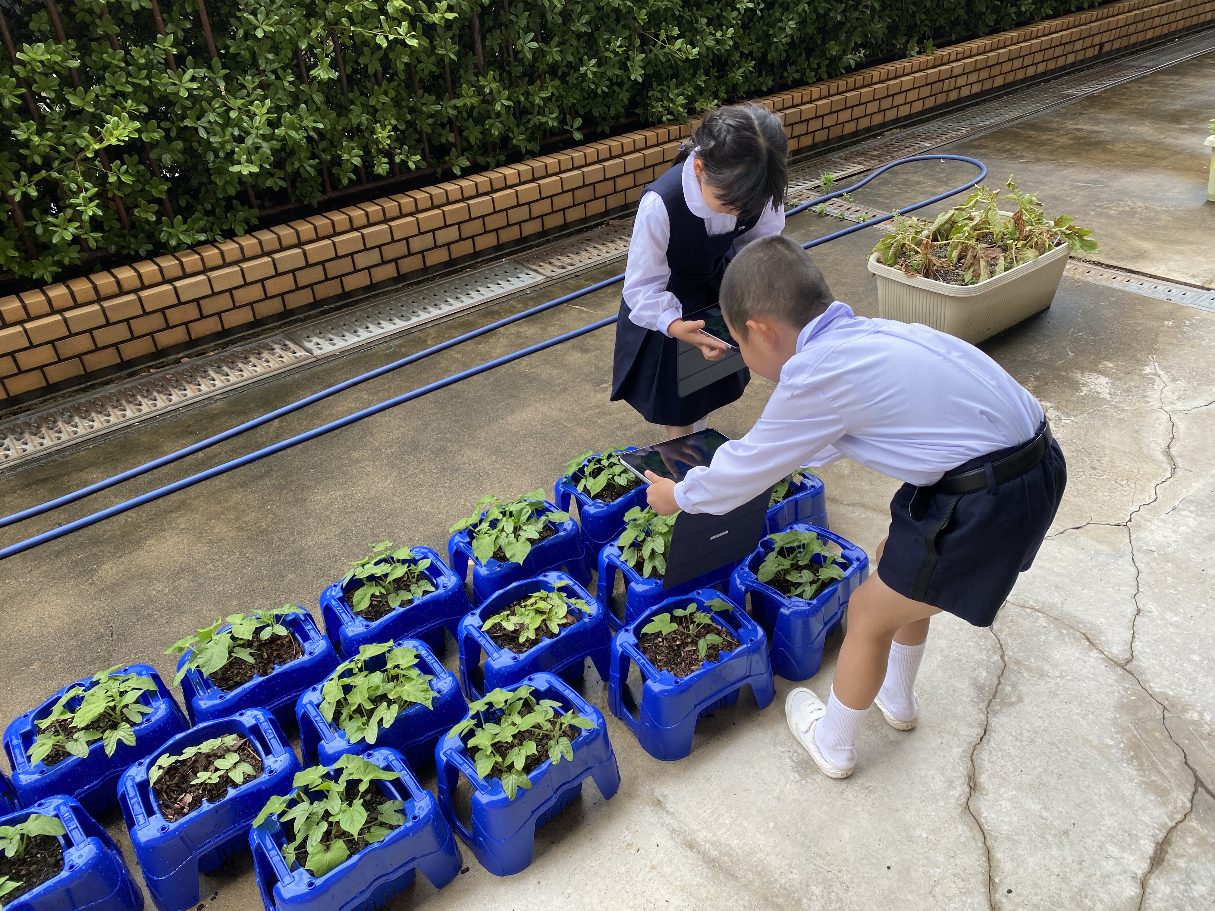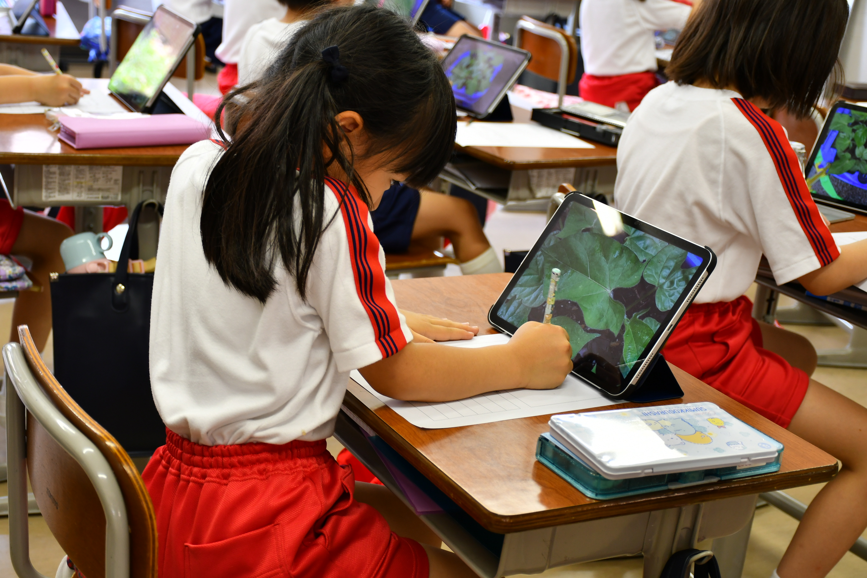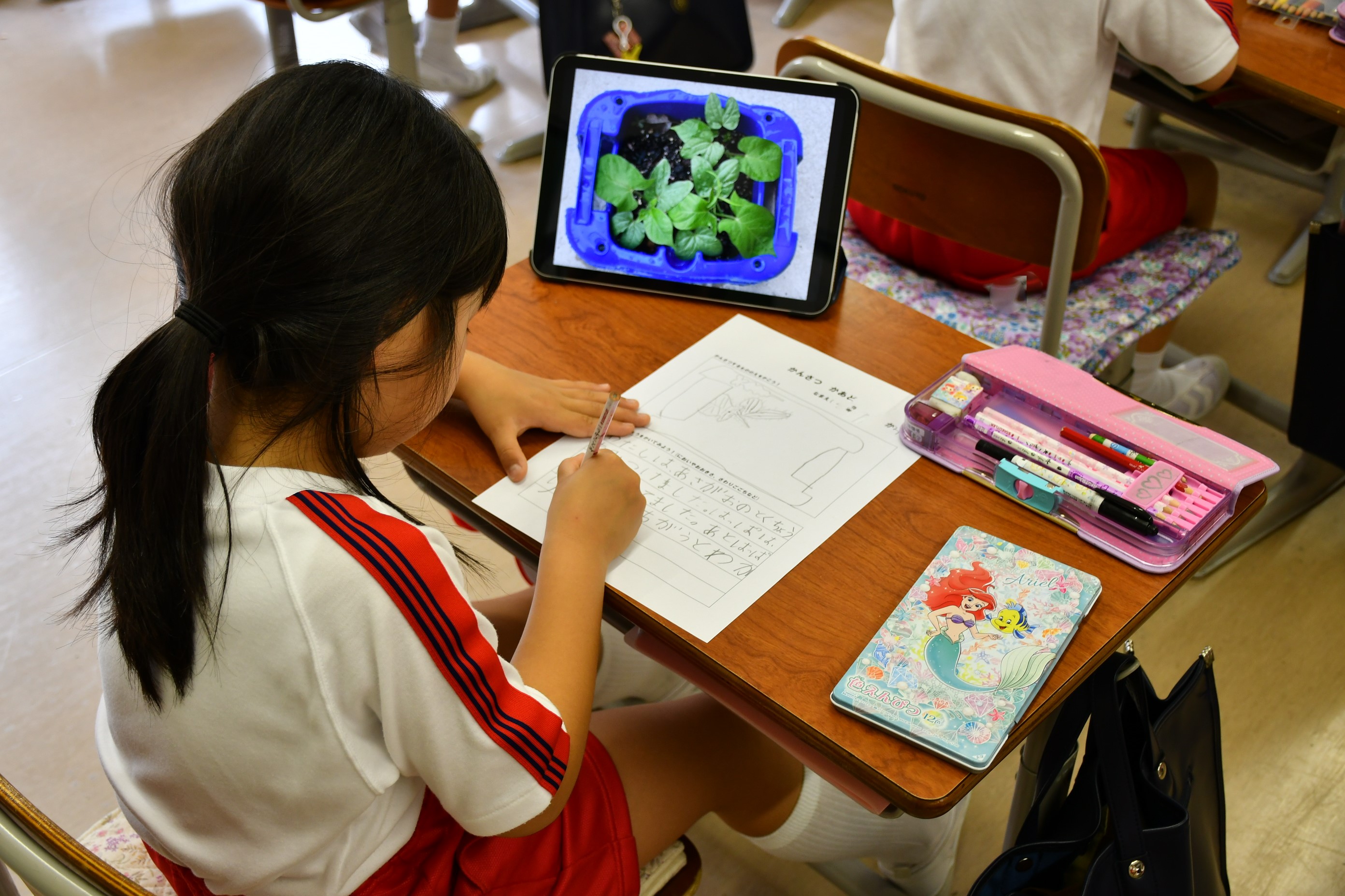 5月はじめから朝顔を育てています。休み時間に水やりをし続け、今では大きな葉が出ています。葉のにおいを嗅いだり,葉を触って感触を確かめたりしたのちにタブレットで朝顔の葉の写真撮影をし,観察カードを書きました。花が咲くのを1年生全員待ち遠しにしています。