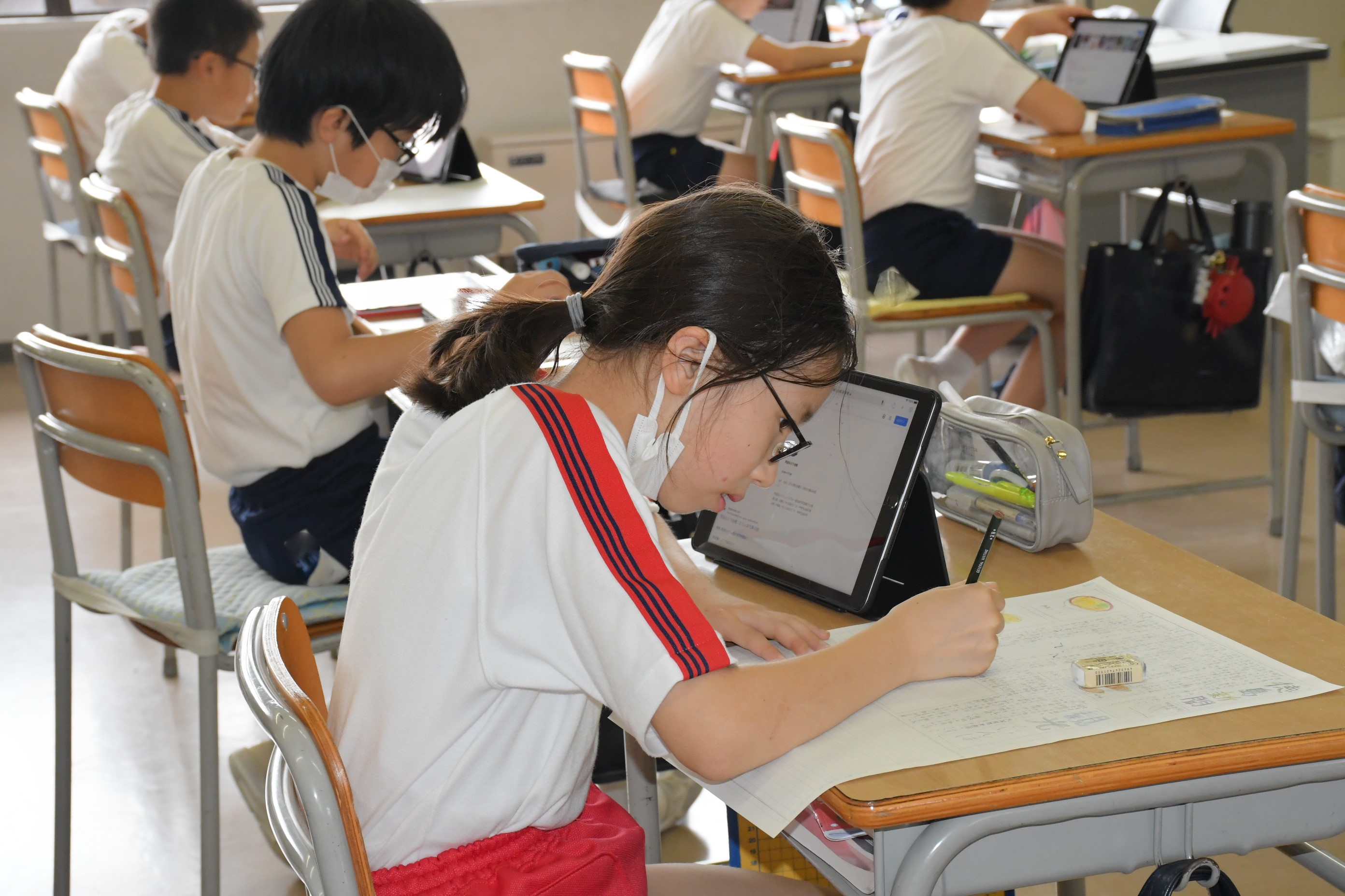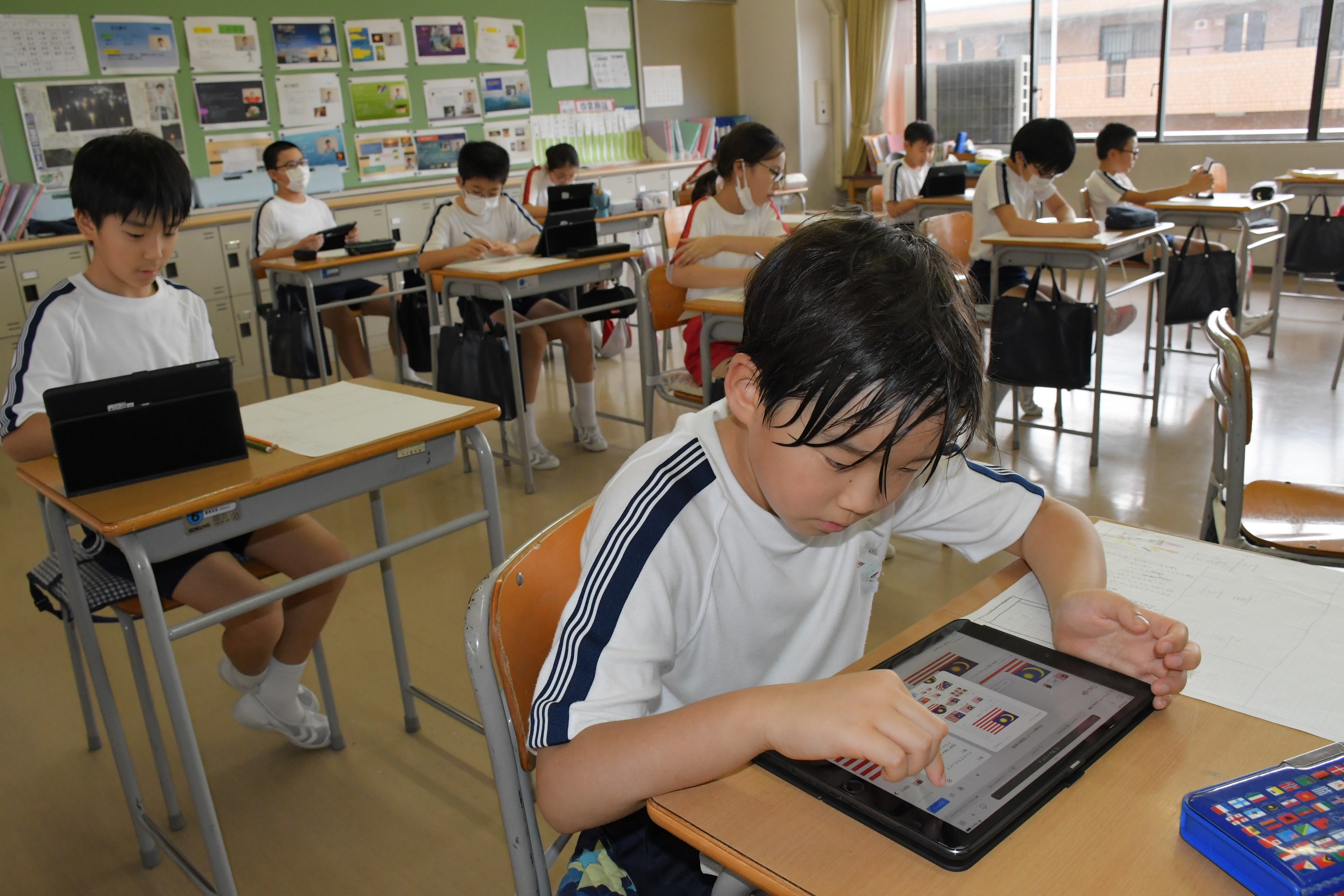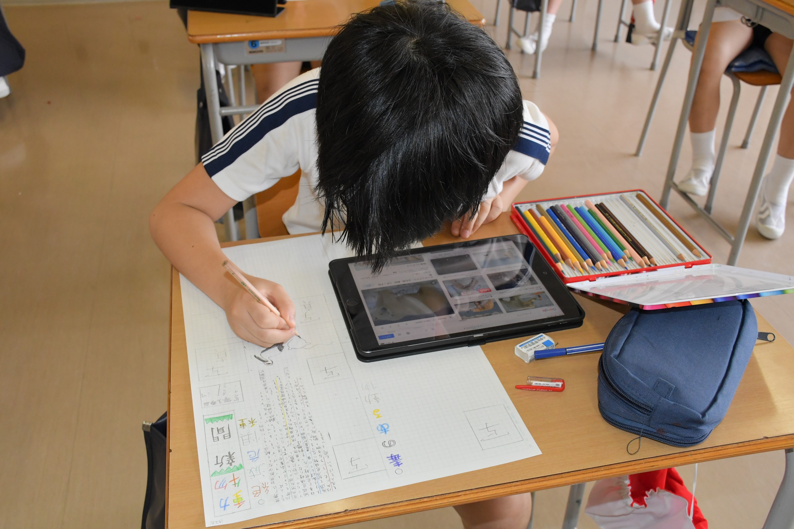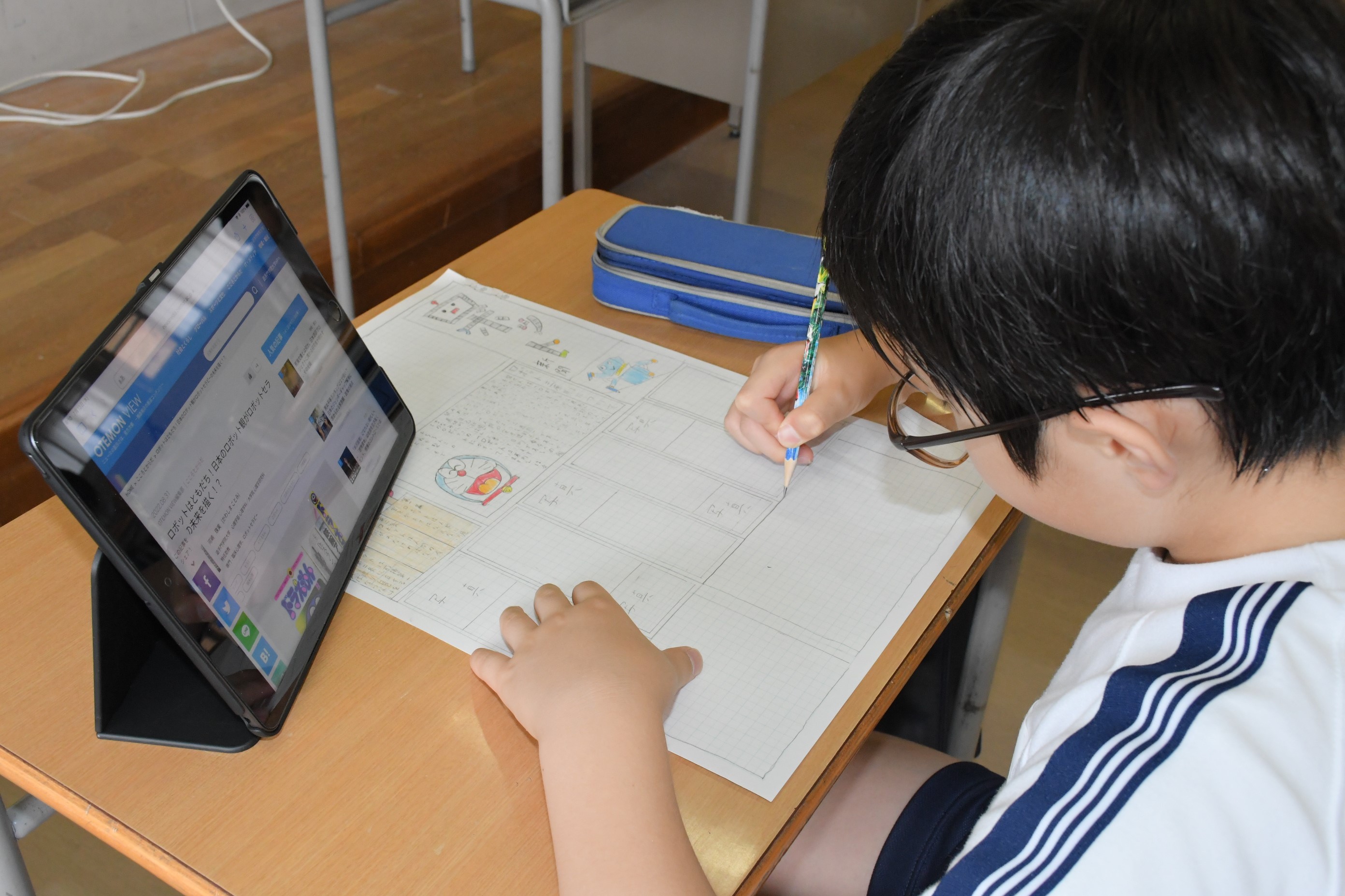 5年生は国語科で新聞づくりに取り組んでいます。その中でタブレットを使い、情報を取捨選択する力を身につけつつあります。また読み手に正確に伝えるための要素には何があるのかを考える学習とともなっています。完成は夏休み明け!どんな新聞が完成するのかとても楽しみです。