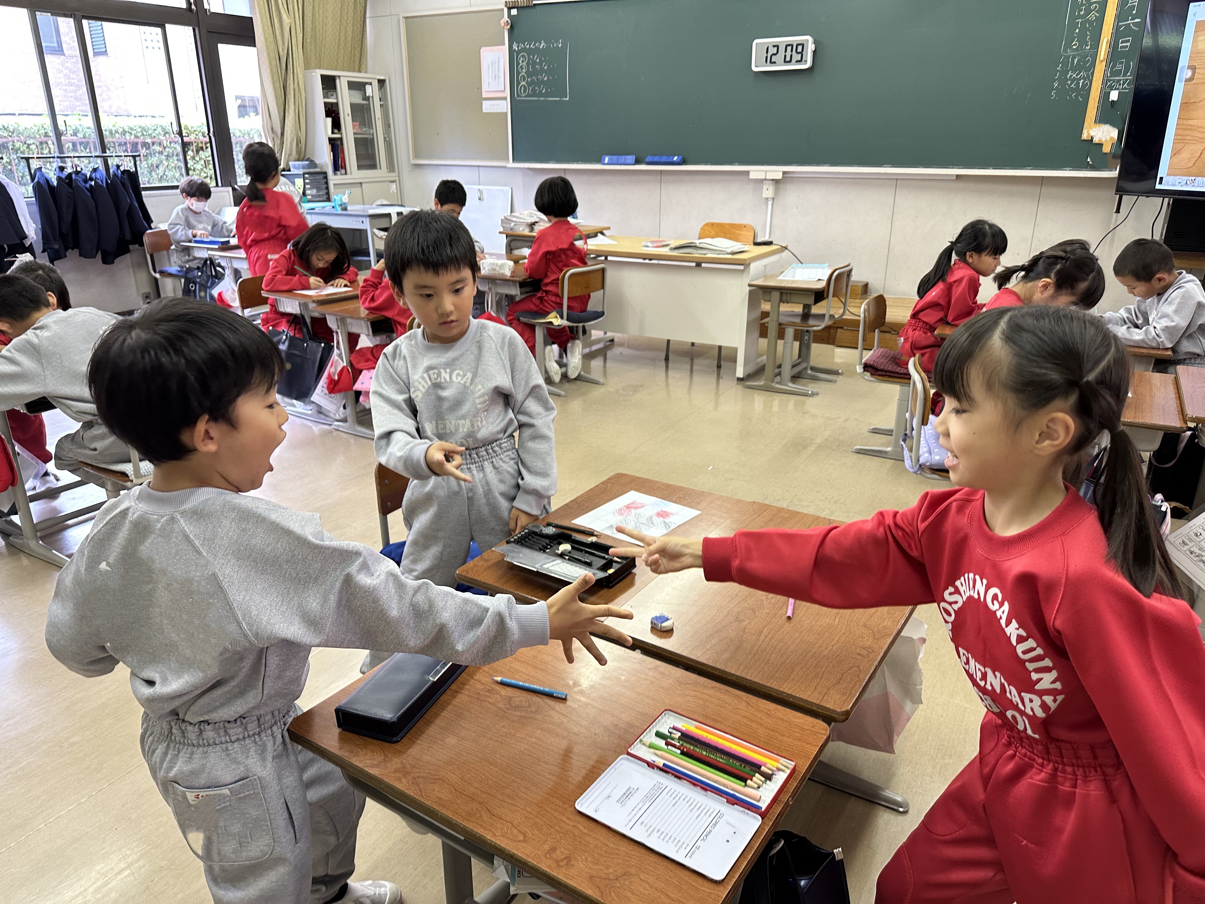 間接比較の勉強として、陣取りゲームを行いました。じゃんけんに勝った人が自分の色を塗り、その広さの差を求めました。ゲーム形式の授業でしたが、勝ち負けにこだわらず、伸び伸びと取り組んでいました。