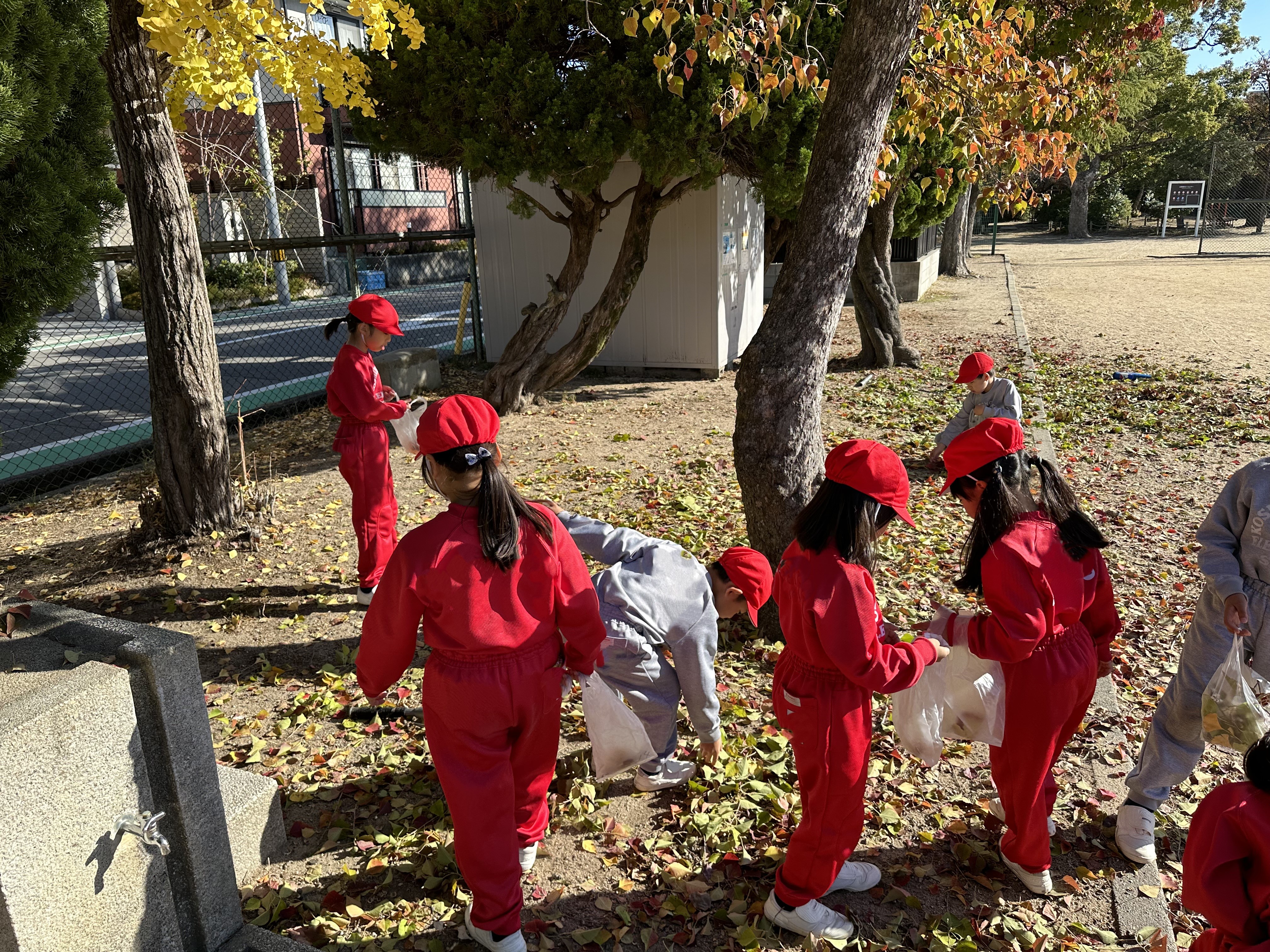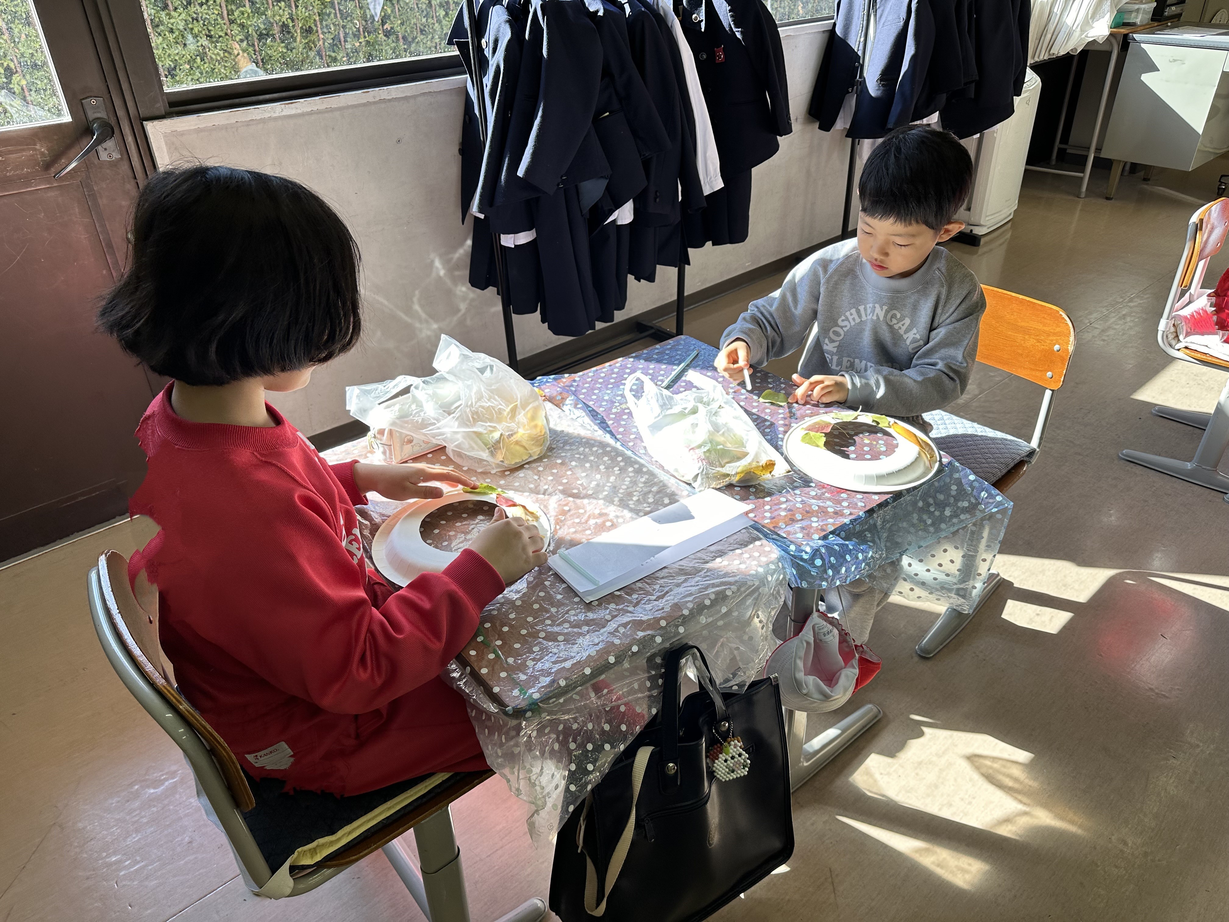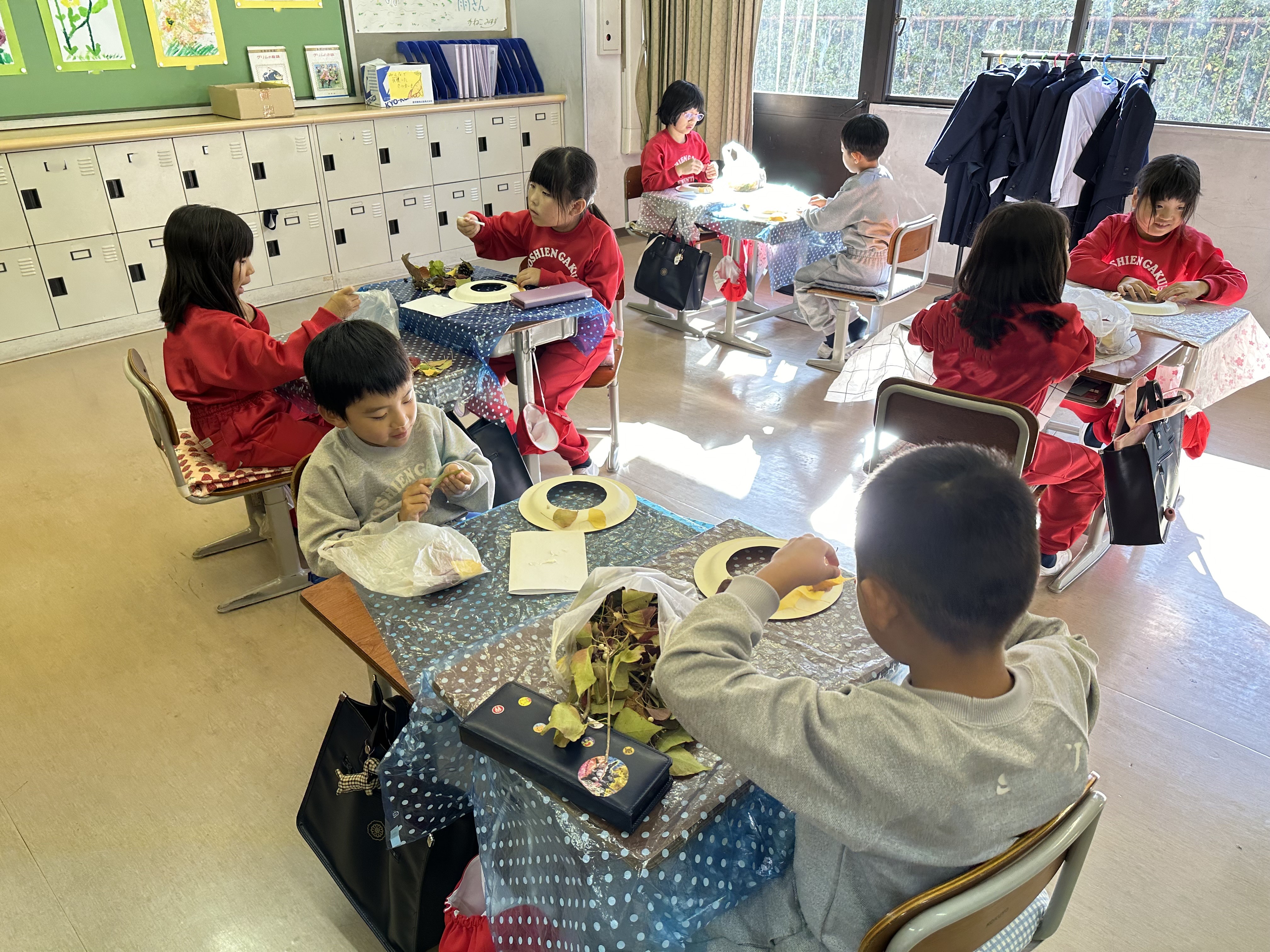 学校のすぐ近くにある二見公園で「秋」を探しに出かけました。赤や黄に色変わりした葉やまつぼっくりなどを見つけて、集めました。その後、拾った落ち葉や実をつかって、リースづくりをしました。季節を感じることができるような作品を作ることができました。