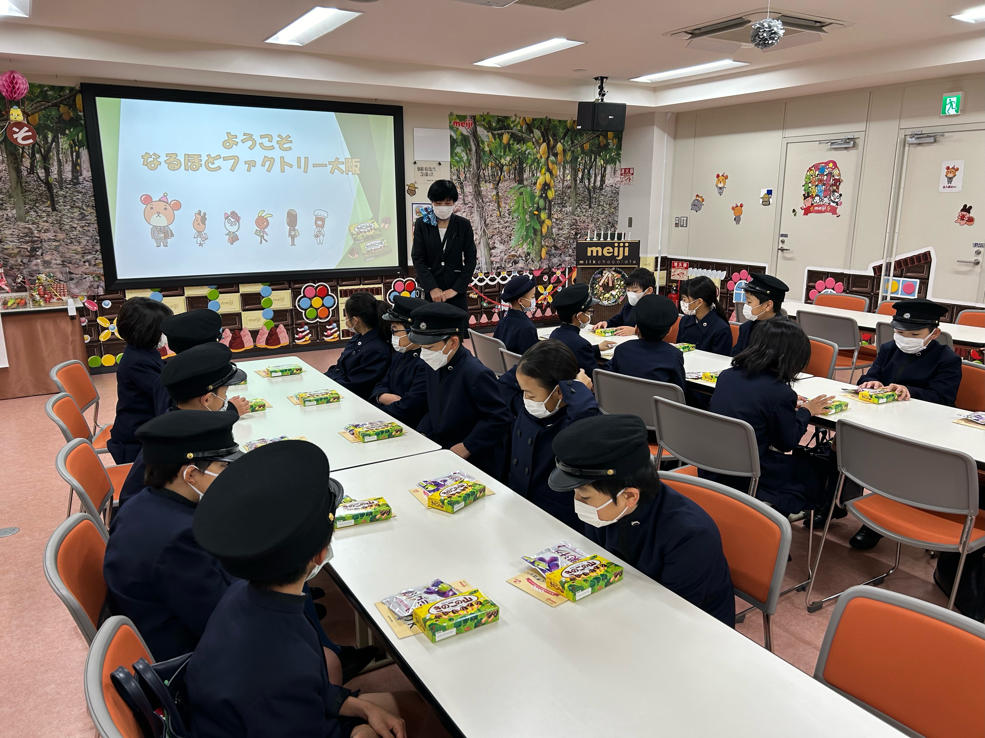 高槻市にある「明治なるほどファクトリー大阪」の工場見学に行きました。チョコレートの製造工程の見学や明治の安全・安心なモノづくり、「食と健康」へのこだわりの取組みの紹介を通じて、楽しく学ぶことができました。そのあと「きのこの山」と「たけのこの里」の生産ラインを見学させていただきました。1学期「工場ではたらく人」について学習したことを、実際に見られるよい機会となりました。