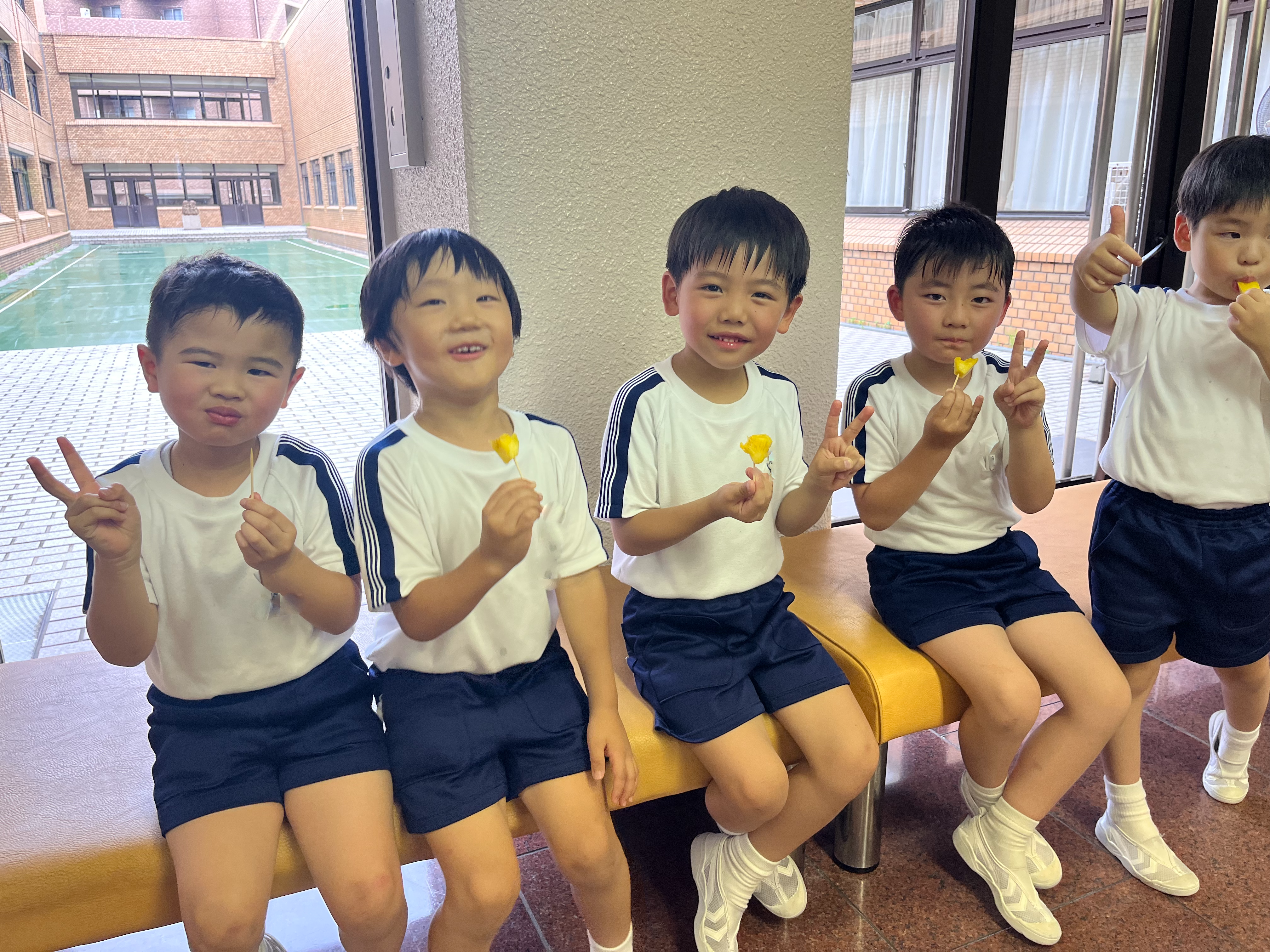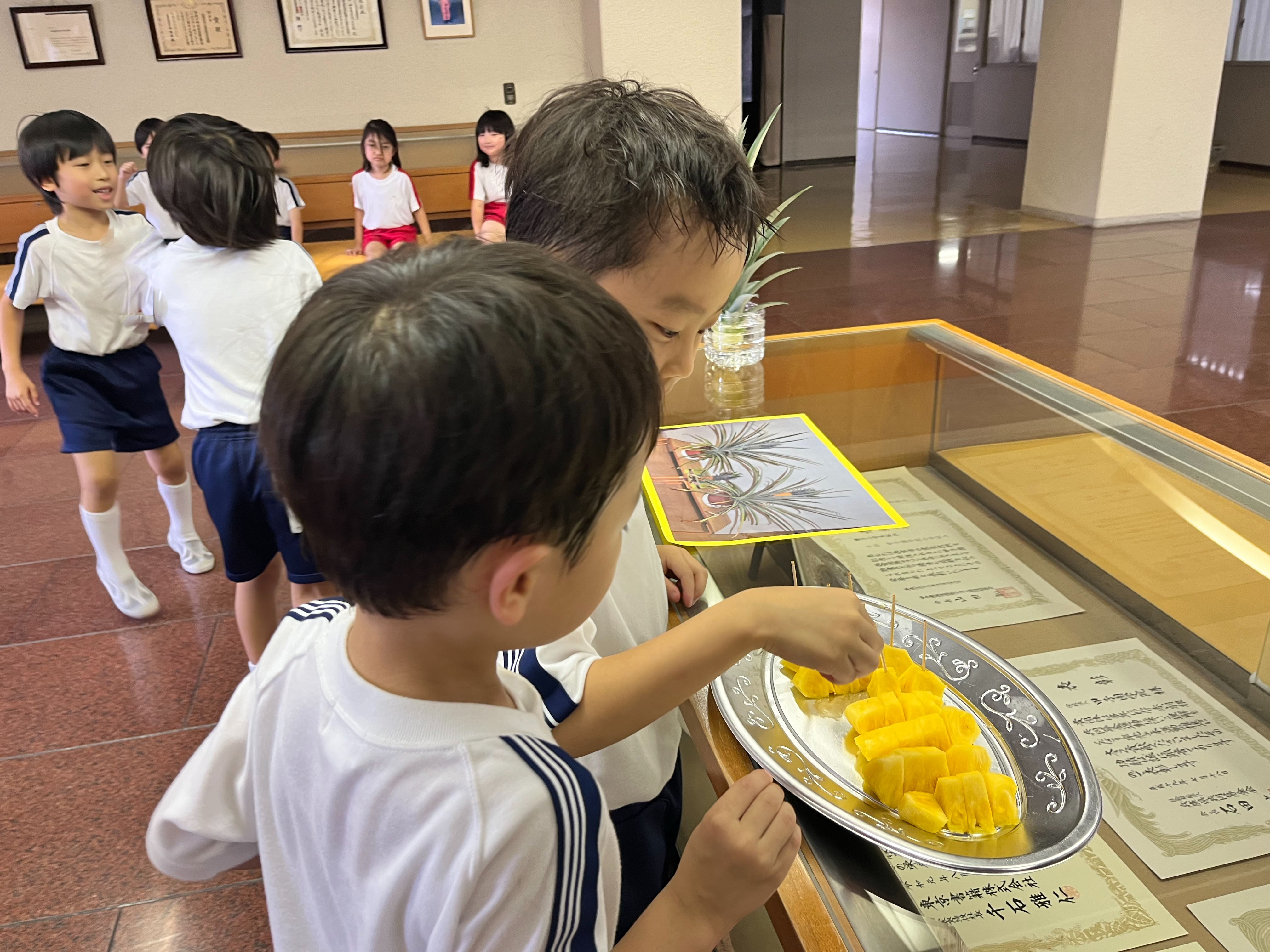 親子の集いで見たパイナップルの木からどのように実がなったのか、写真で知ることができ勉強にもなりました。職員室の前に飾られていた時から甘い匂いが漂っていて楽しみにしていたパイナップルは、とても甘くておいしかったです。