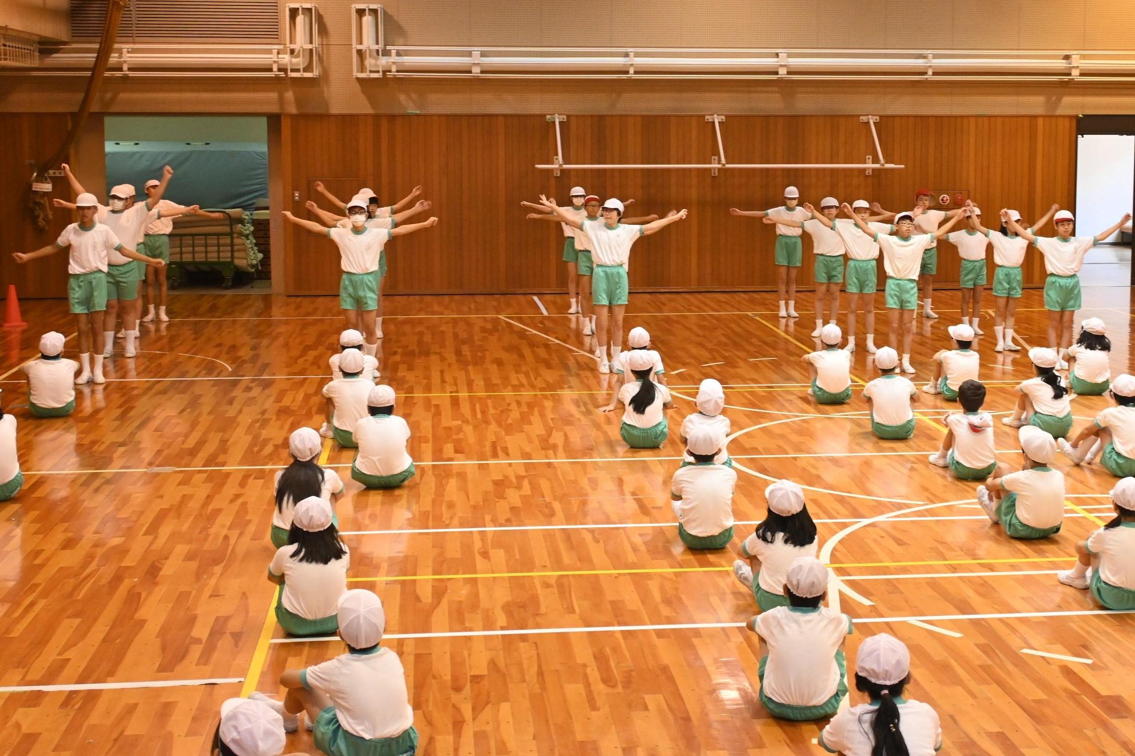 全校運動会合同練習「ラジオ体操を下級生に披露」