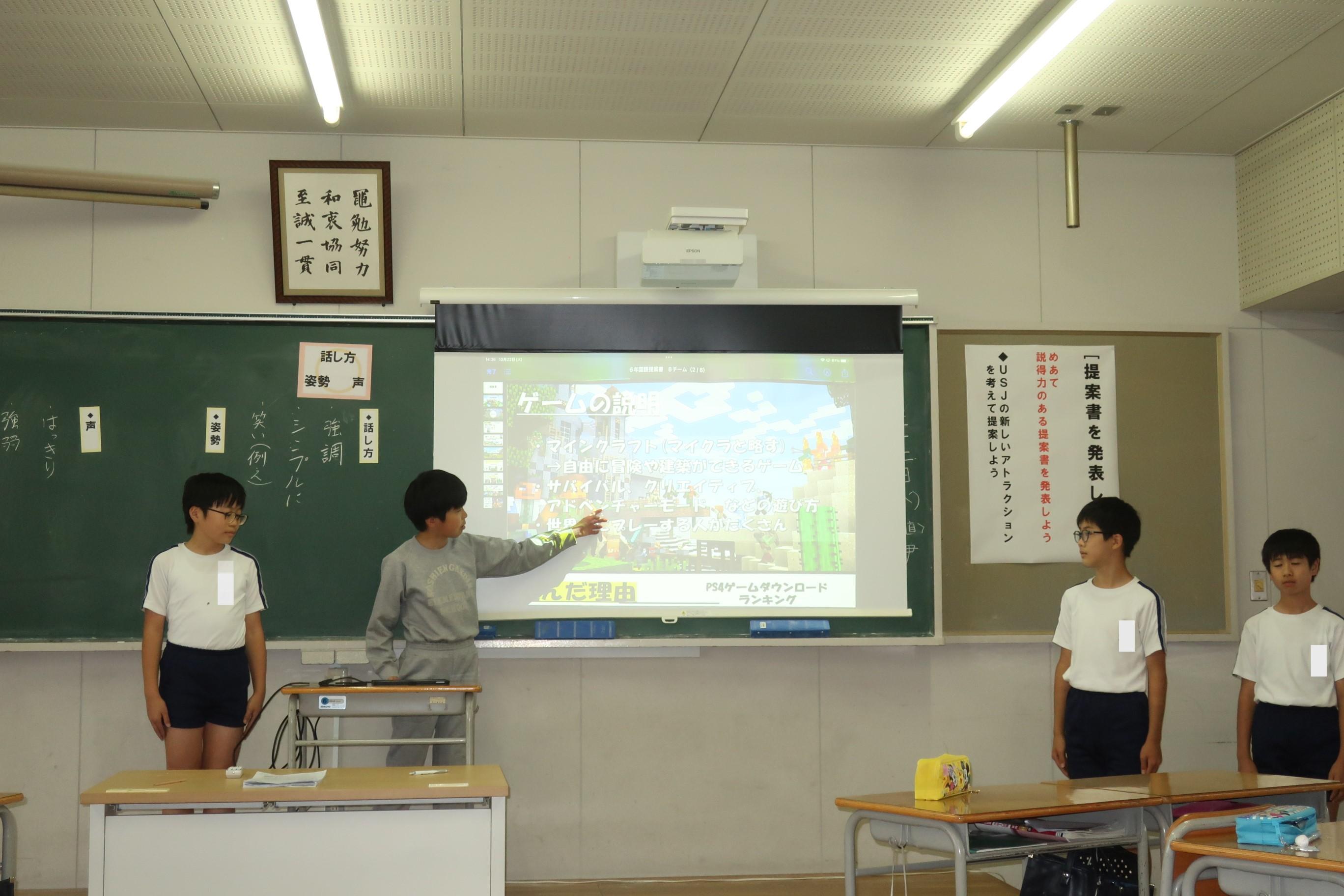 6年生は9月から国語科の授業「提案書を書こう」という単元のもと、読む人聞く人に説得力をもって伝わるように、提案する文章を作ってきました。その発展学習として『USJの新アトラクション内容』を考え、『なぜそのアトラクションでないといけないのか』詳しく事実と根拠を示しながら9月の参観で発表をしました。子どもたちは、根拠となる図や表を扱い、アトラクションのイメージ写真は生成AIで作成し、より説得力のある発表になるよう目指しました。