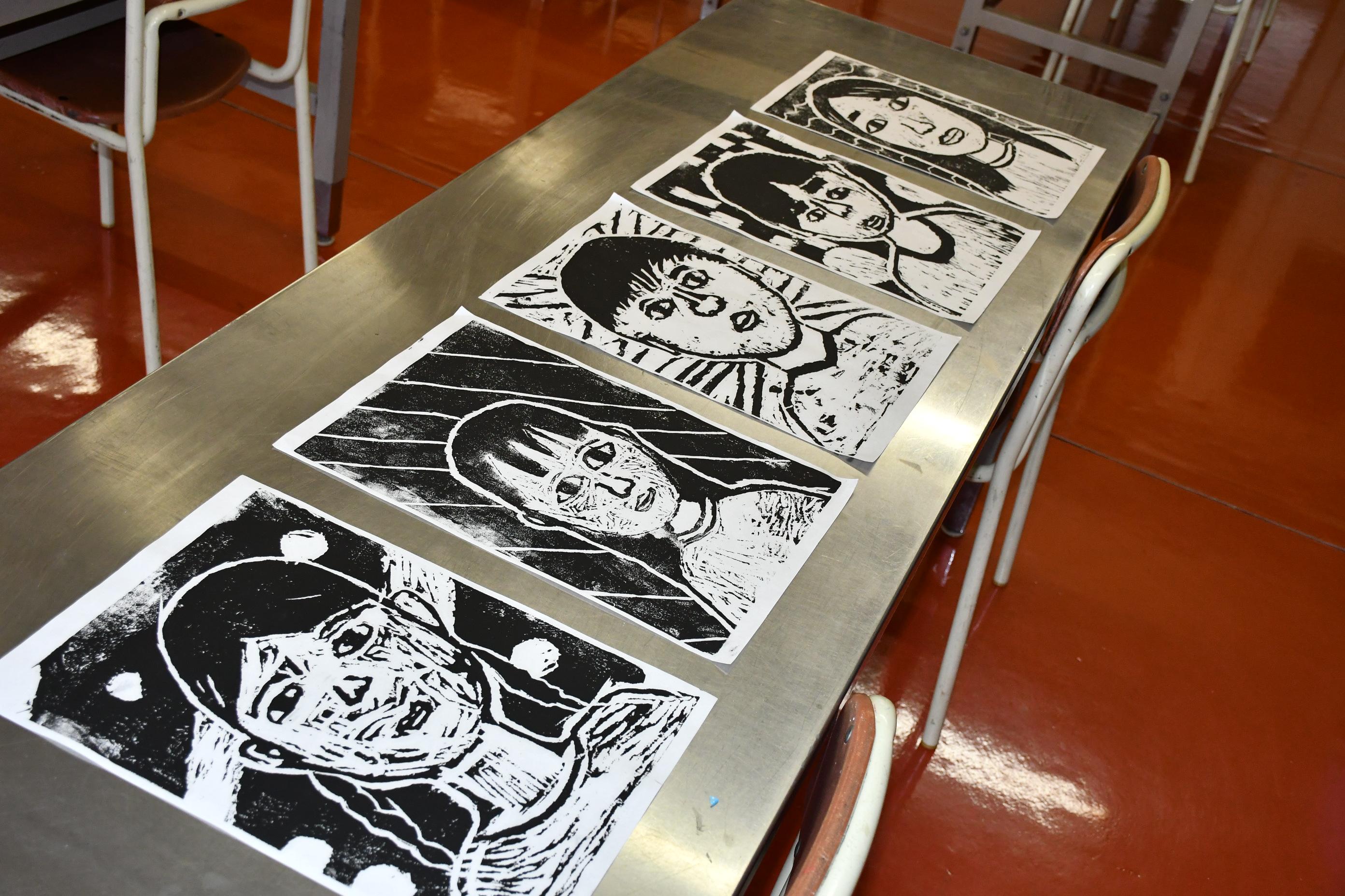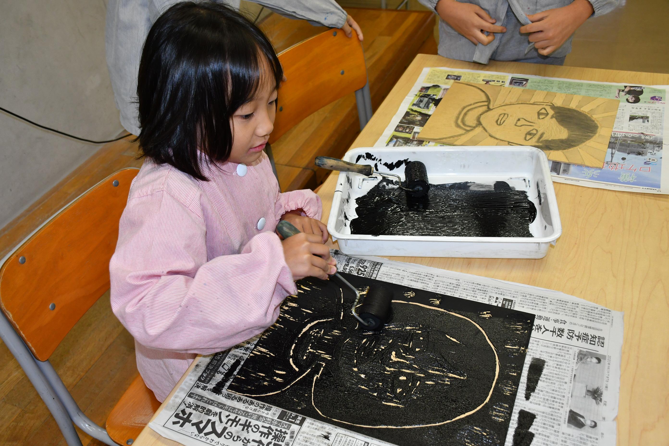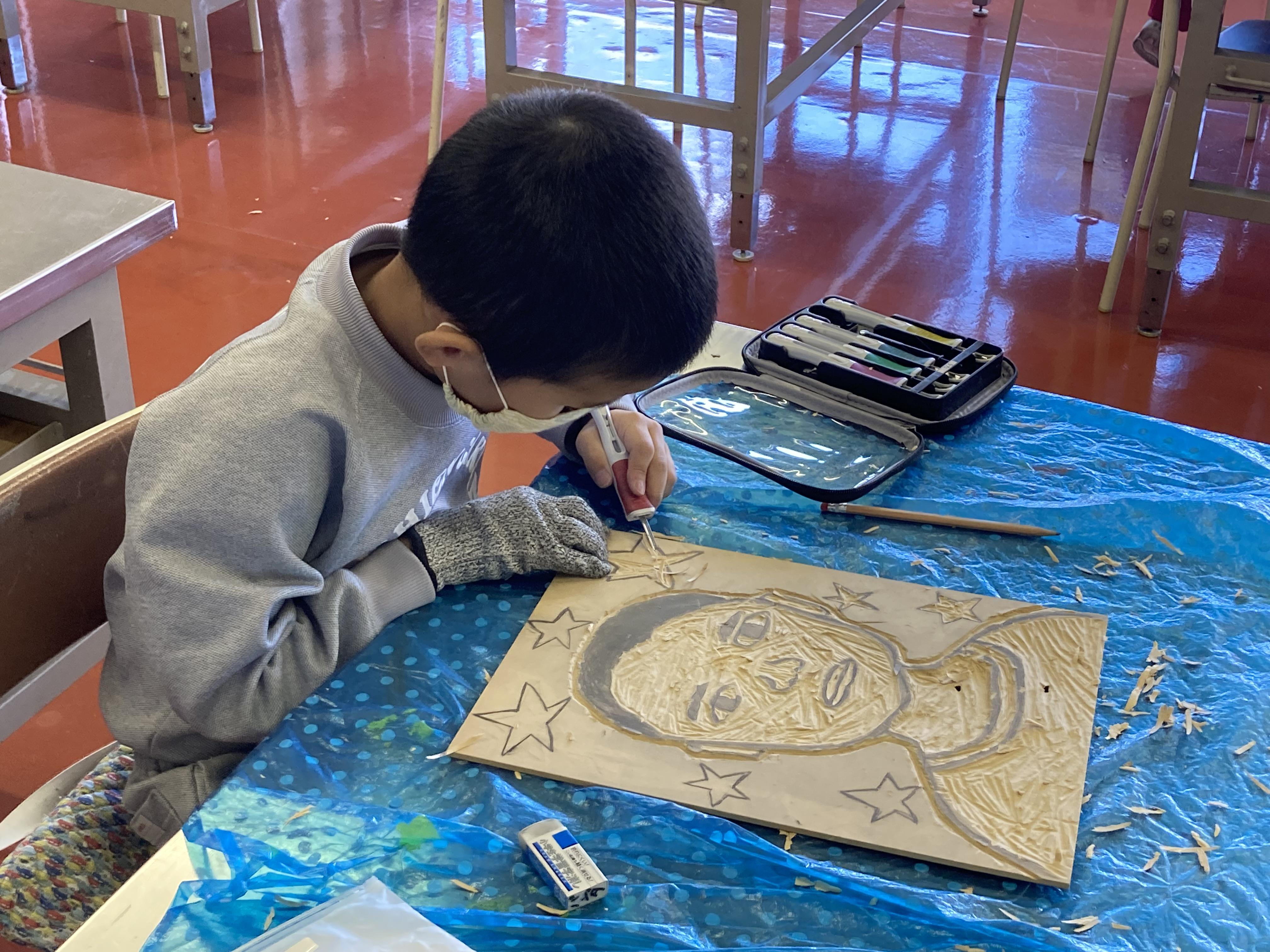 4年生は2学期より図工科で彫刻刀の学習を進めてきました。その集大成となる版画作品の制作に取り組みました。自らの顔を模写し、木版画に写し取って、彫刻刀で掘っていきます。丸刀や三角刀など合わせて5種類の彫刻刀にはそれぞれ特徴があり、考えながら掘っていく中で、子どもたちは徐々にコツをつかんだ様子でした。最後に、掘り終えた木版画にインクを付け、印刷をして完成です。完成した個性豊かな作品に、子どもたちは満足げな表情でした。