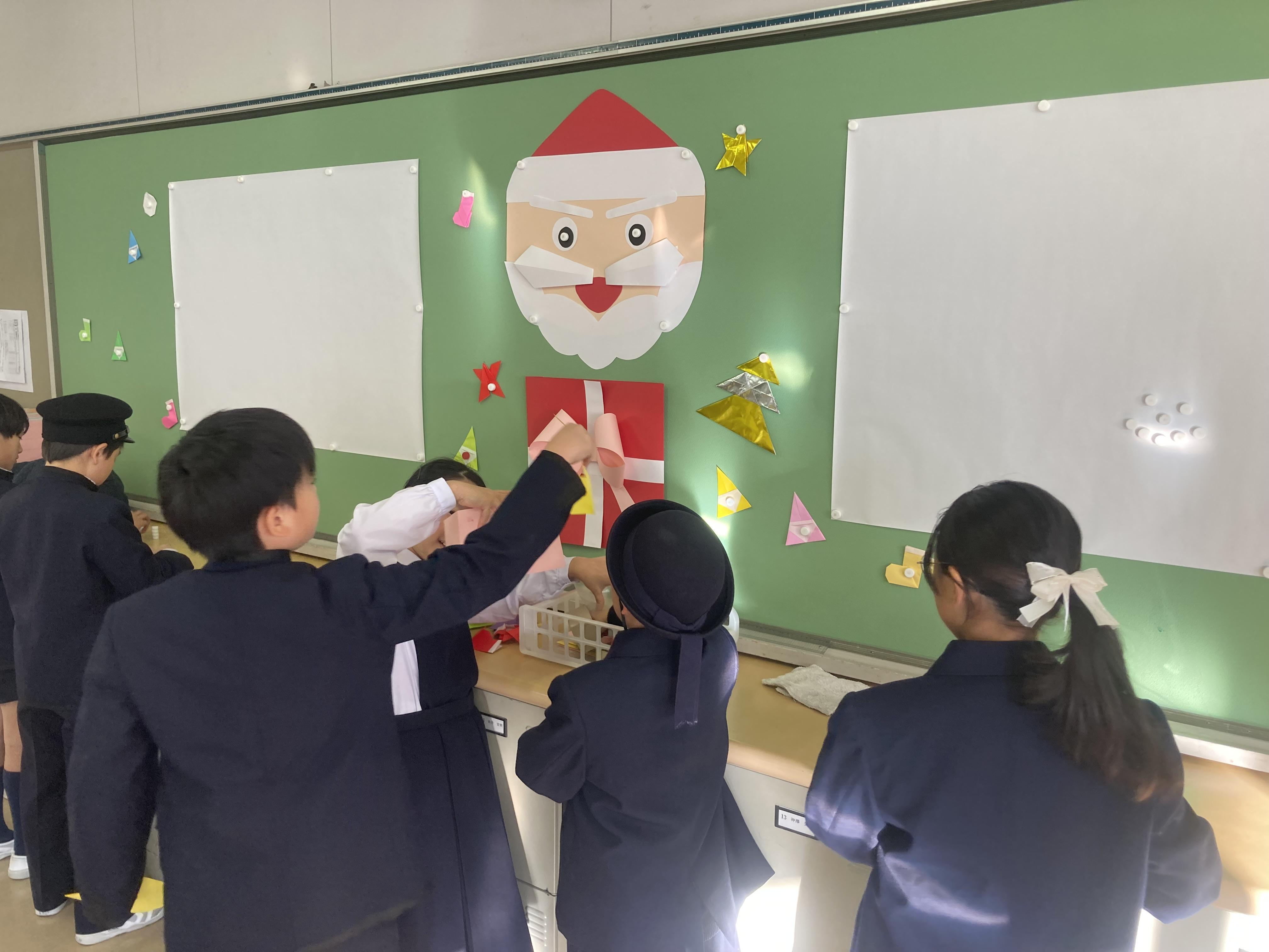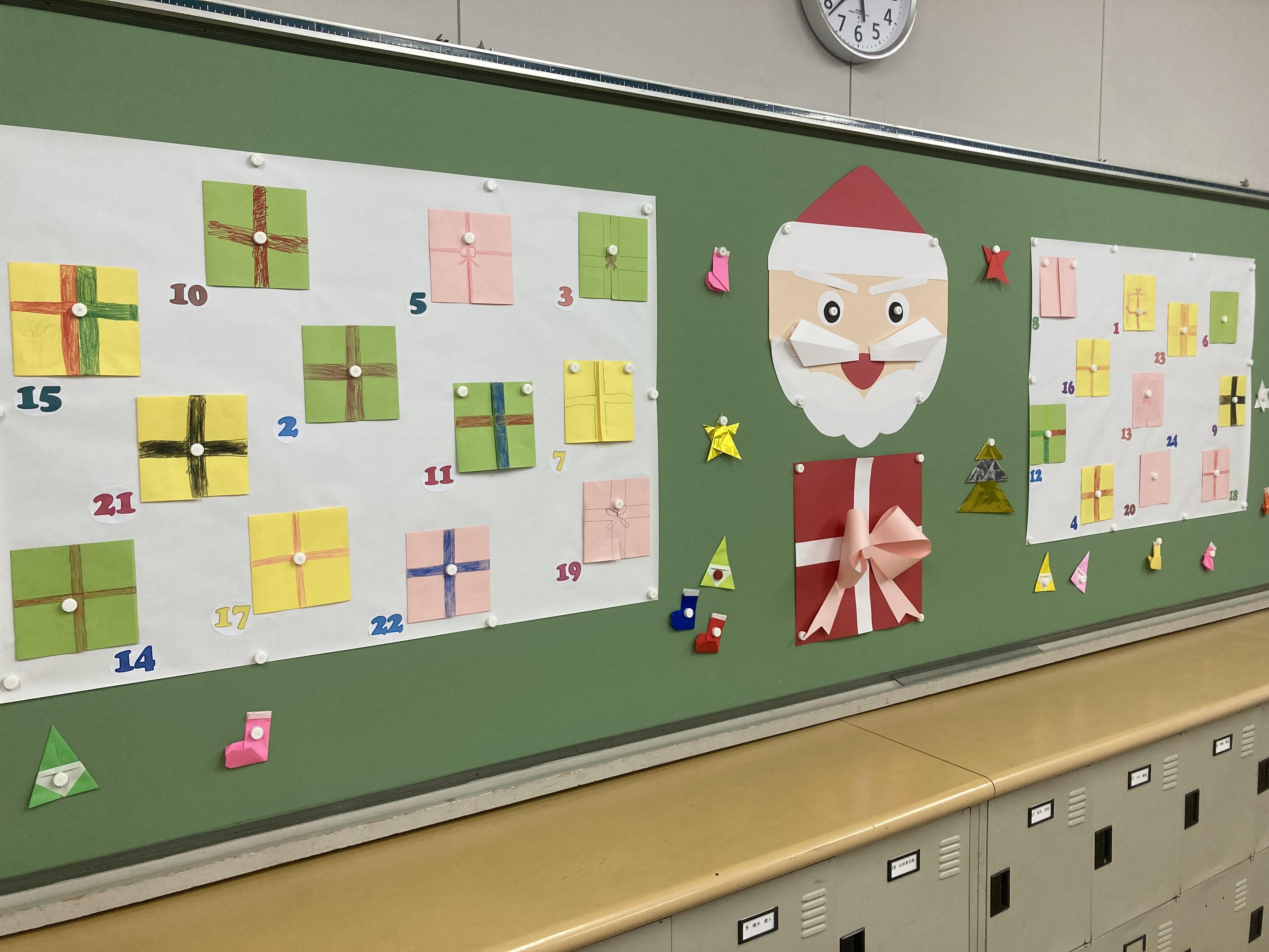 12月25日のクリスマスに向けて、4年生全員で1つのアドベントカレンダーを作りました。1人1人が好きなものの絵を台紙に描き、合計25個の作品を制作。折り紙で飾り付けも行いました。来月の1日から一つずつめくっていき、当日へカウントダウンをしていきます。今はまだ閉じていて、台紙の中身が何かは分かりません。さて、子ども達は何を描いたのか。毎日の楽しみがまた一つ増えました。