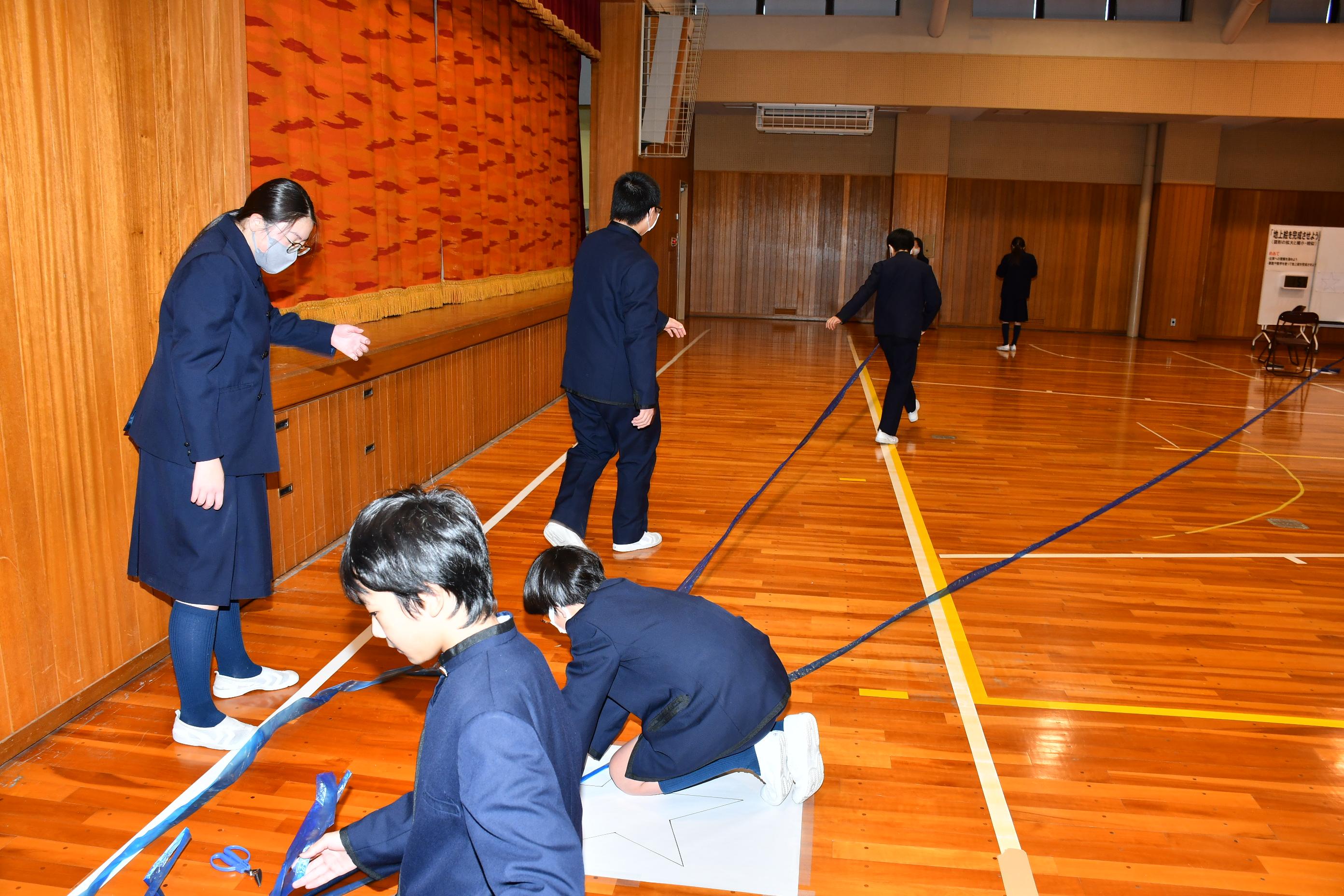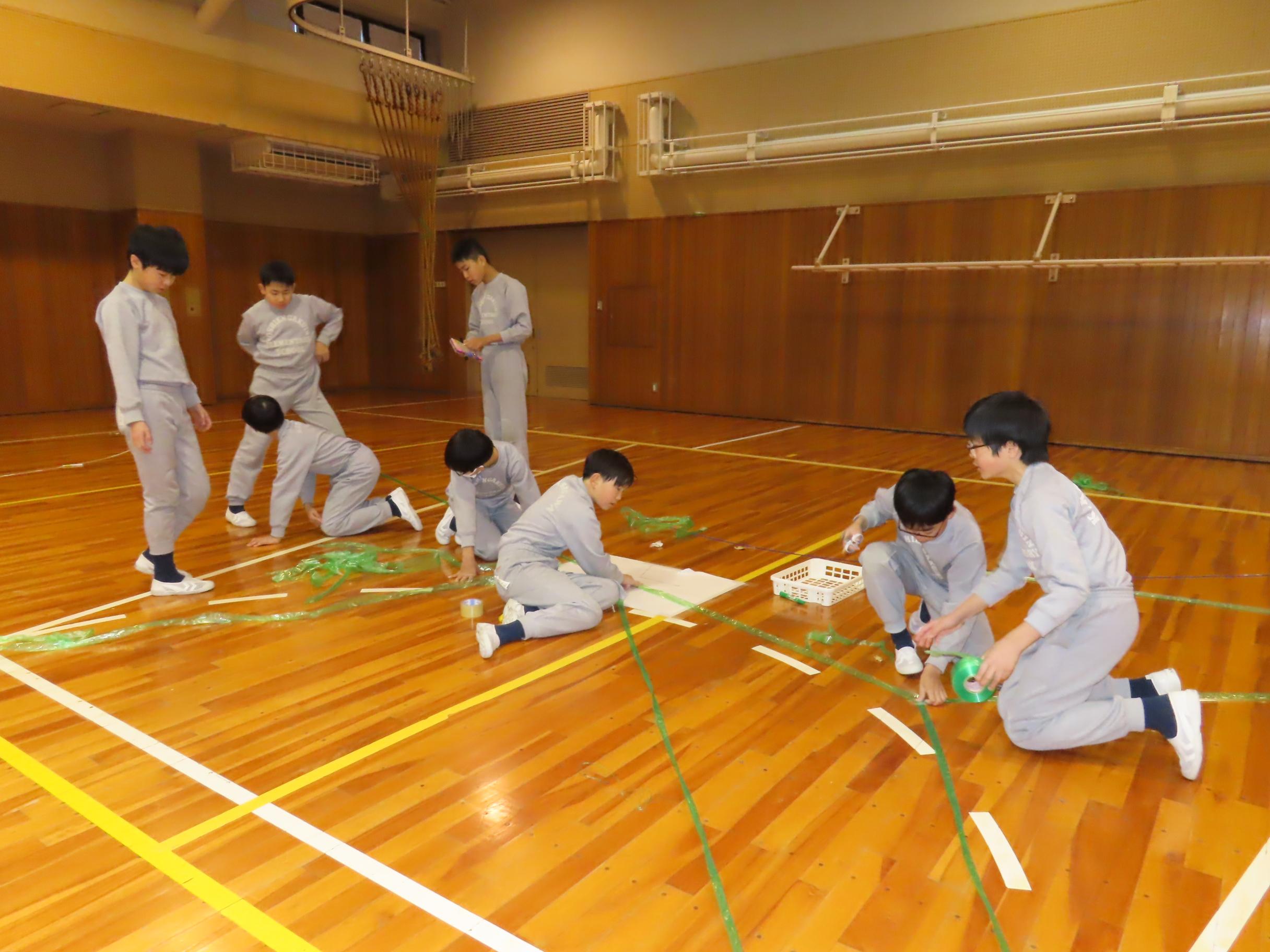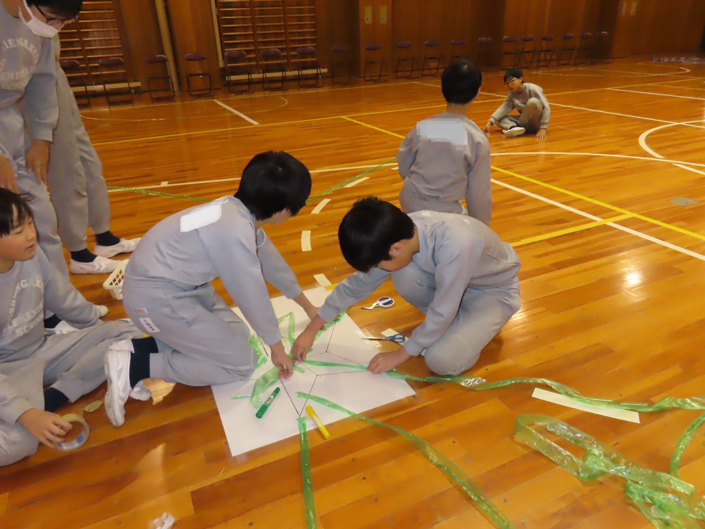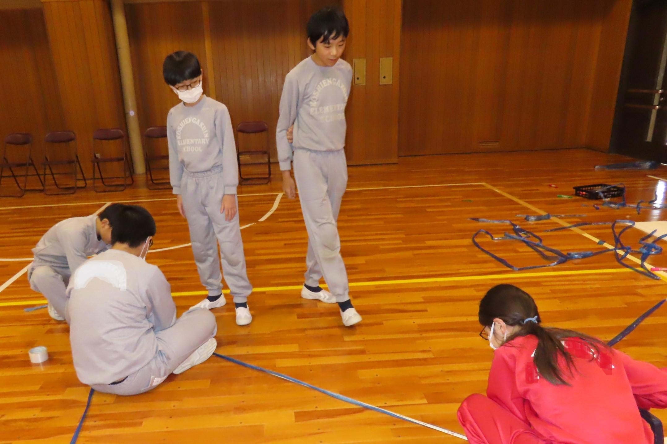 定規や分度器は使わず、ひもだけを使って、元の絵の15倍の大きさの星型を2チームで作成しました。