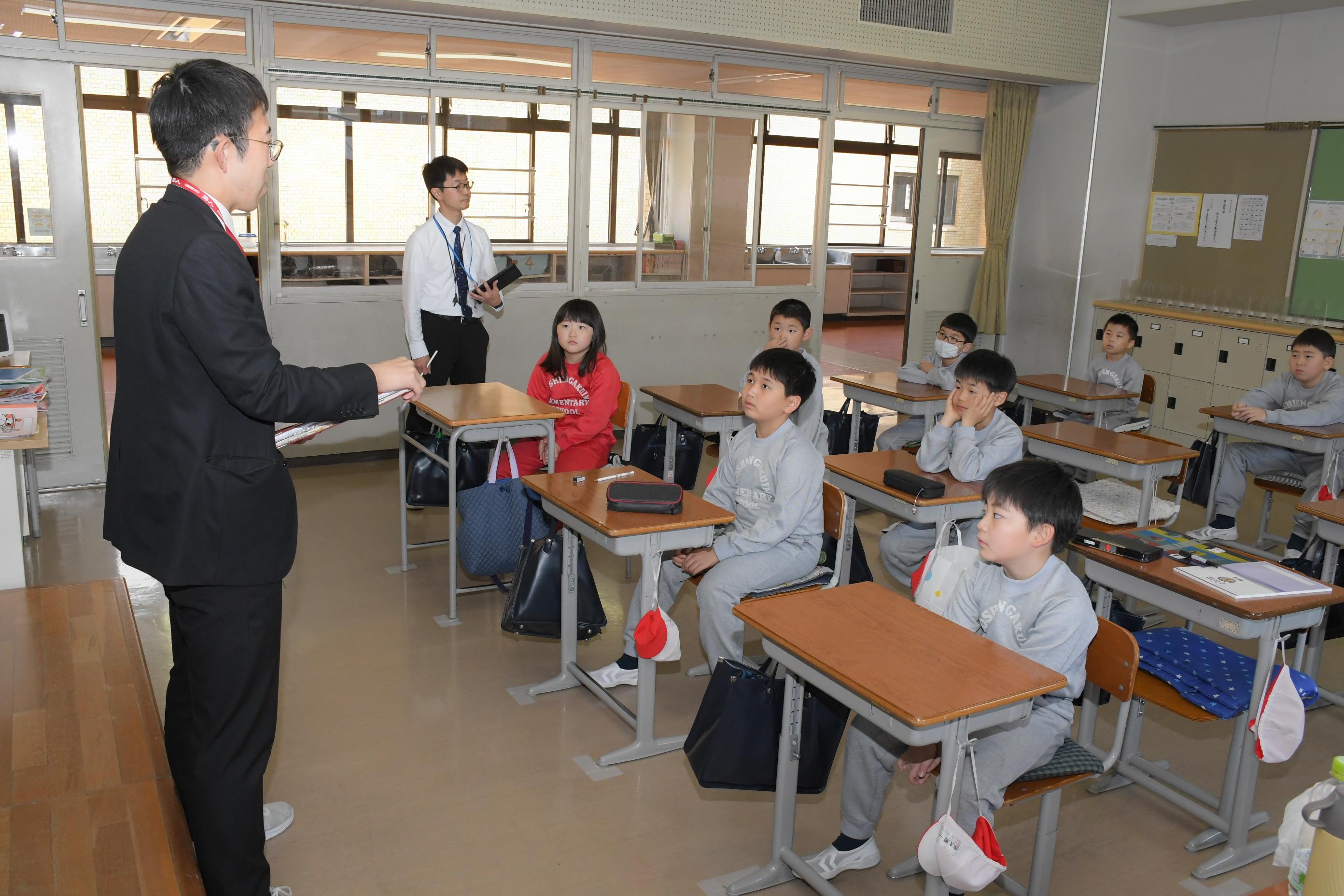 児童朝礼の後、下校指導を実施しました。徒歩や各公共交通機関別に分かれて、登下校中のマナーについて話を聞きました。