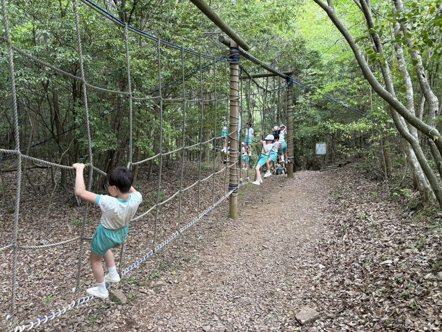 そして、午後はフィールドアスレチック。高学年が1年生の補助をして、個々に達成感を味わうことができました。