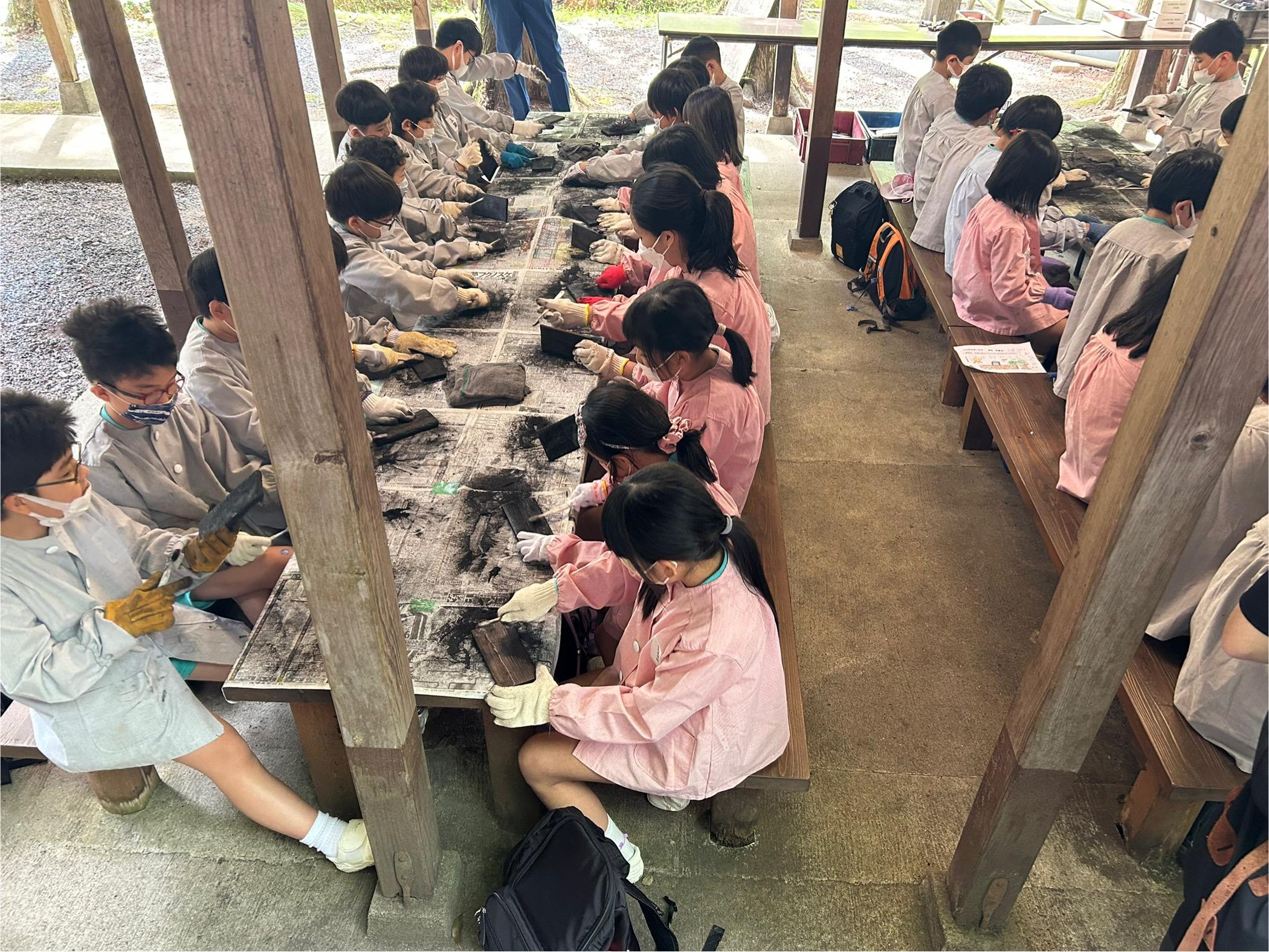 午前中は焼き板細工。しっかりと磨いた板の上に、それぞれの思いを絵や文字にして表現し、思い出に作品を制作しました。昼食は6年生が皆のために、美味しいカレーライスを作りました。