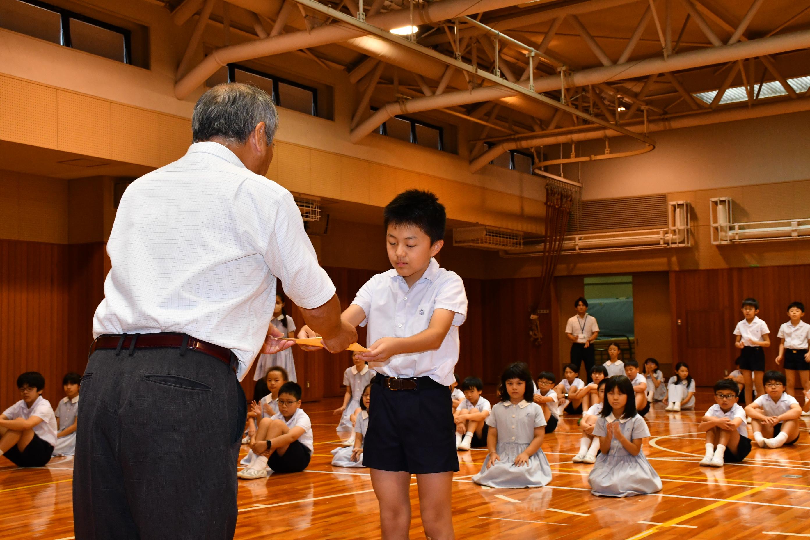 全校朝礼で校長先生のお話を聞き、本校で取り入れている速読解力検定の表彰を行いました。