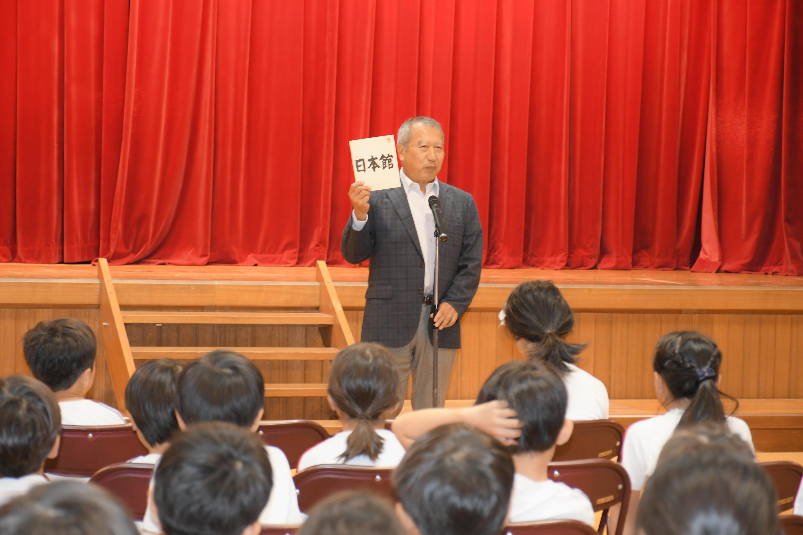 その後、校長先生から1970年の大阪万博のパンフレットに書かれていた未来の世界が実現されつつあること、また今回の大阪・関西万博の各パビリオンで紹介されたさらに未来の社会の実現に向けて、貢献できる人になってほしいと話がありました。