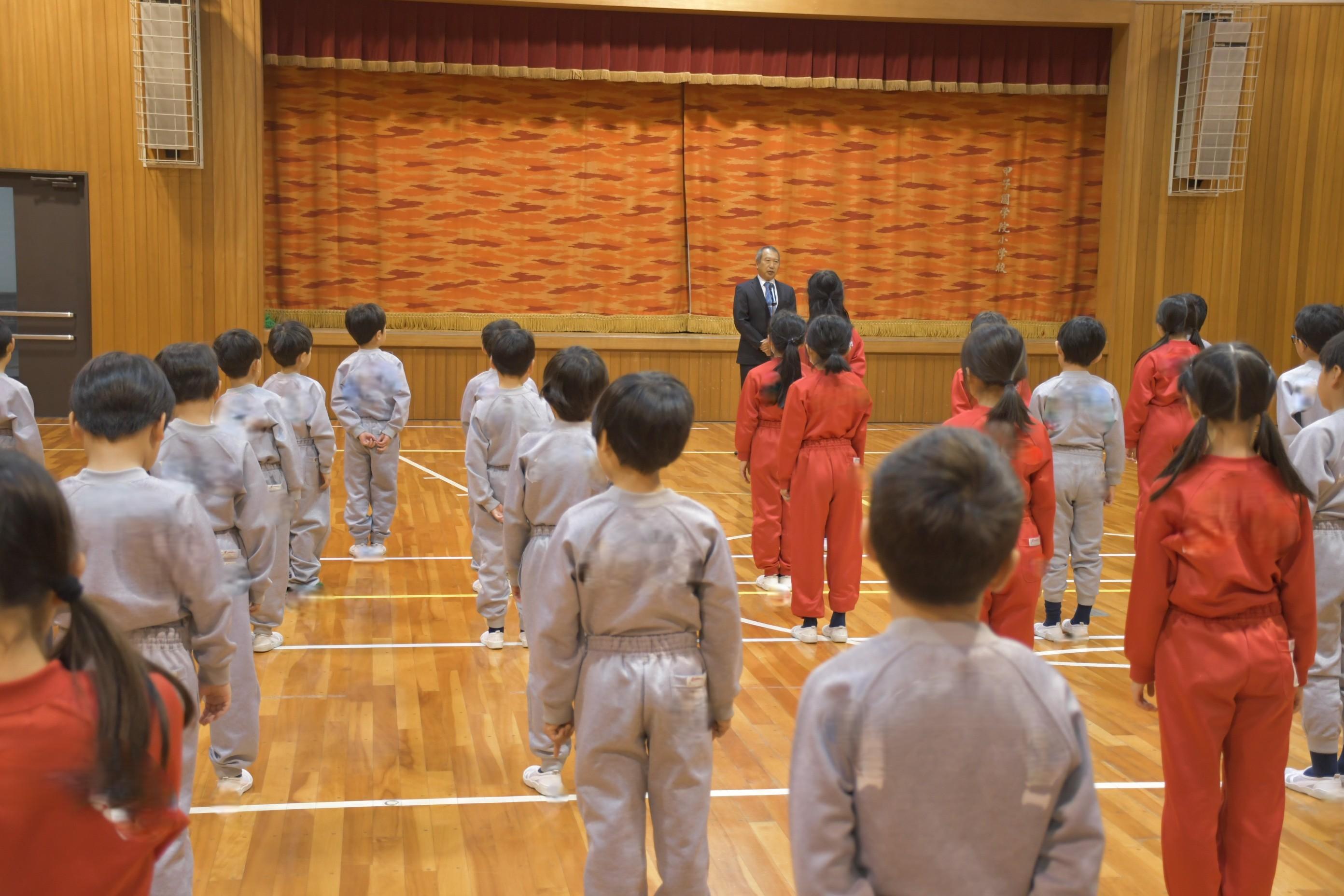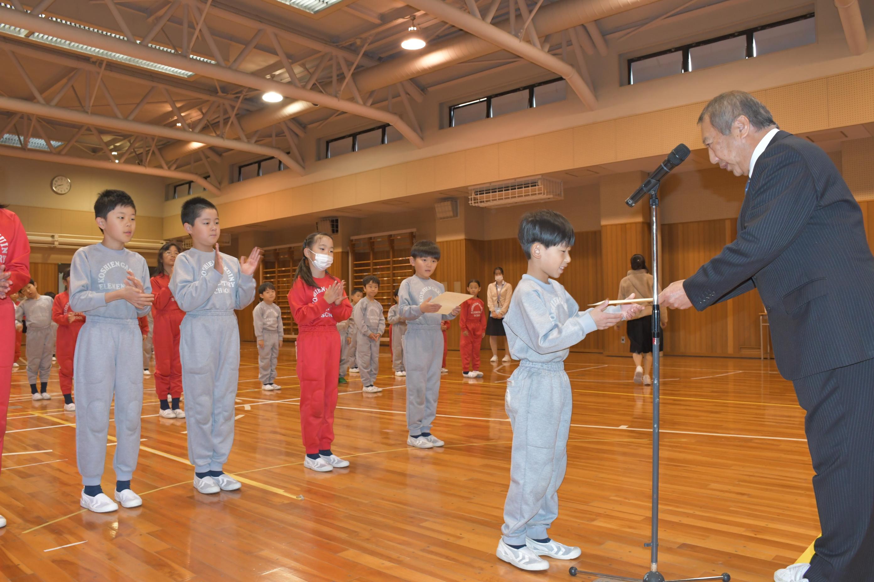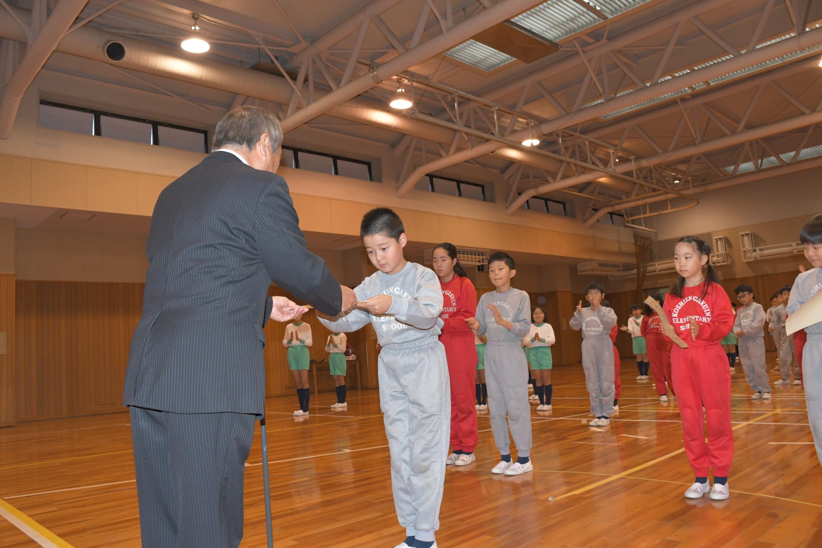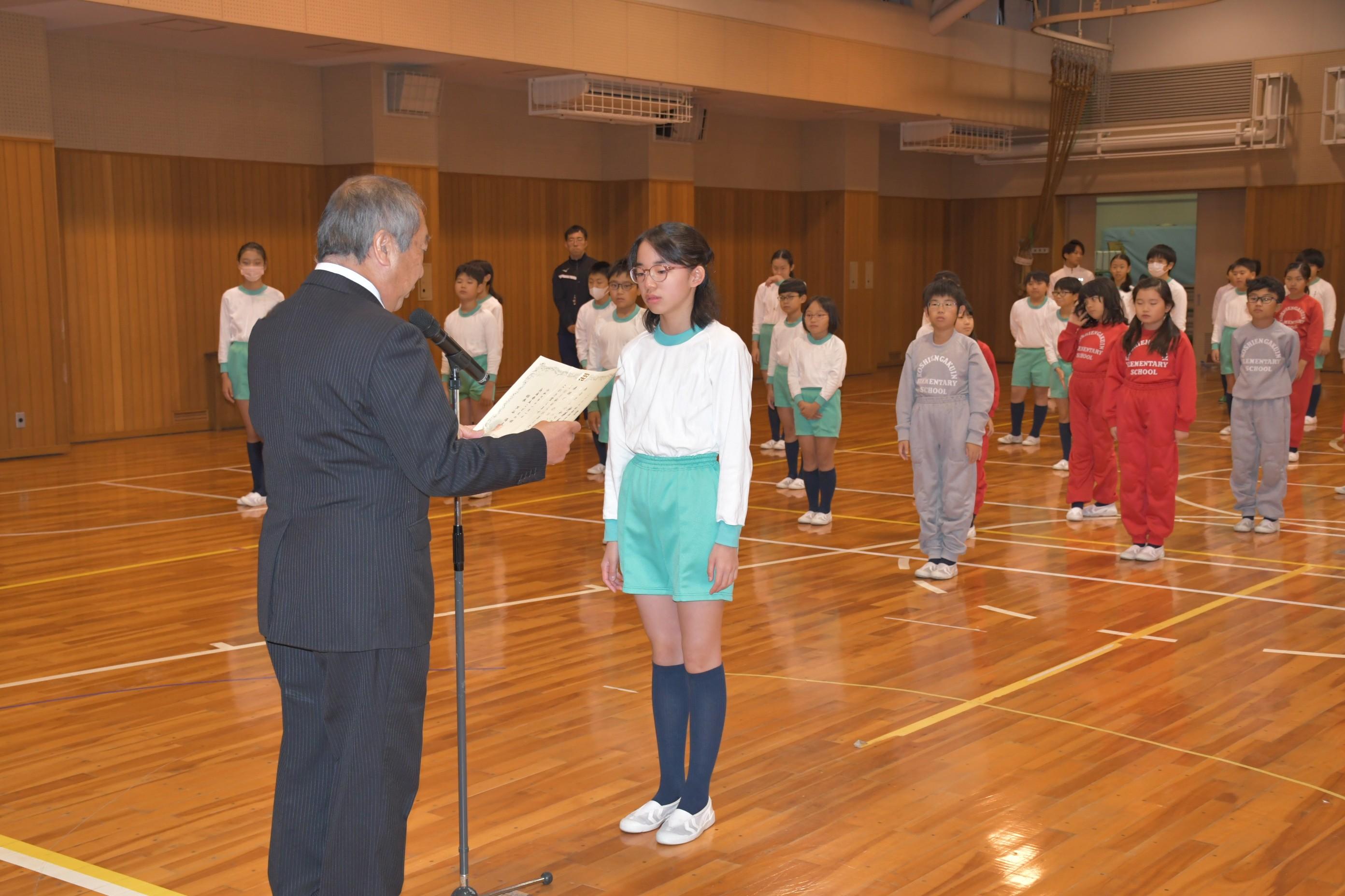 児童朝礼にて、2学期に実施した速読解力検定と校外で取り組んだ朗読コンクールの表彰を行いました。その後、校長先生から国際交流の振り返りと文房具など物の貸し借りについてのお話がありました。