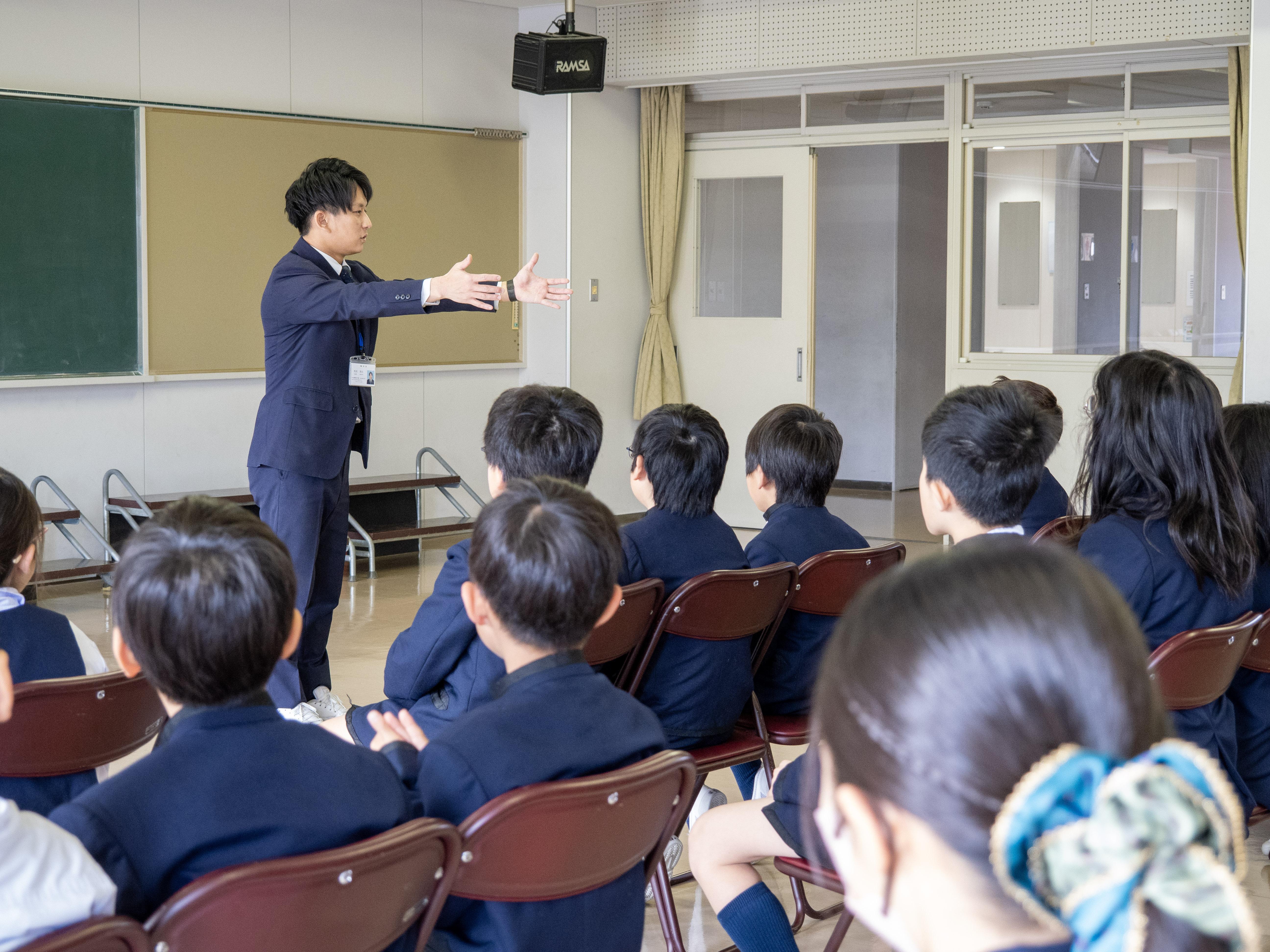 児童朝礼の後、下校指導を実施しました。徒歩や各公共交通機関別に分かれて、登下校中のマナーについて話を聞きました。