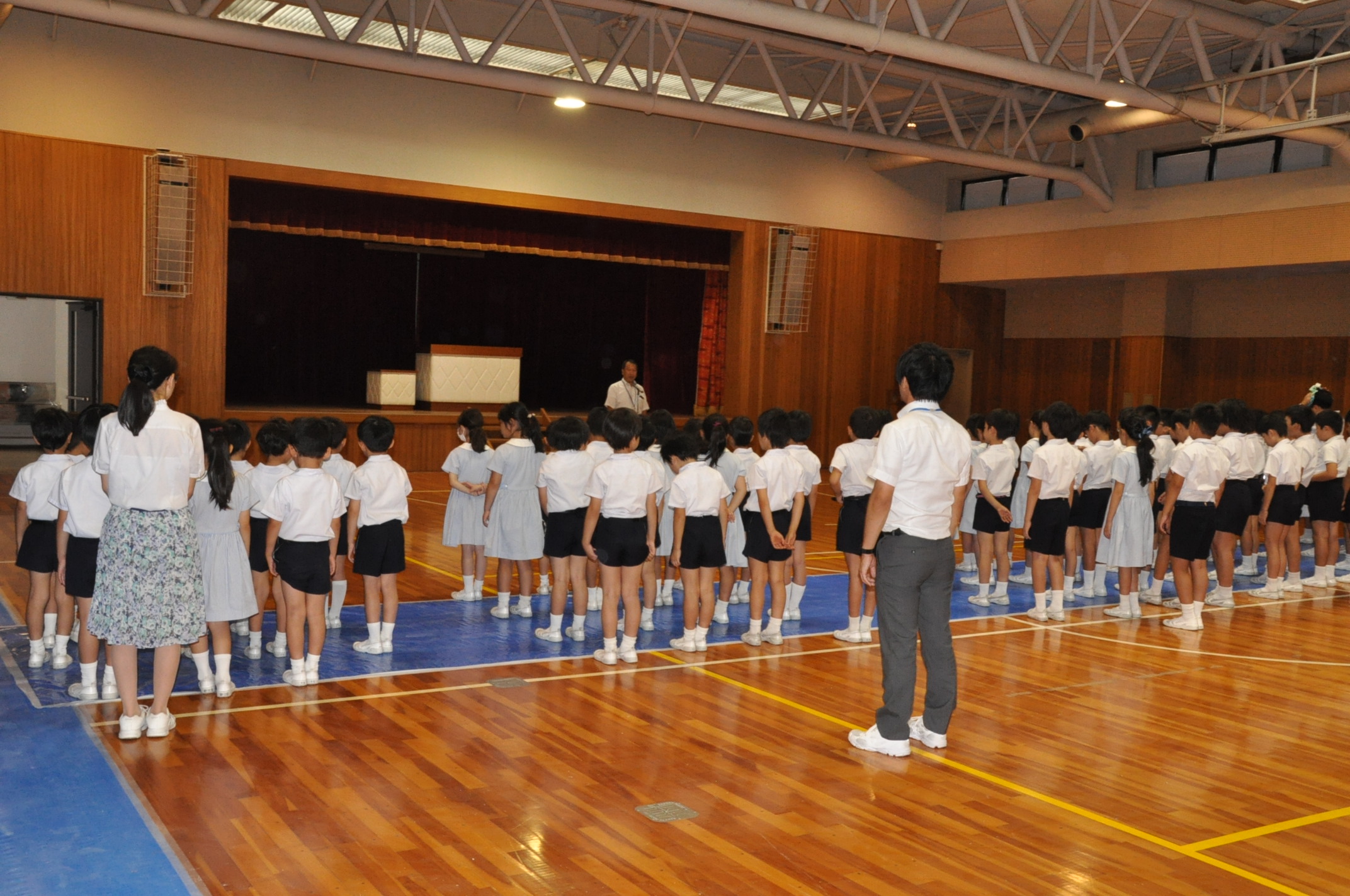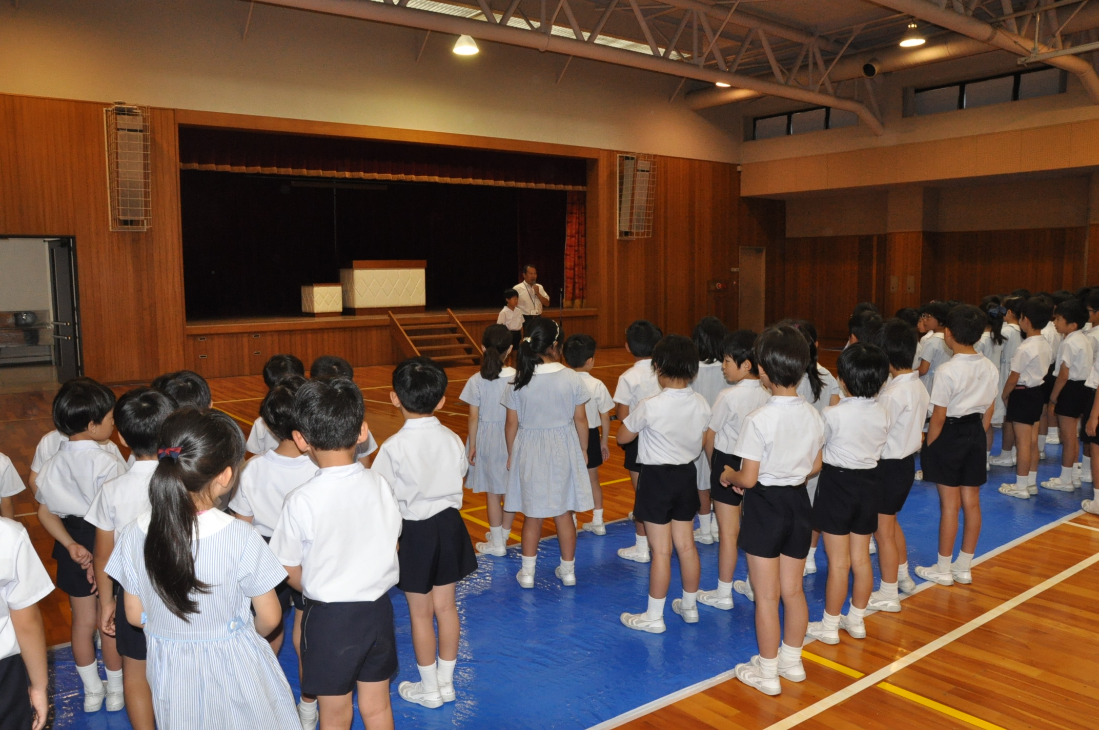 今日は全校登校日でした。まず、全校朝礼で校長先生のお話を聞きました。そして、8月からの転入生の紹介をしました。