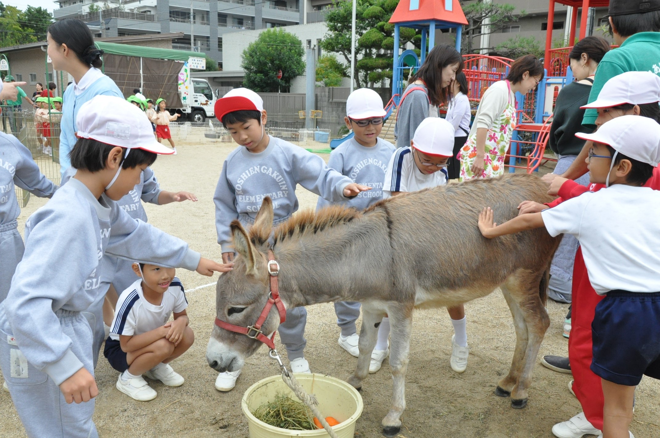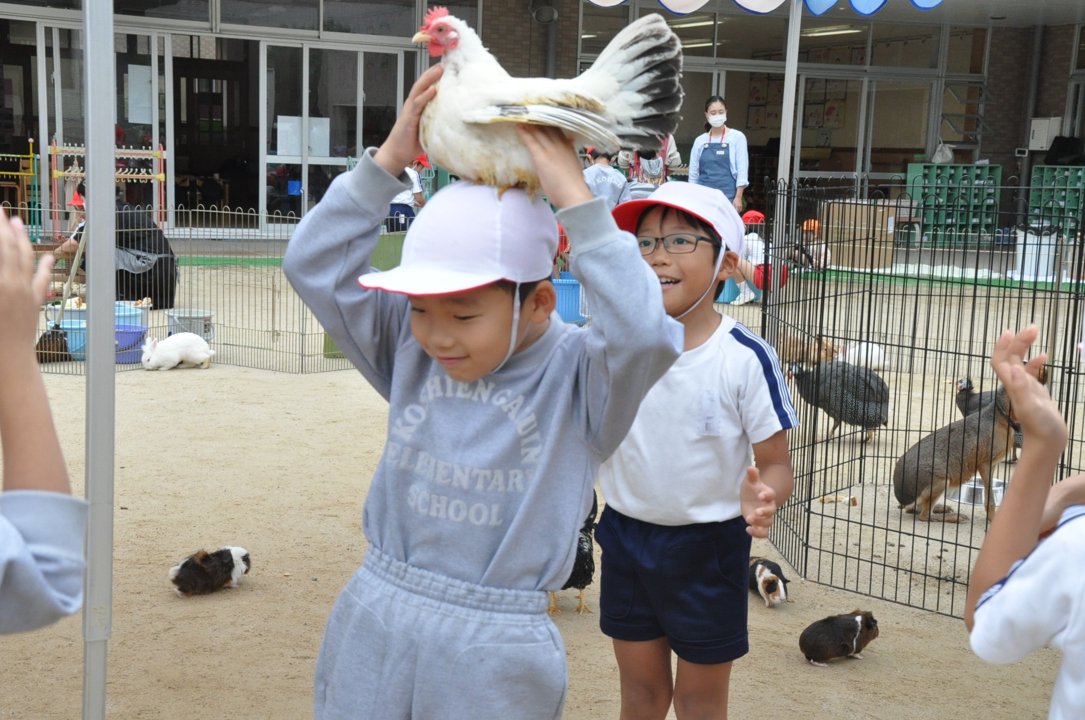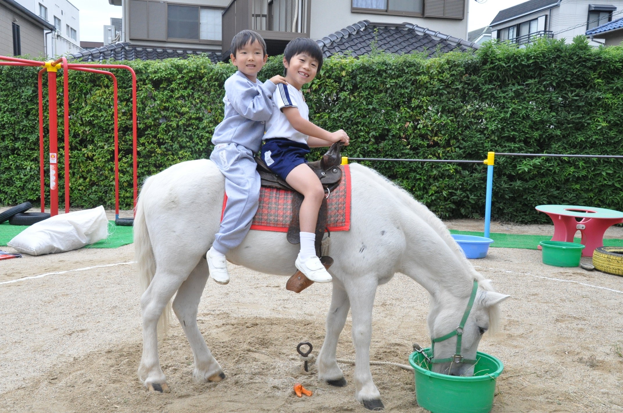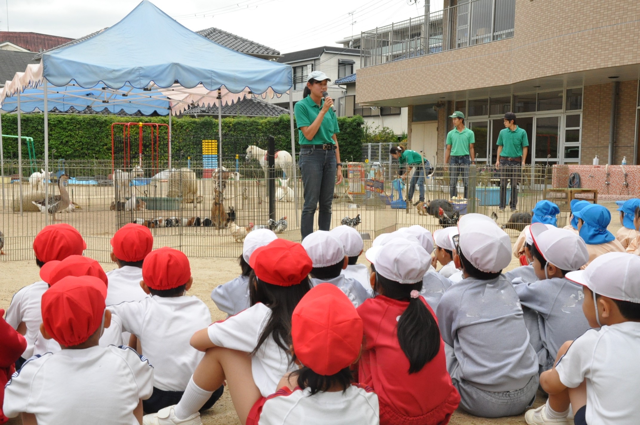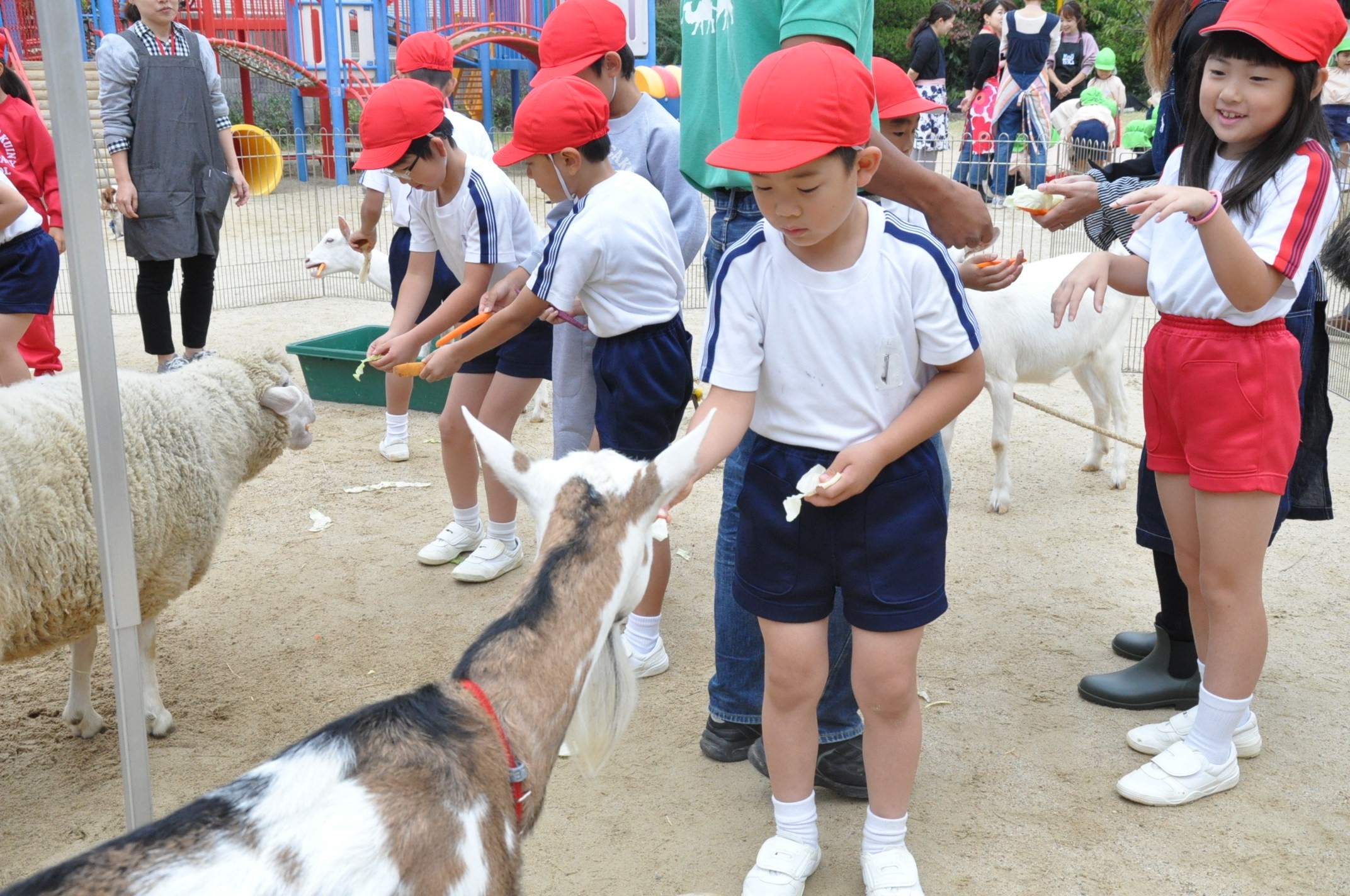 1・2年生 ふれあい動物村[投稿日:2019年10月24日] 学院幼稚園の園庭にて、ふれあい動物村を開催しました。ポニーに乗ったり、ヤギやウサギにえさを与えたりする等、たくさんのかわいい動物と触れ合いました。 一覧へ戻る