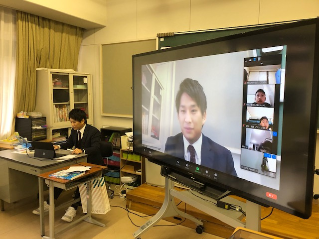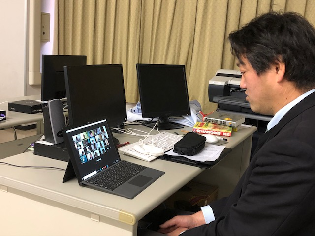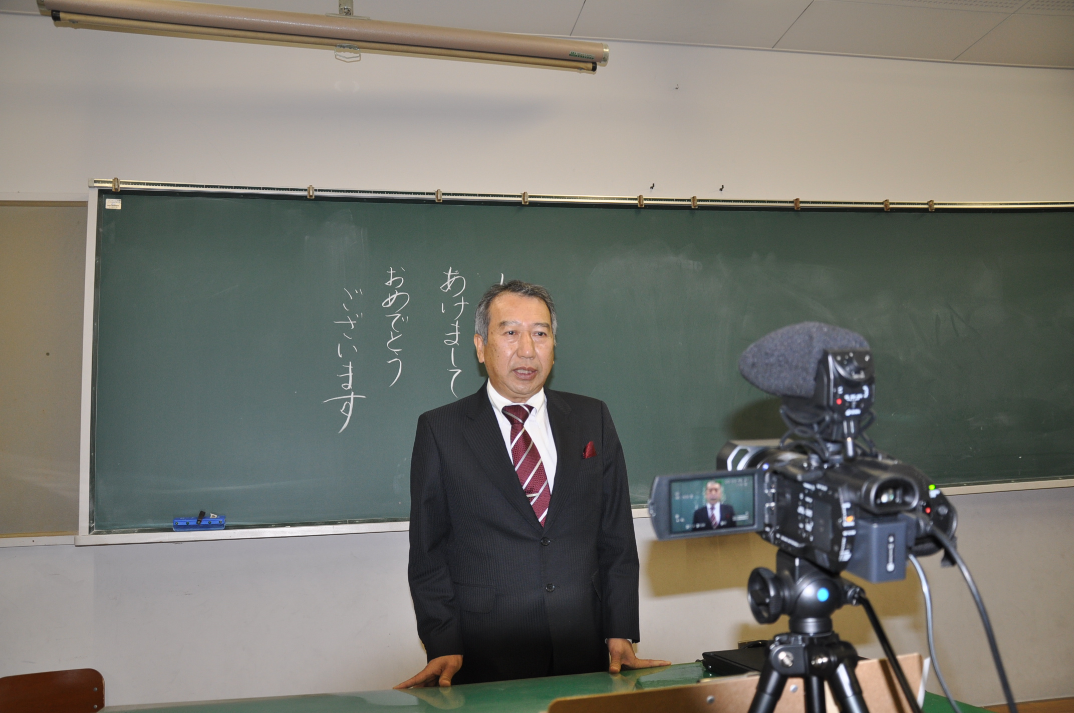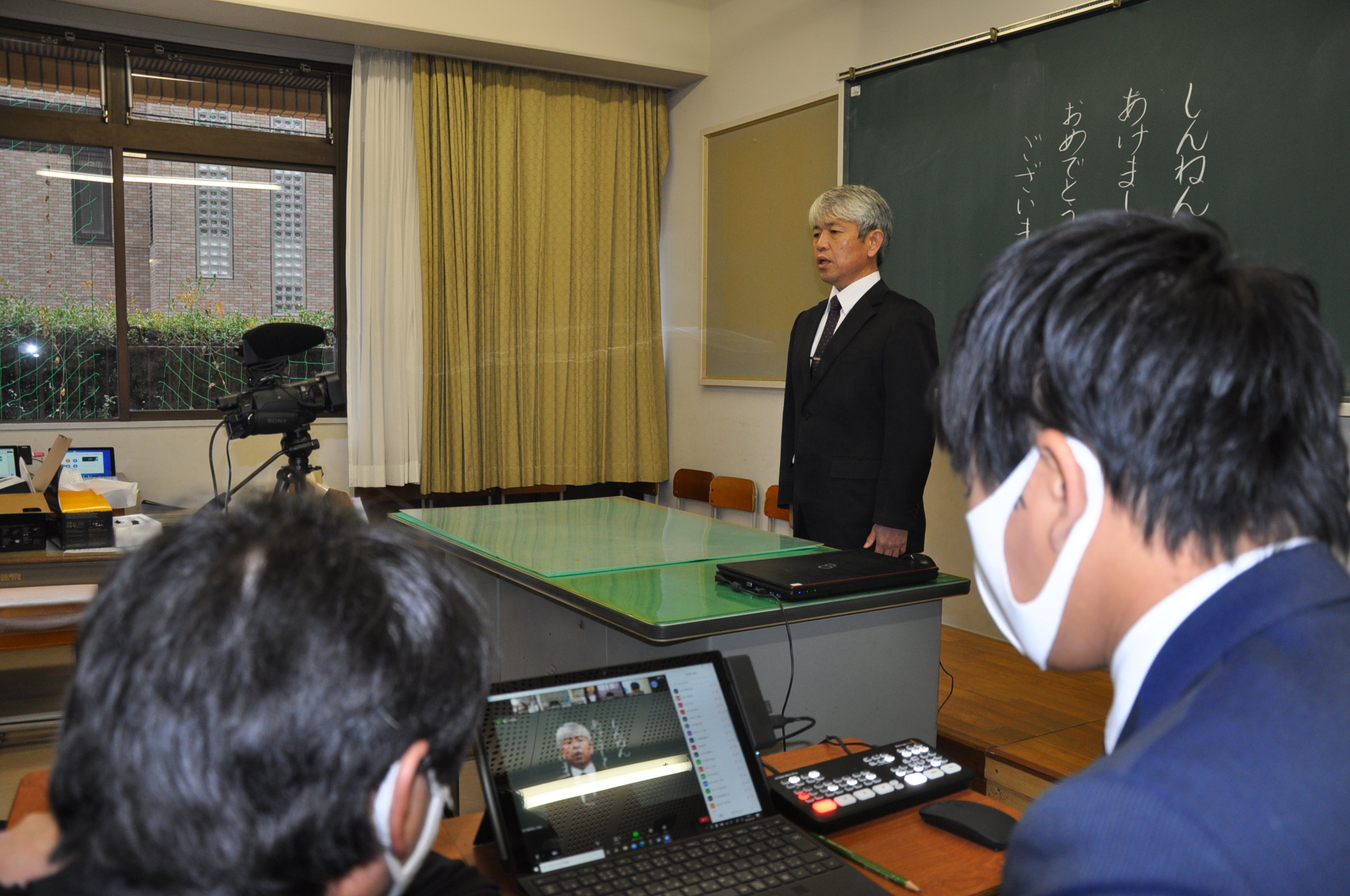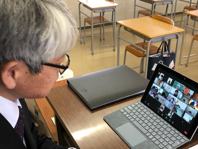 本日は、朝から暴風雪警報が発令されていたため、オンラインで始業式と各学級での朝礼を行いました。本日の始業式は、新しく導入した機材を用いて実施しました。