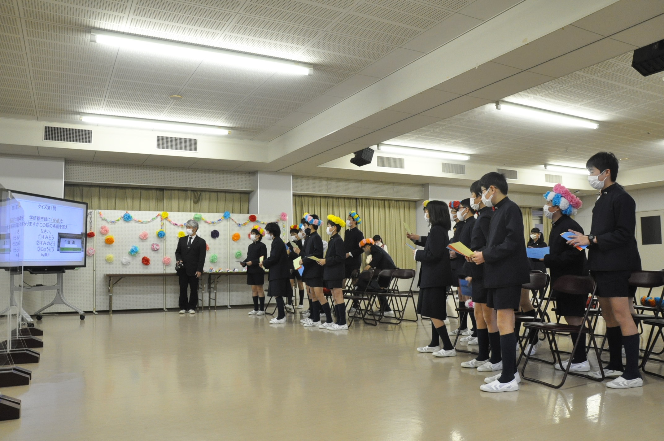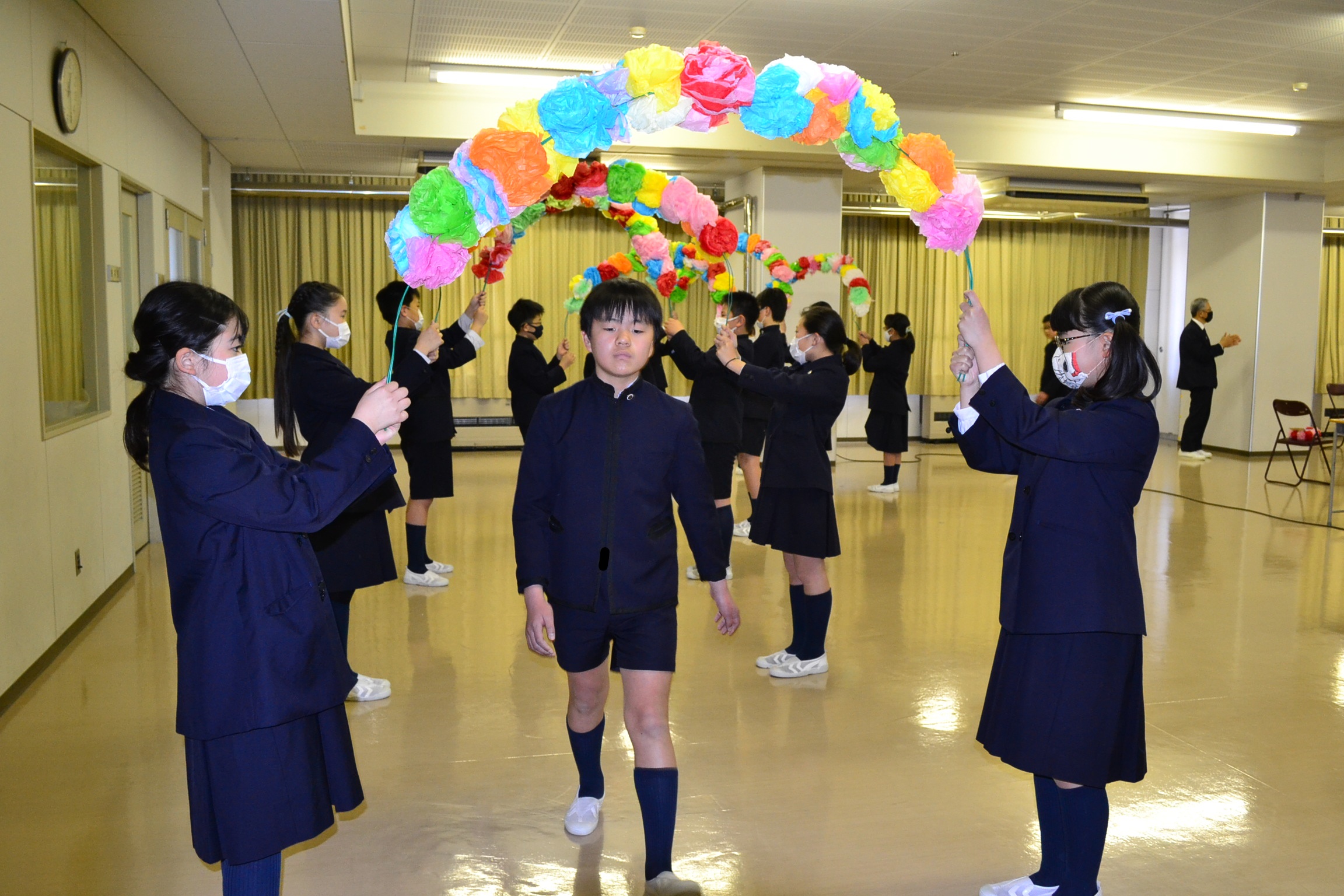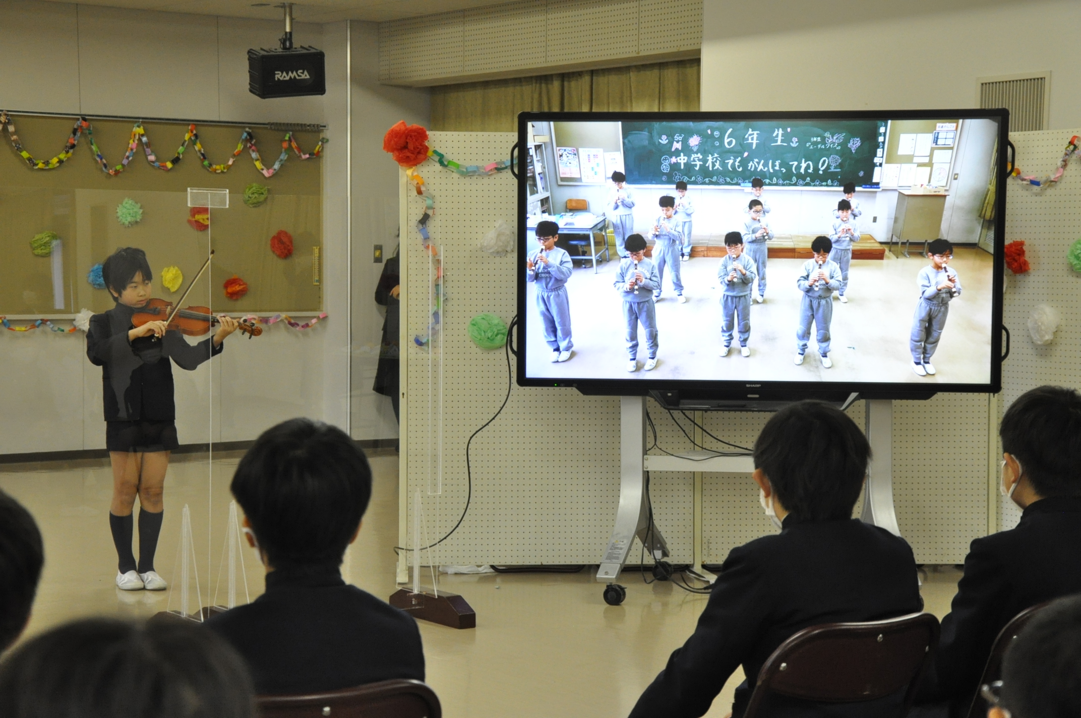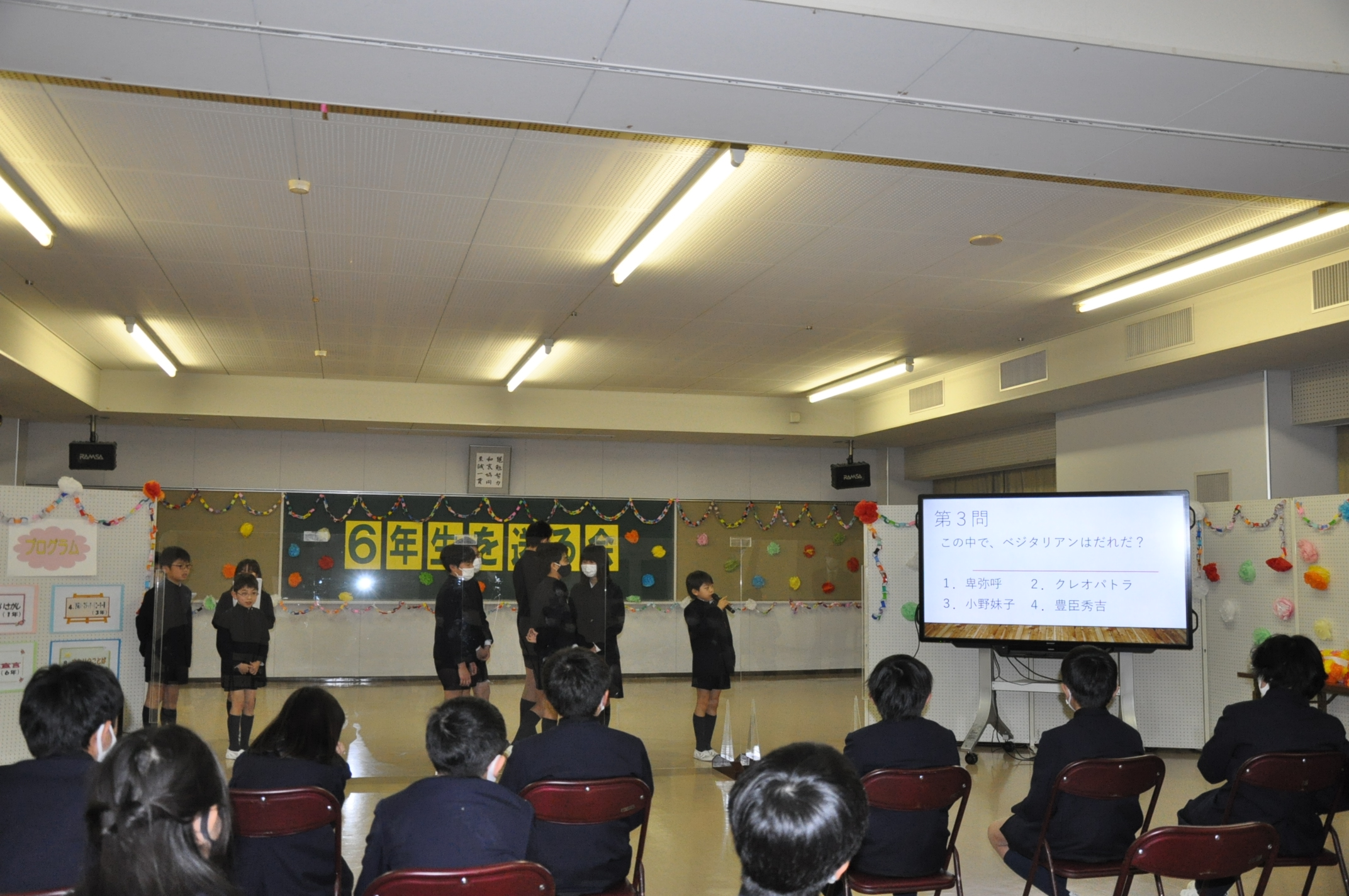 「6年生を送る会」を行いました。学年ごとに出し物を考え、6年生に披露しました。クイズやダンス、プレゼントの贈呈、プログラミングを使って作成したスライドショーなど、さまざまなもので会を盛り上げました。笑顔で楽しむ6年生の姿が印象的でした。新型コロナウイルス感染症対策から、アクリル板を設置。また、保護者の皆様にはオンラインでご参観いただきました。