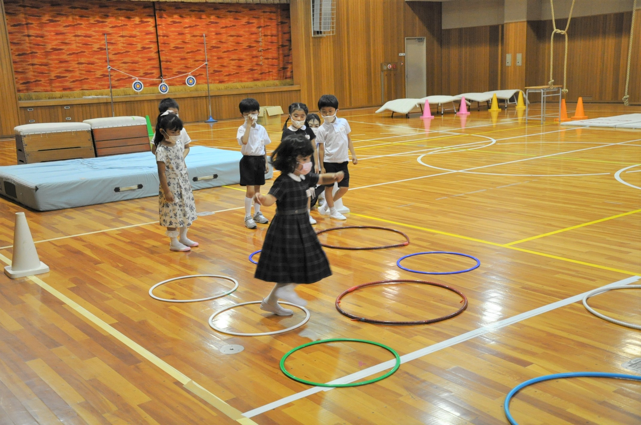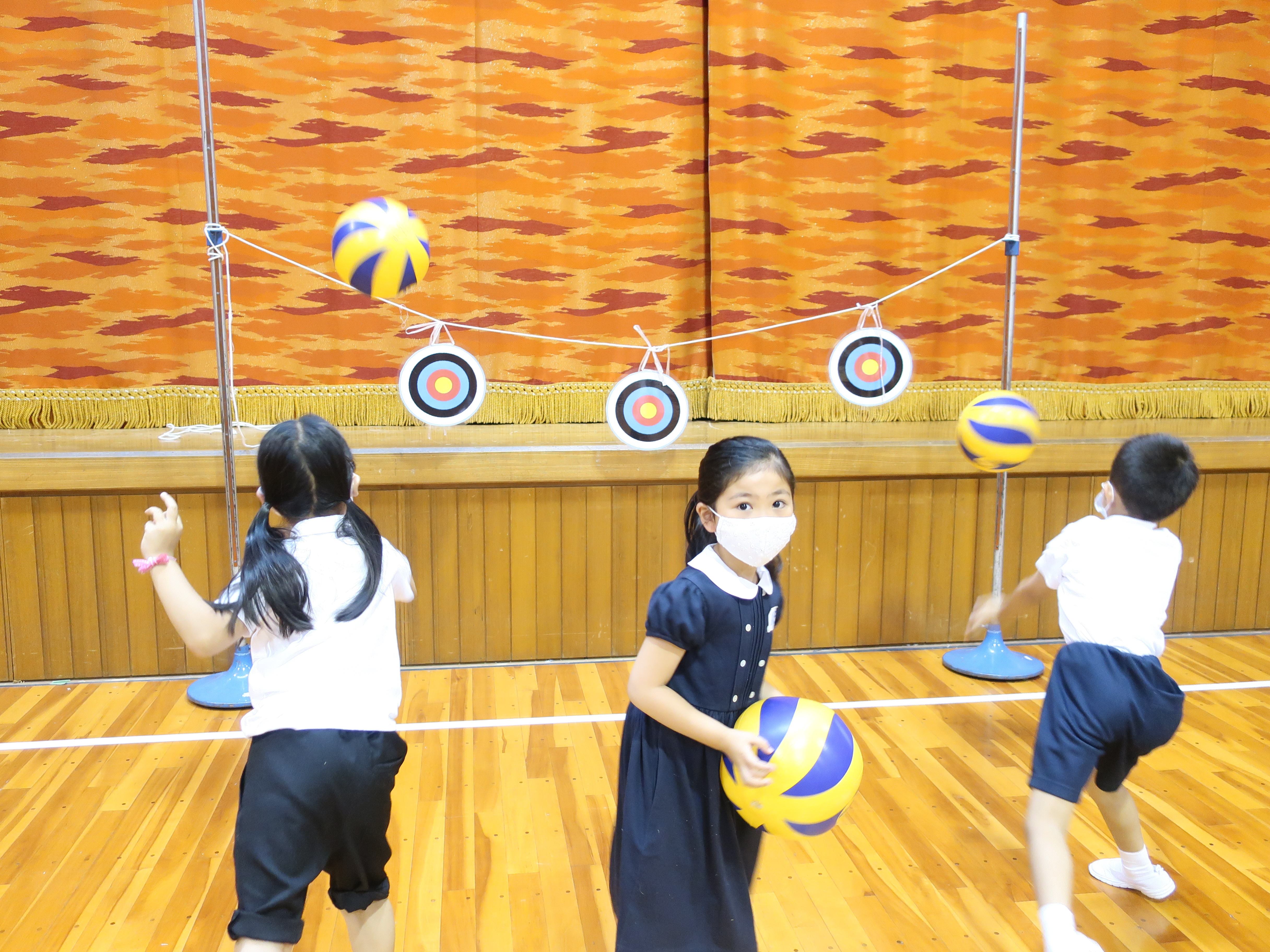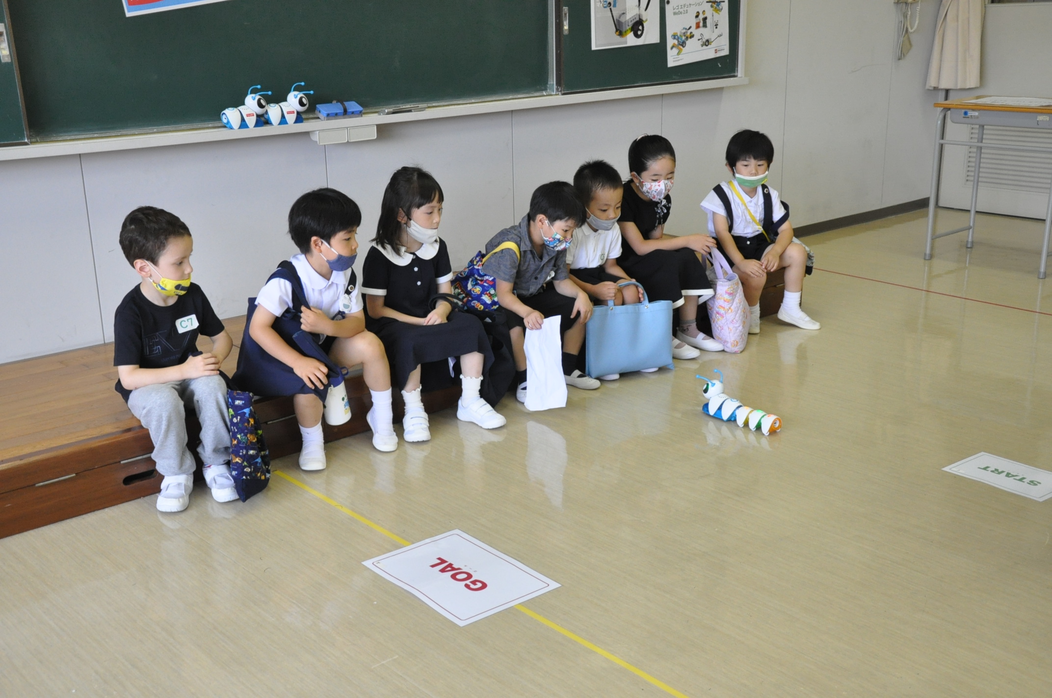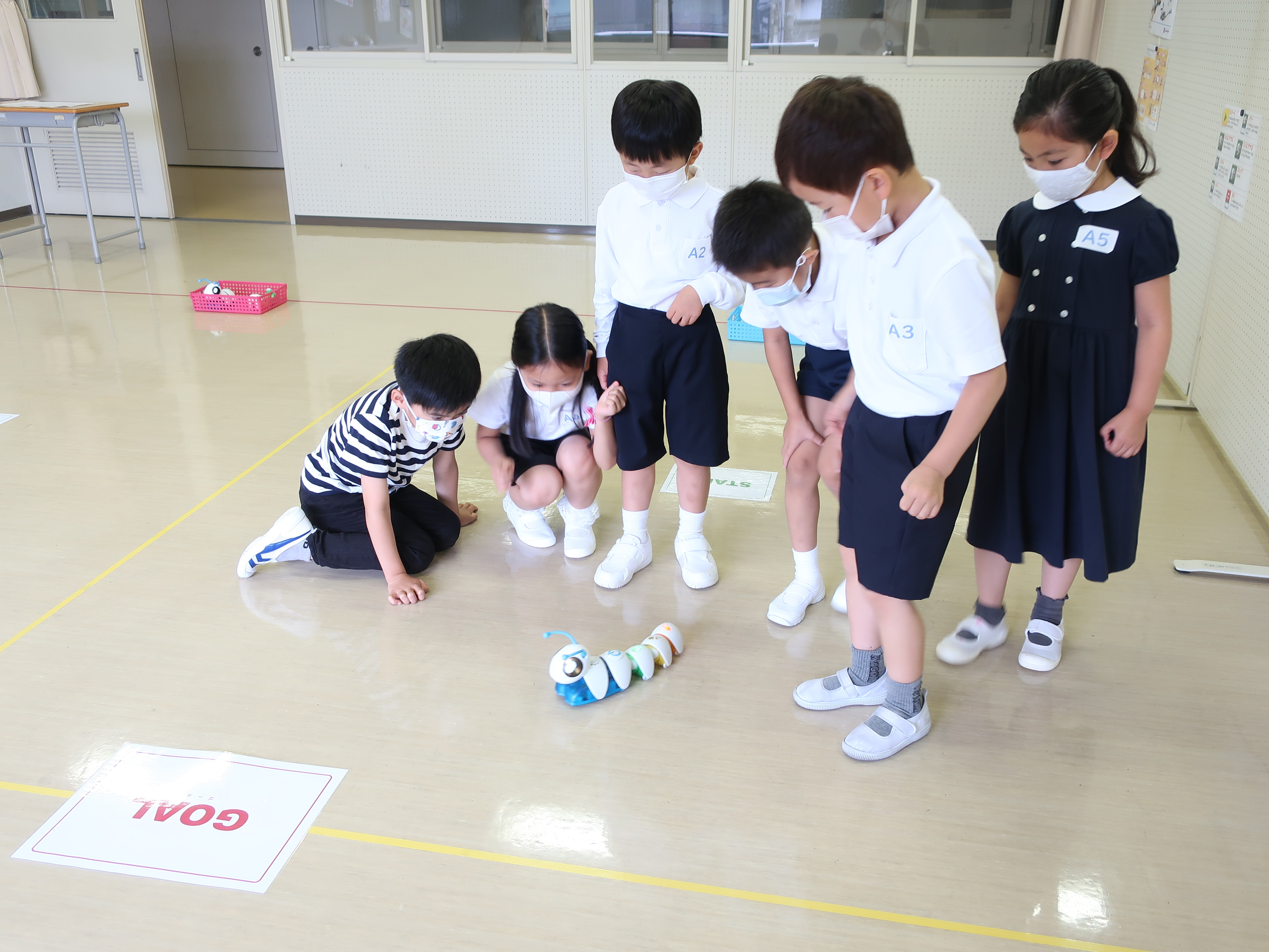 学校探検で校内のいろいろな教室でチャレンジをしました。園児たちは楽しみながら、アスレチックや図工、プログラミング学習を体験しました。
